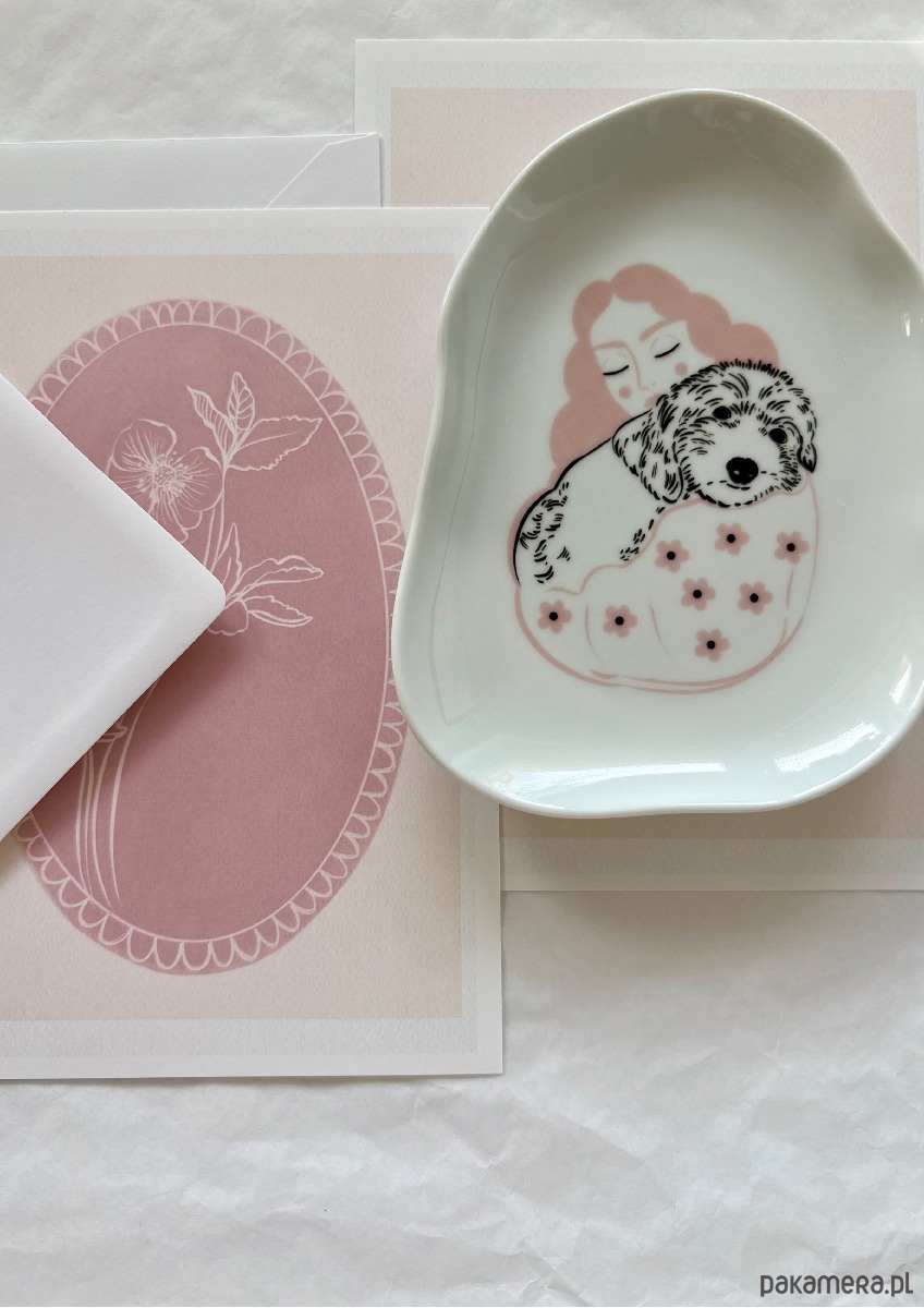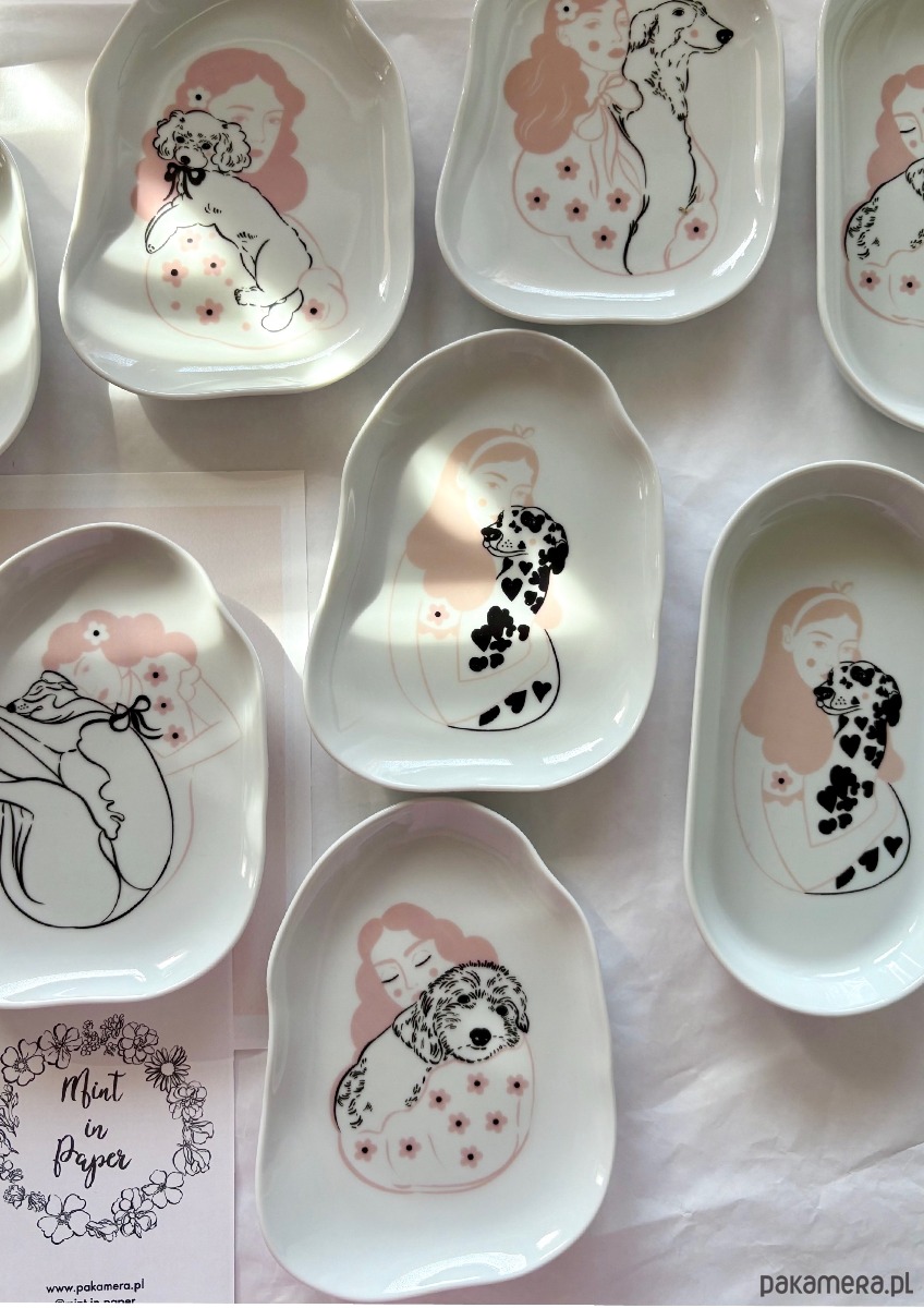 Biały porcelanowy spodek ozdobiony autorską dziewczyny z pieskiem.