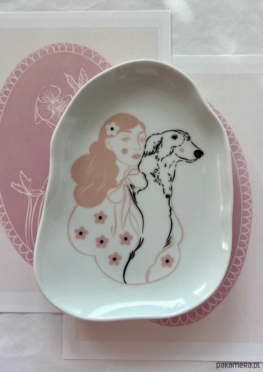 Biały porcelanowy spodek ozdobiony autorską ilustracją dziewczyny z pieskiem.