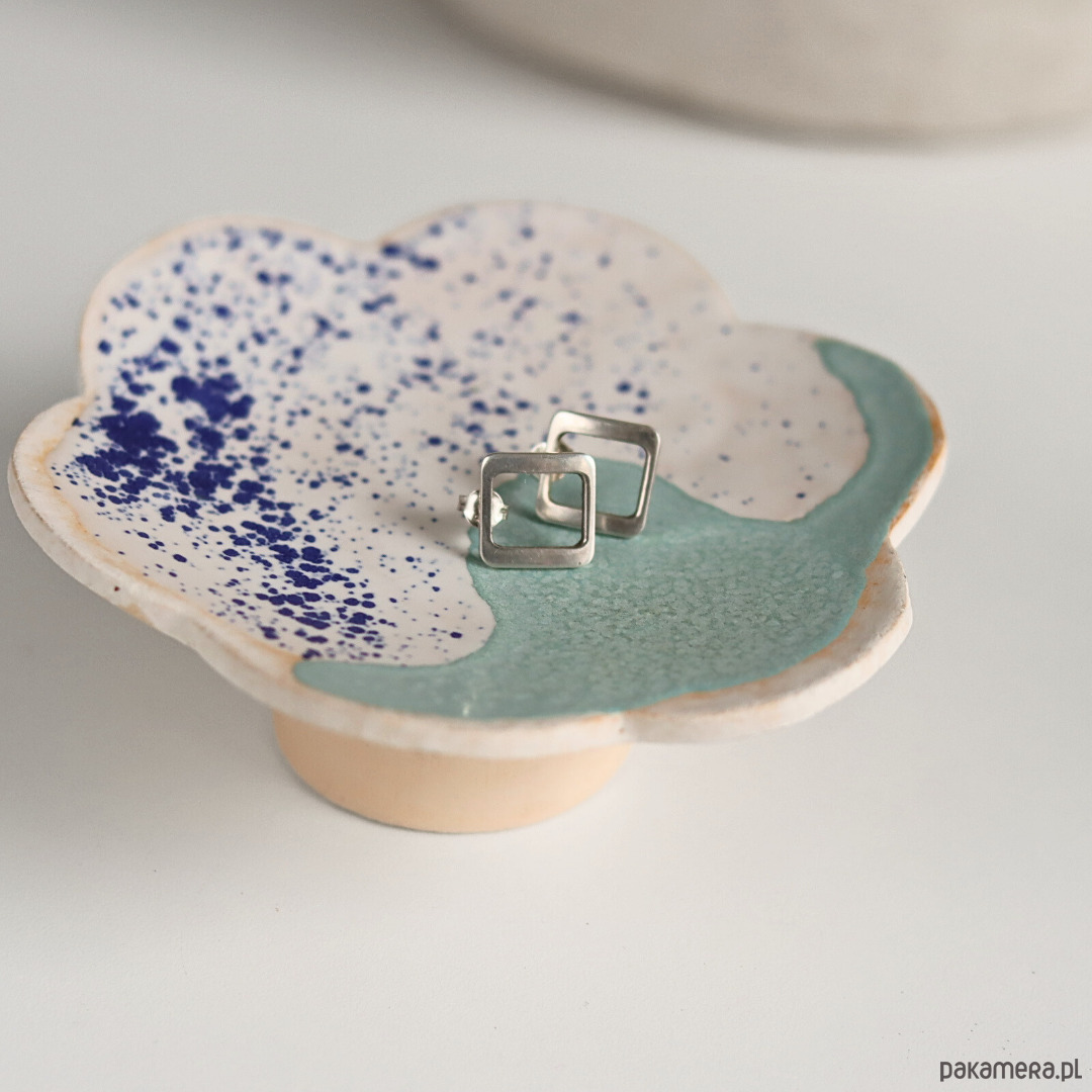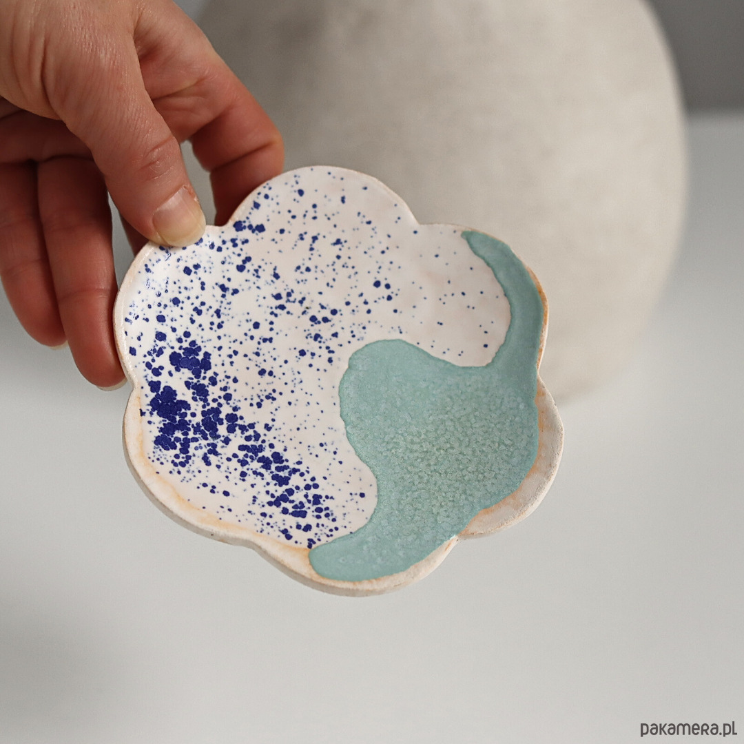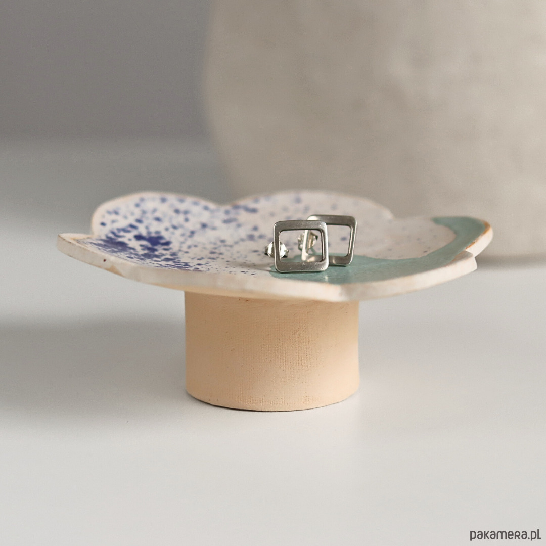 Ręcznie lepiony i malowany ceramiczny talerzyk kwiat na nóżce, podstawka na biżuterię wykonana z jasnej gliny, spód surowy.