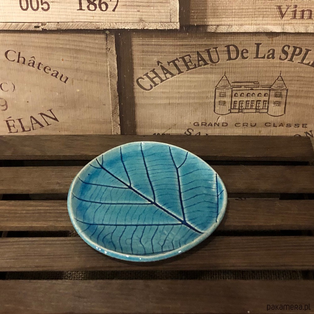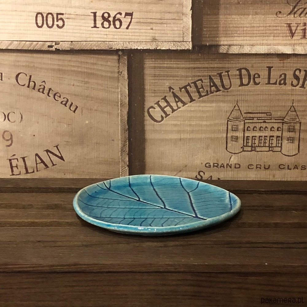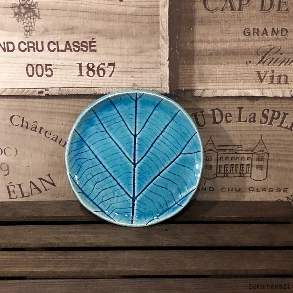 Talerzyk w kolorze turkusowym z odbitym naturalnym liściem.