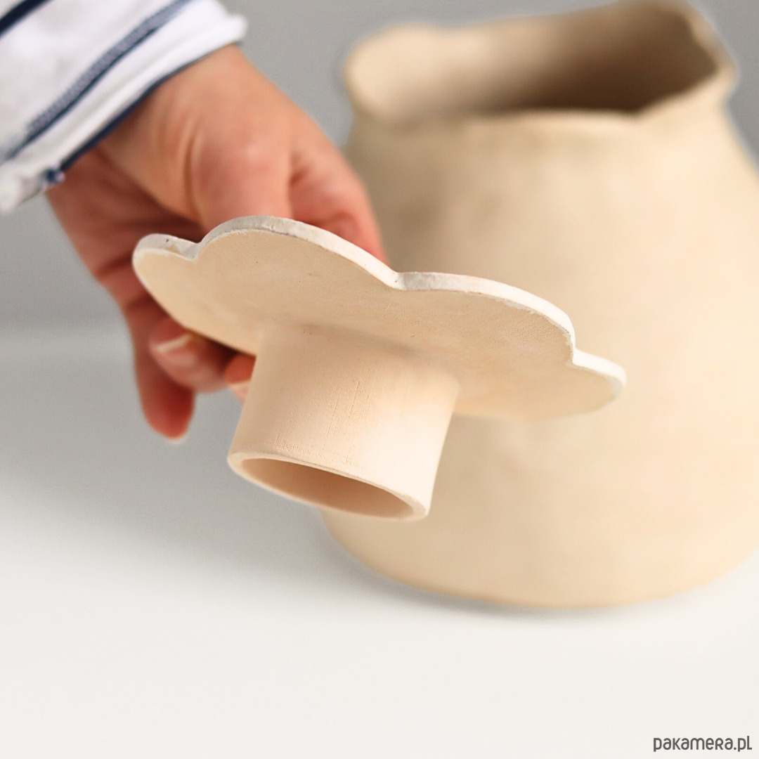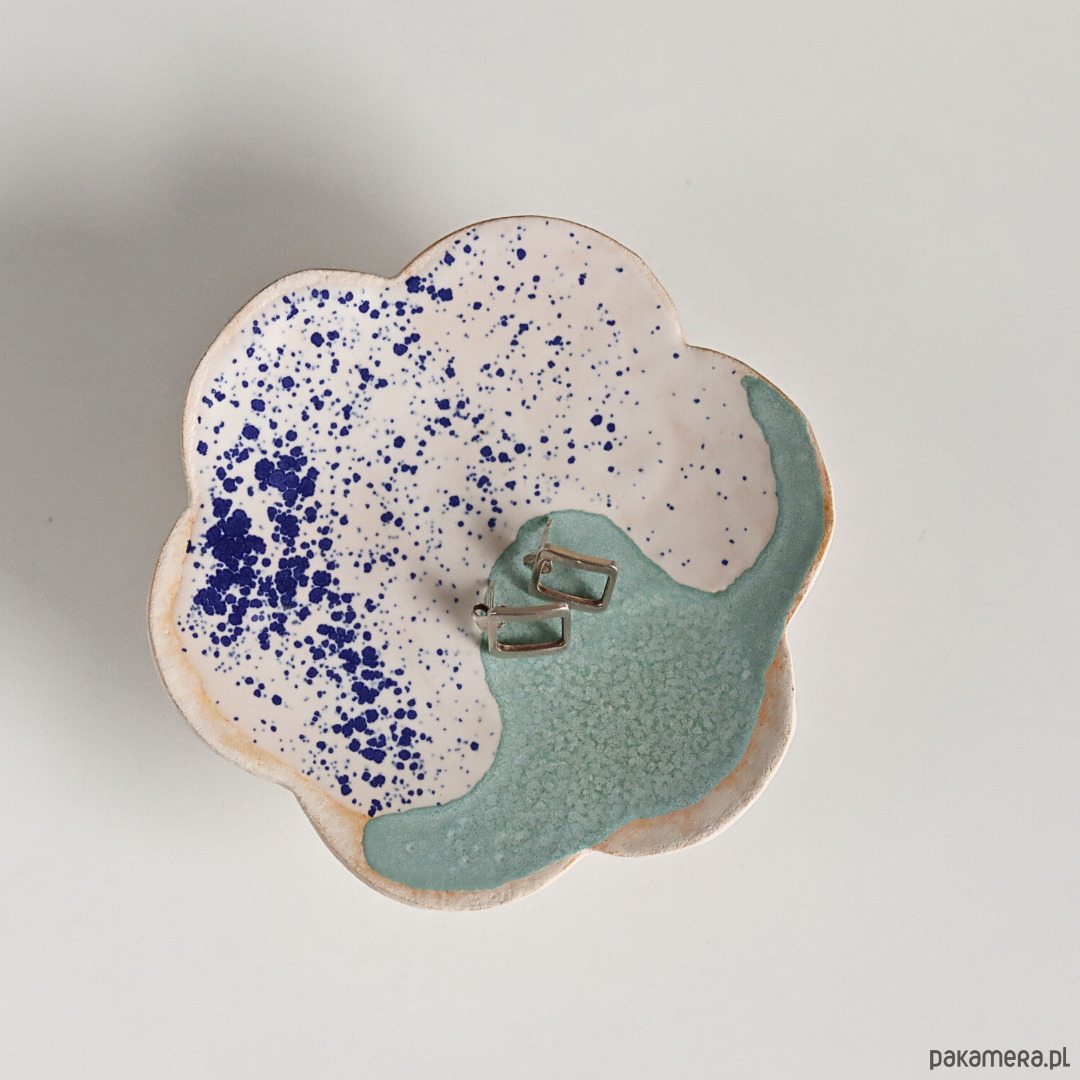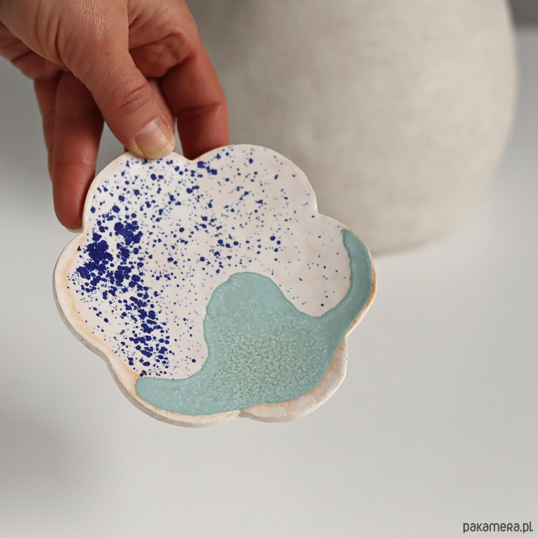 Ręcznie lepiony i malowany ceramiczny talerzyk kwiat na nóżce, podstawka na biżuterię wykonana z jasnej gliny, spód surowy.