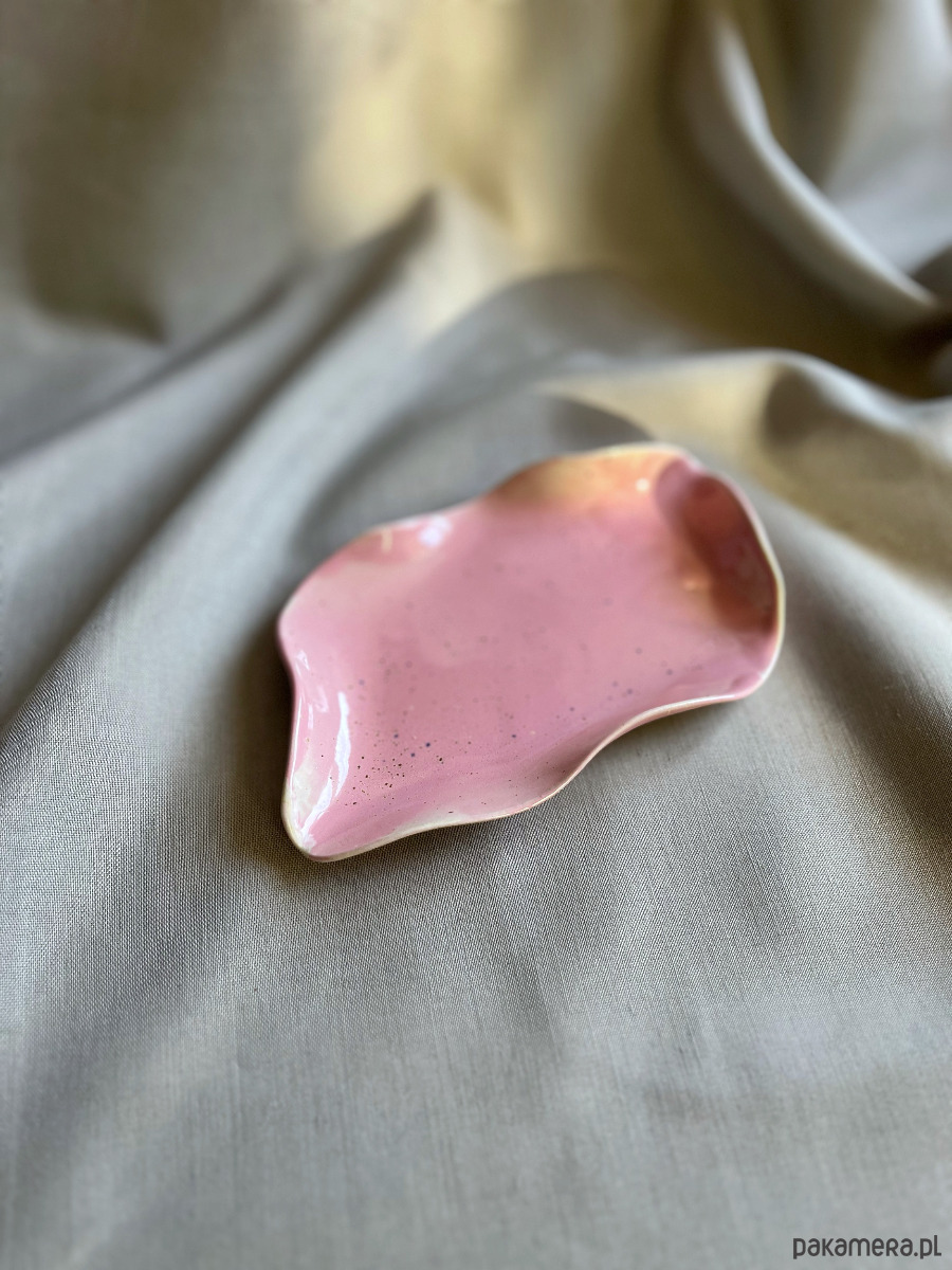 Delikatny i subtelny – ręcznie wykonany podłużny talerzyk ceramiczny na biżuterię. Pokryty szkliwem w kolorze pastelowego różu.