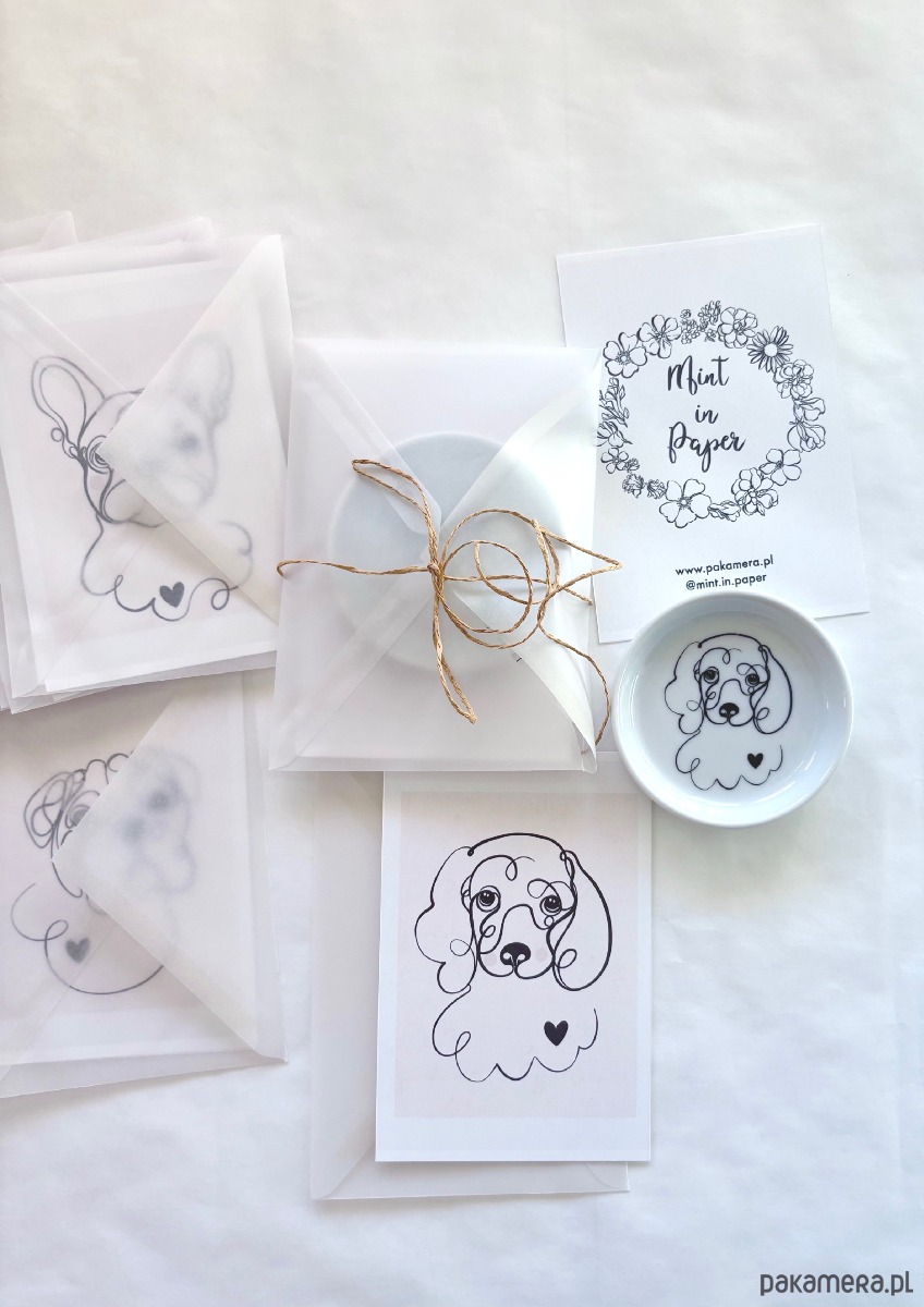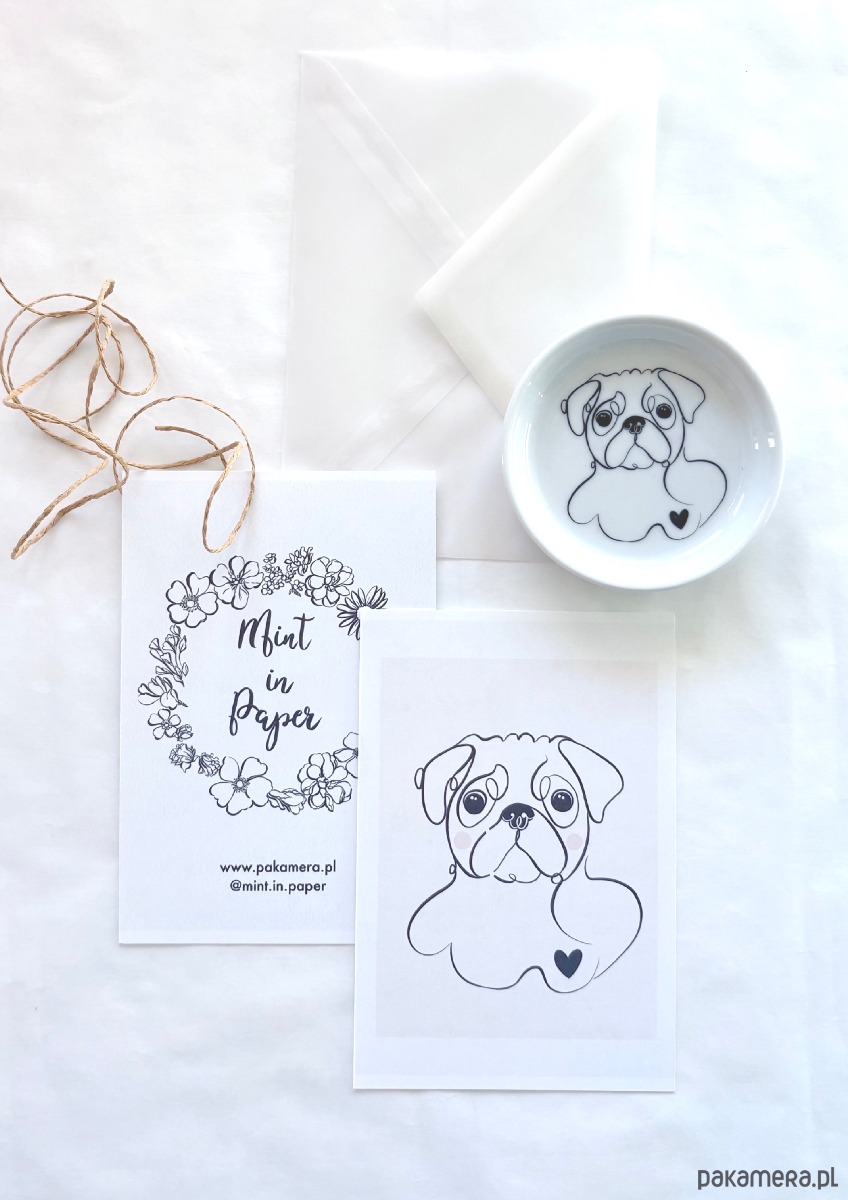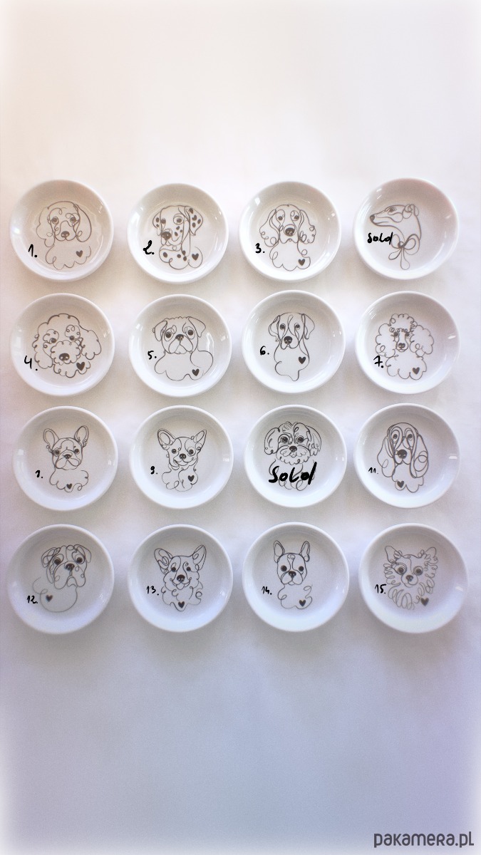 Biały porcelanowy spodek ozdobiony autorską ilustracją z pieskiem.