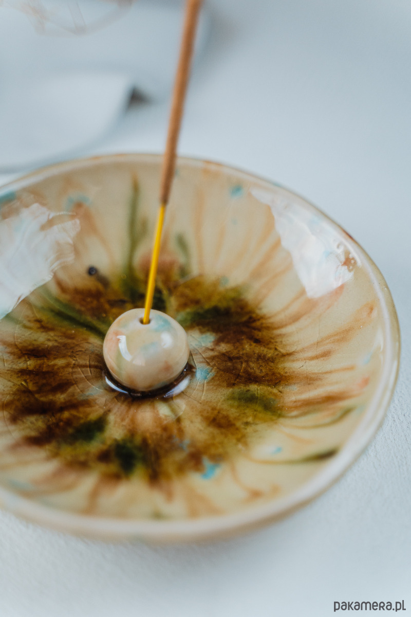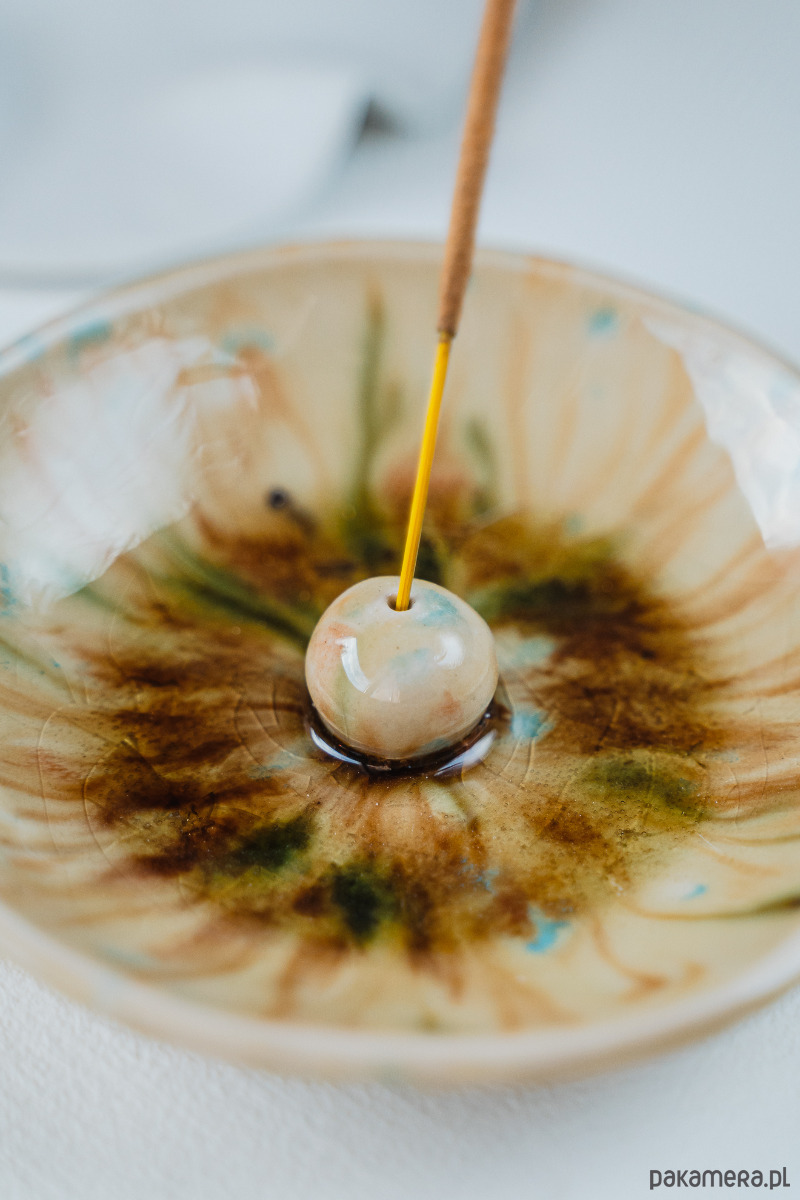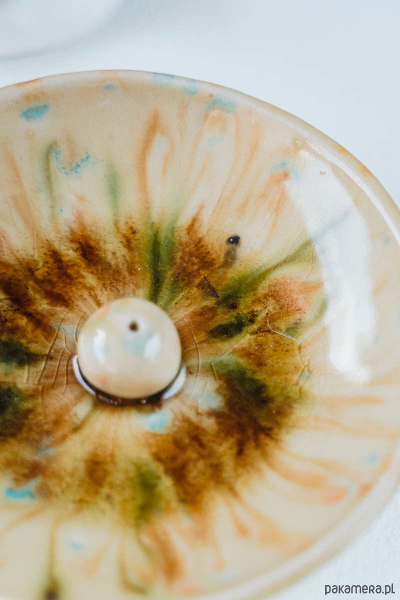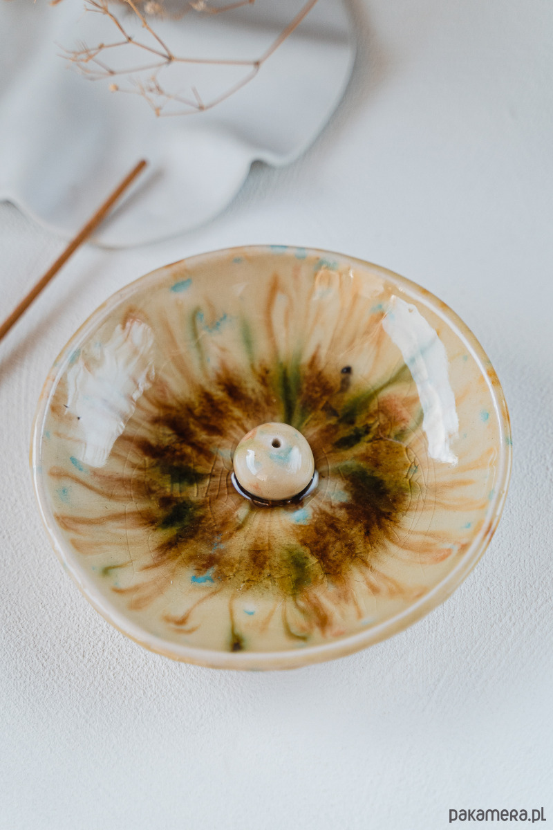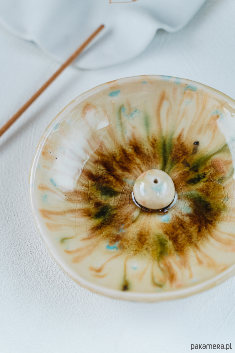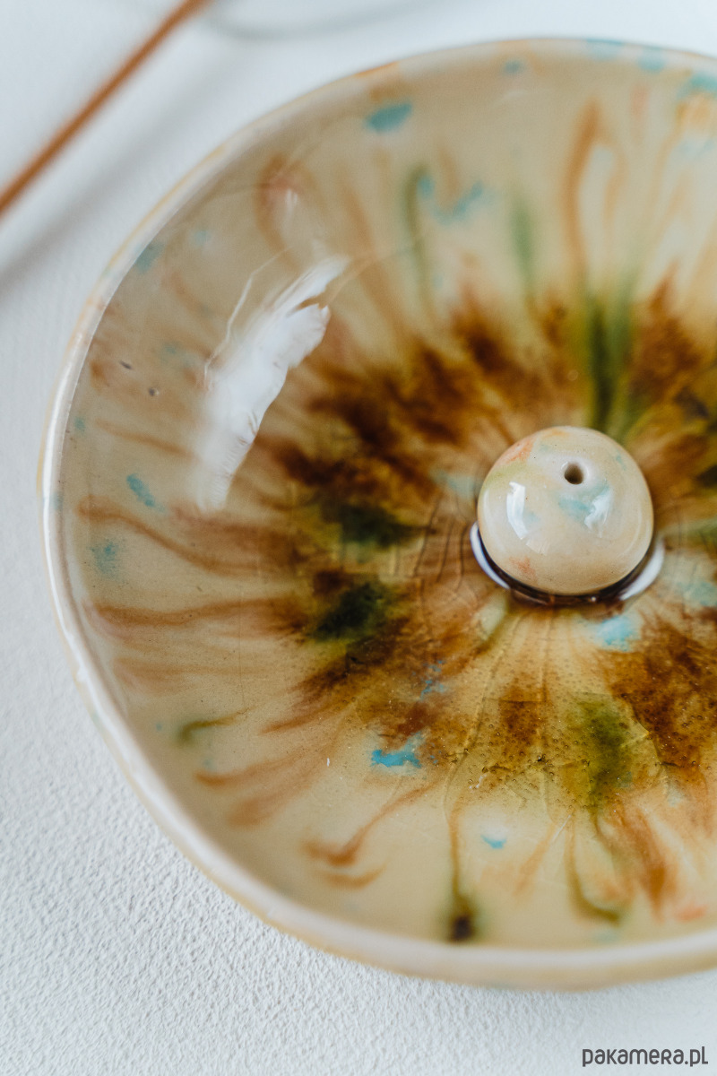 Ceramiczna kadzielnica wykonana ręcznie z białej gliny, pokryta błyszczącymi szkliwami.