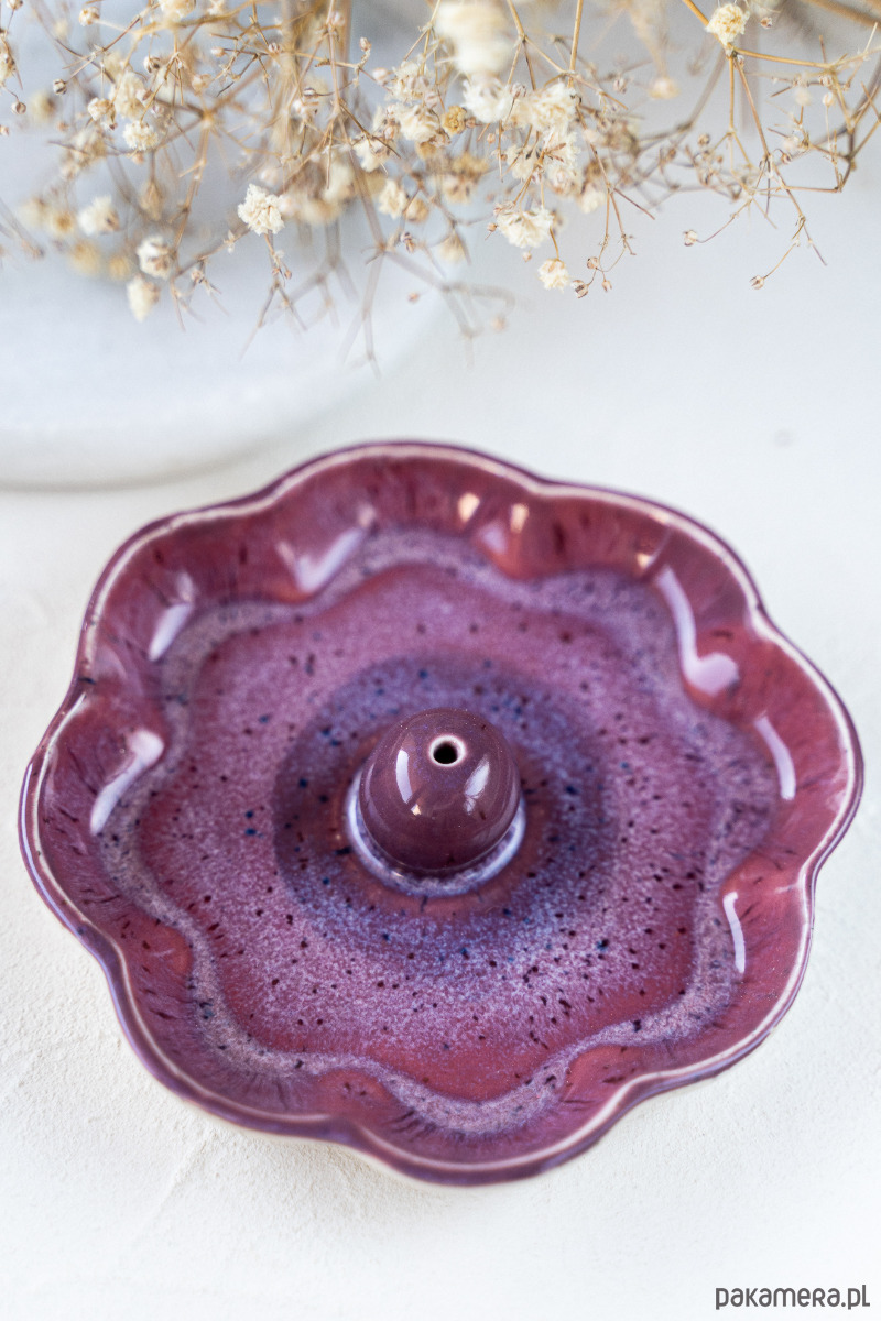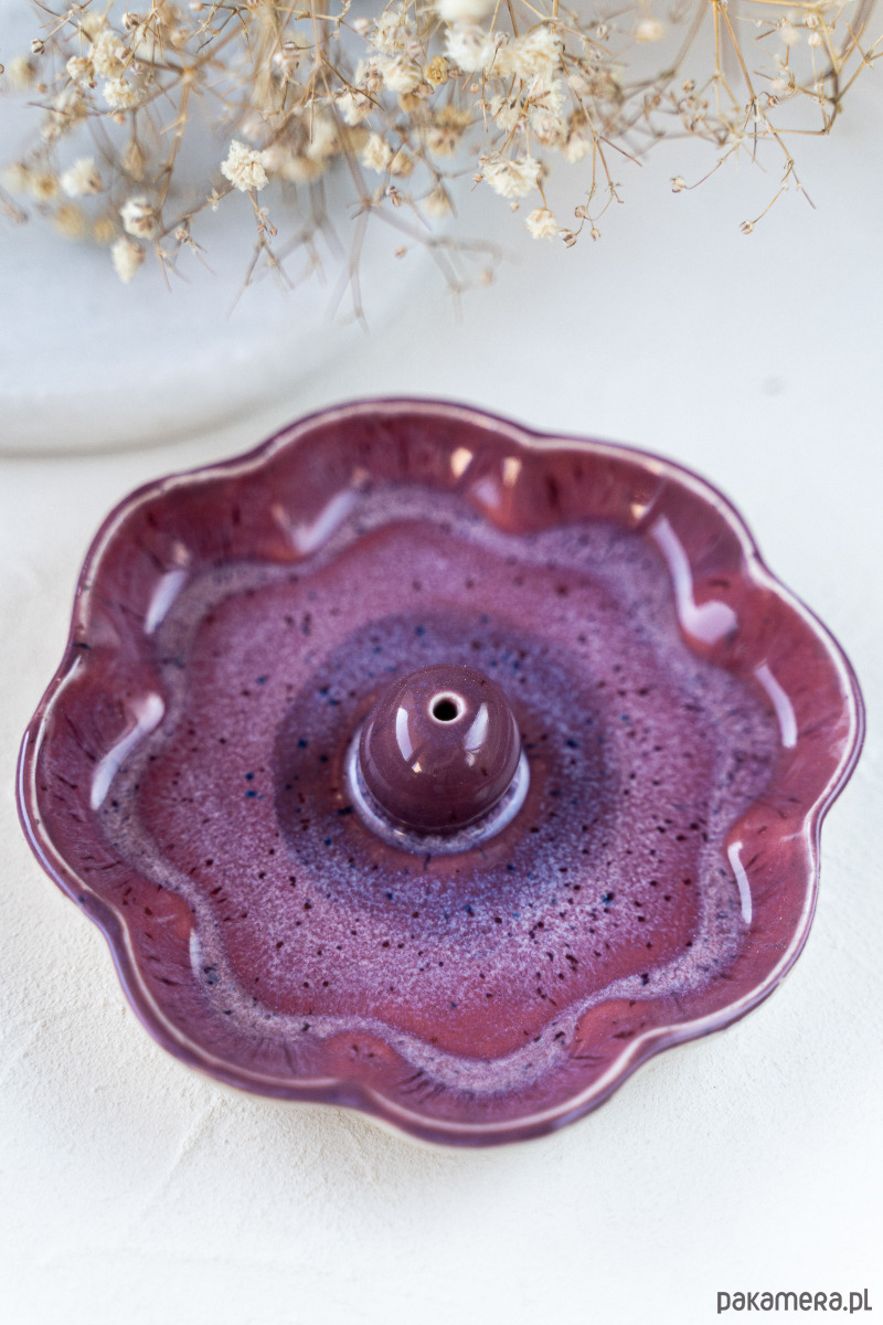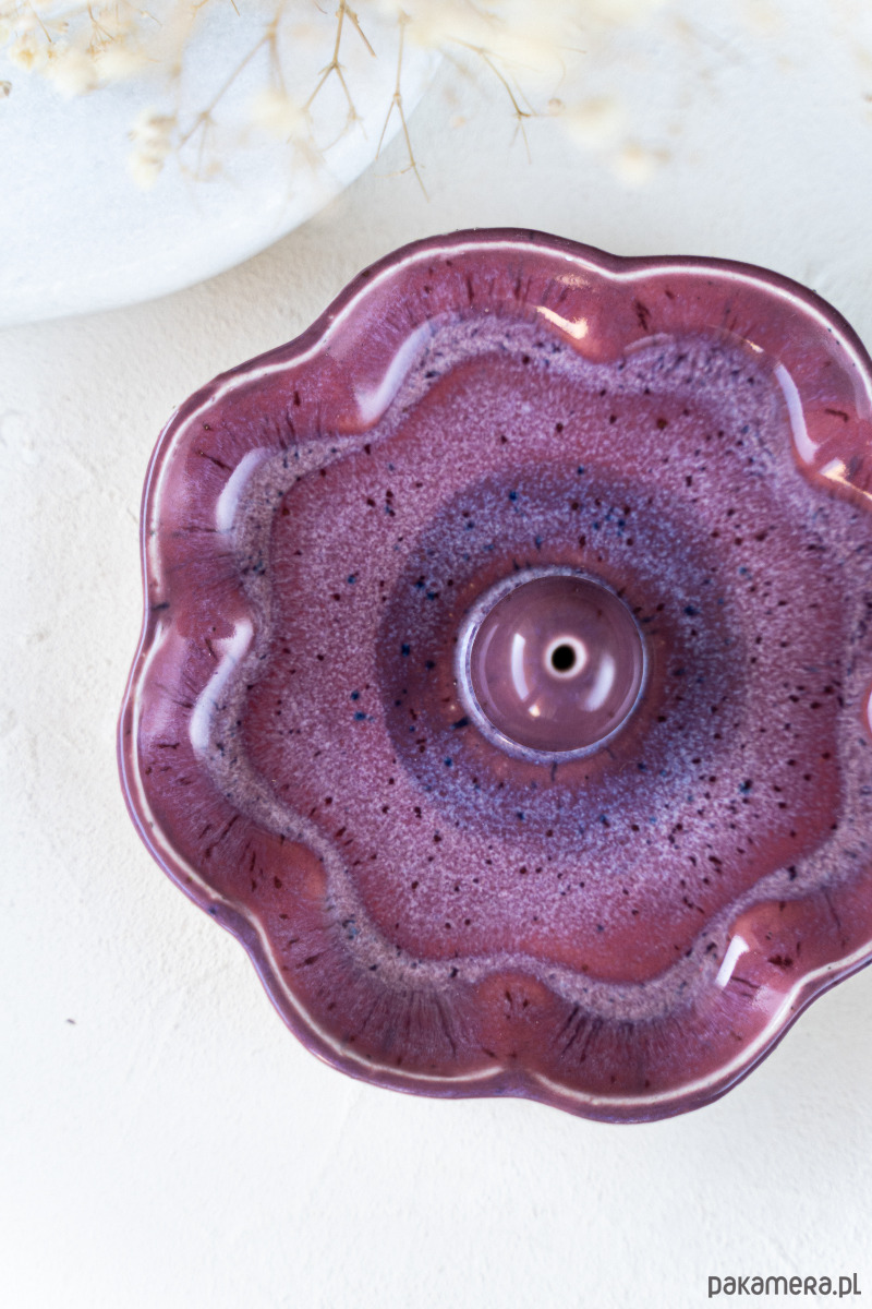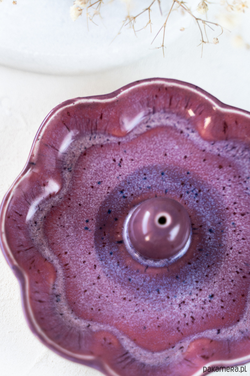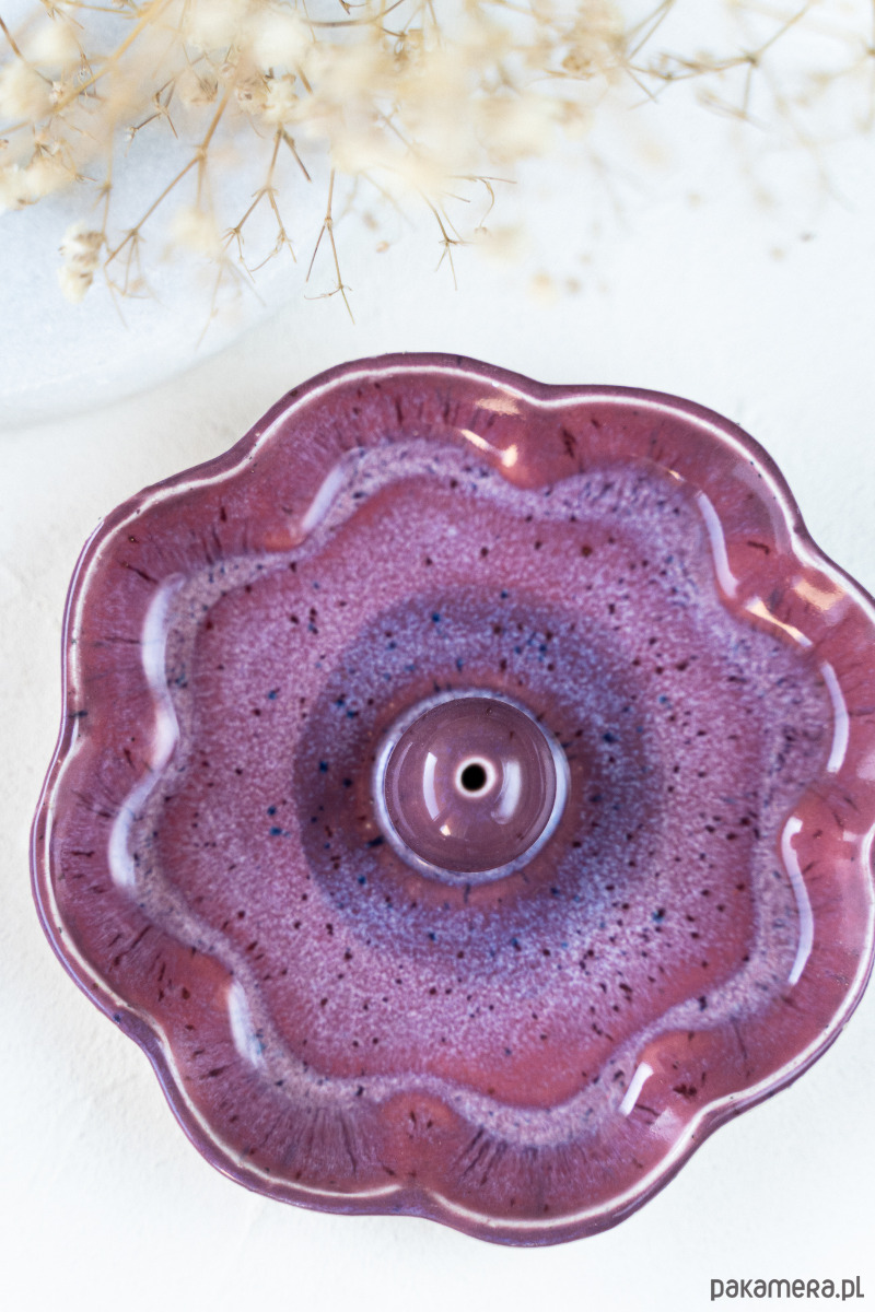 Ceramiczna kadzielnica wykonana ręcznie z białej gliny, pokryta błyszczącymi szkliwami.