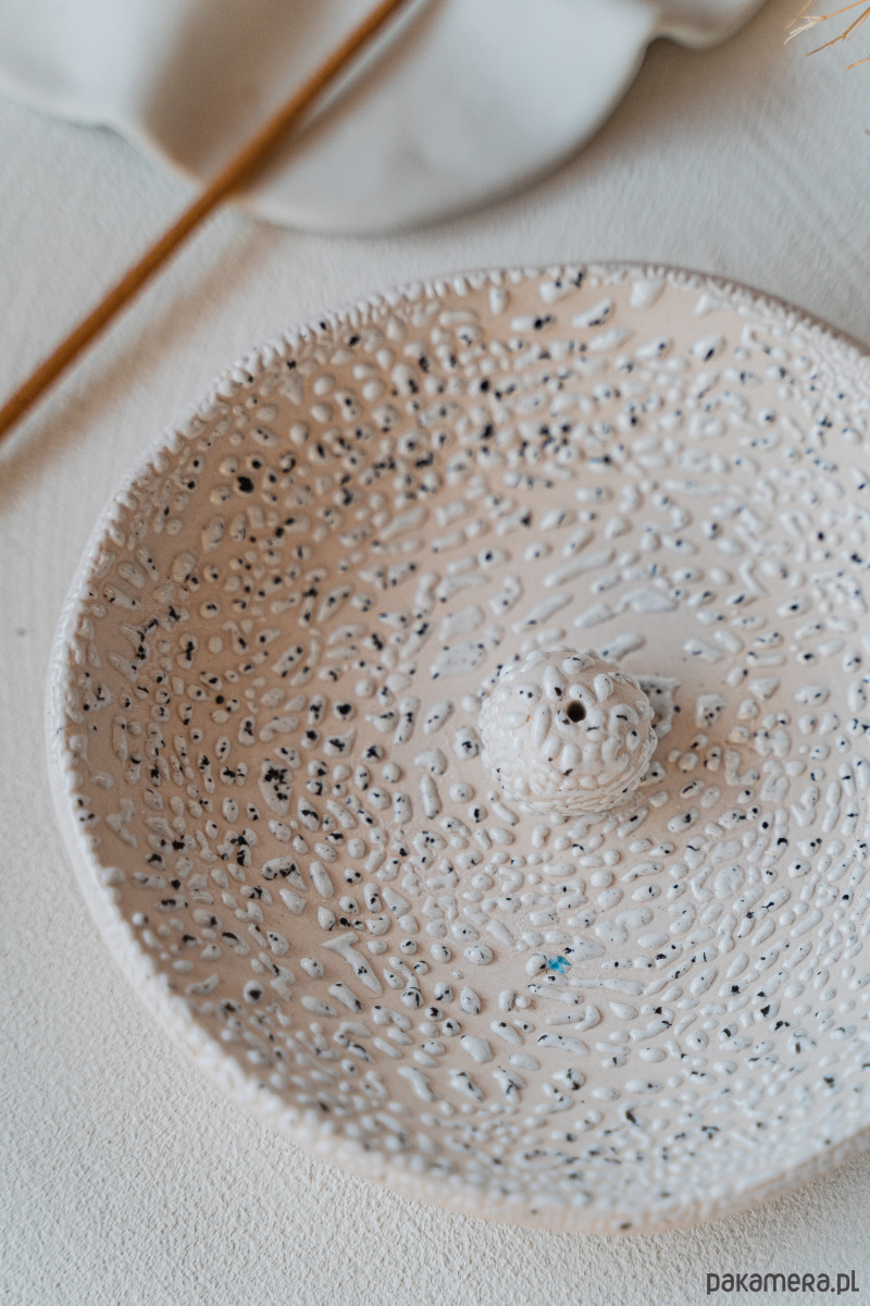 Ceramiczna kadzielnica wykonana ręcznie z białej gliny, pokryta błyszczącym szkliwem.