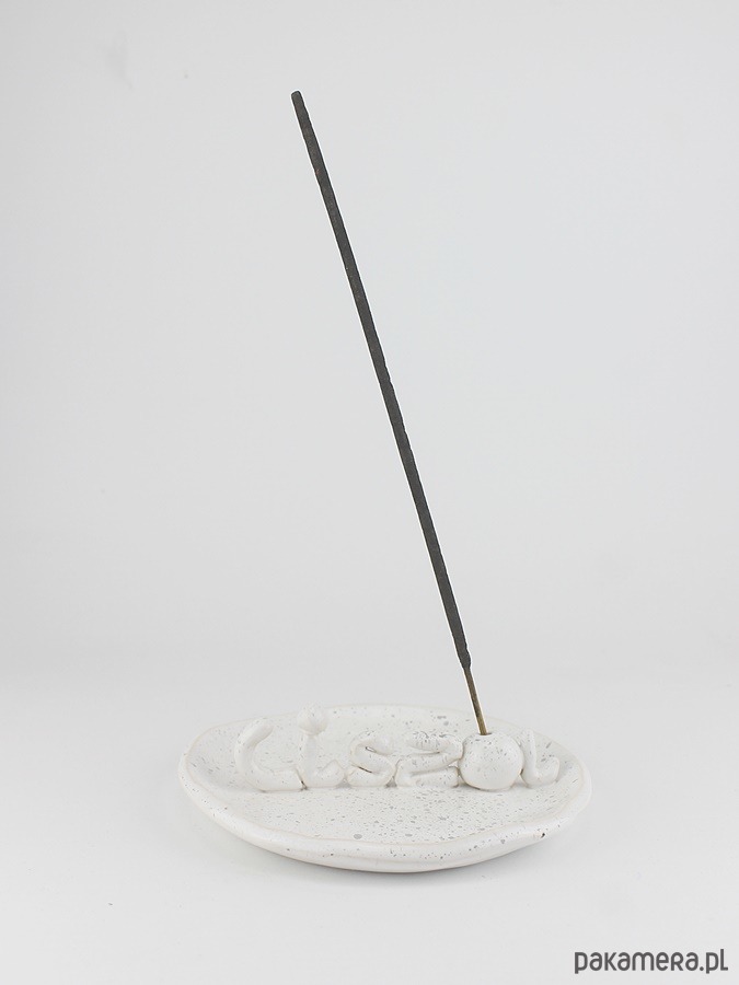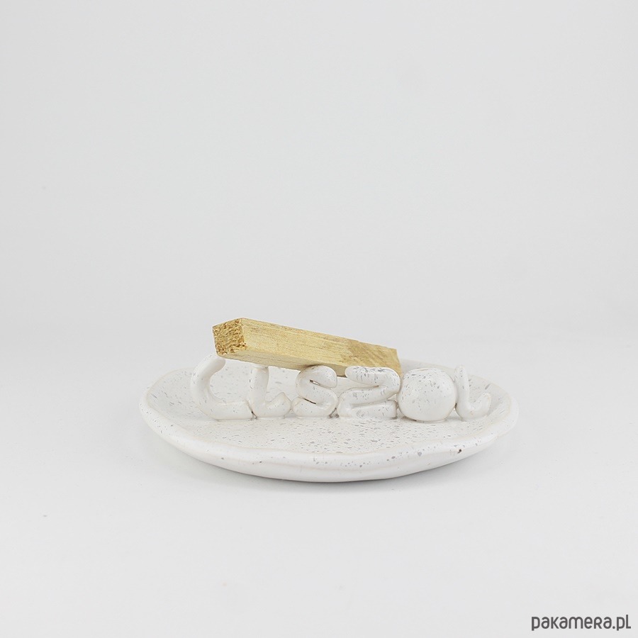 Postawka ma ulepiony napis CISZA, w ostatniej literce jest dziurka - specjalnie na kadziło na patyczku, a na samym napisie można oprzeć palo santo. Dzięki podwyższonym brzegom popiół pozostaje na talerzyku.
