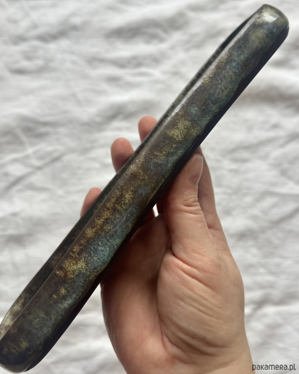 Naczynie wykonane jest z ciemnobrązowej gliny i wykończone głębokim, morskozielonym szkliwem z ziemistobrązowymi krawędziami oraz rustykalnymi akcentami.