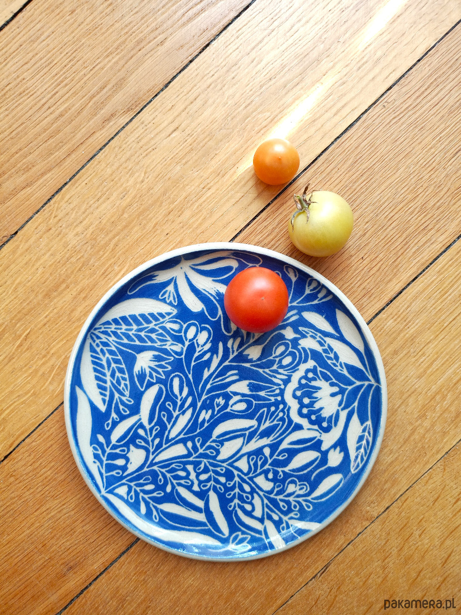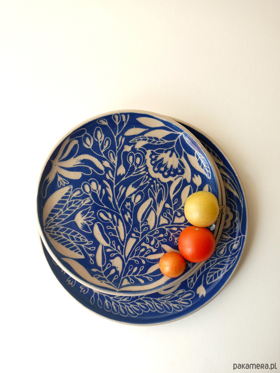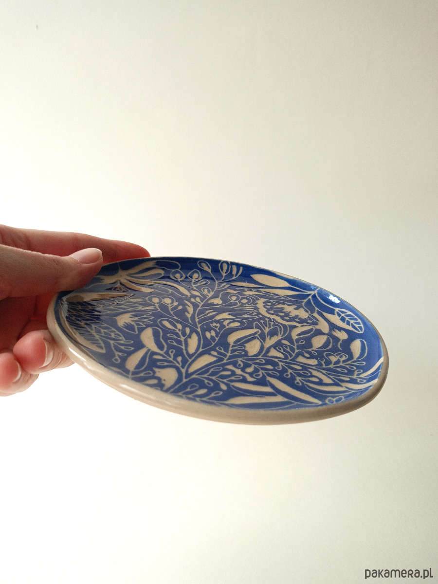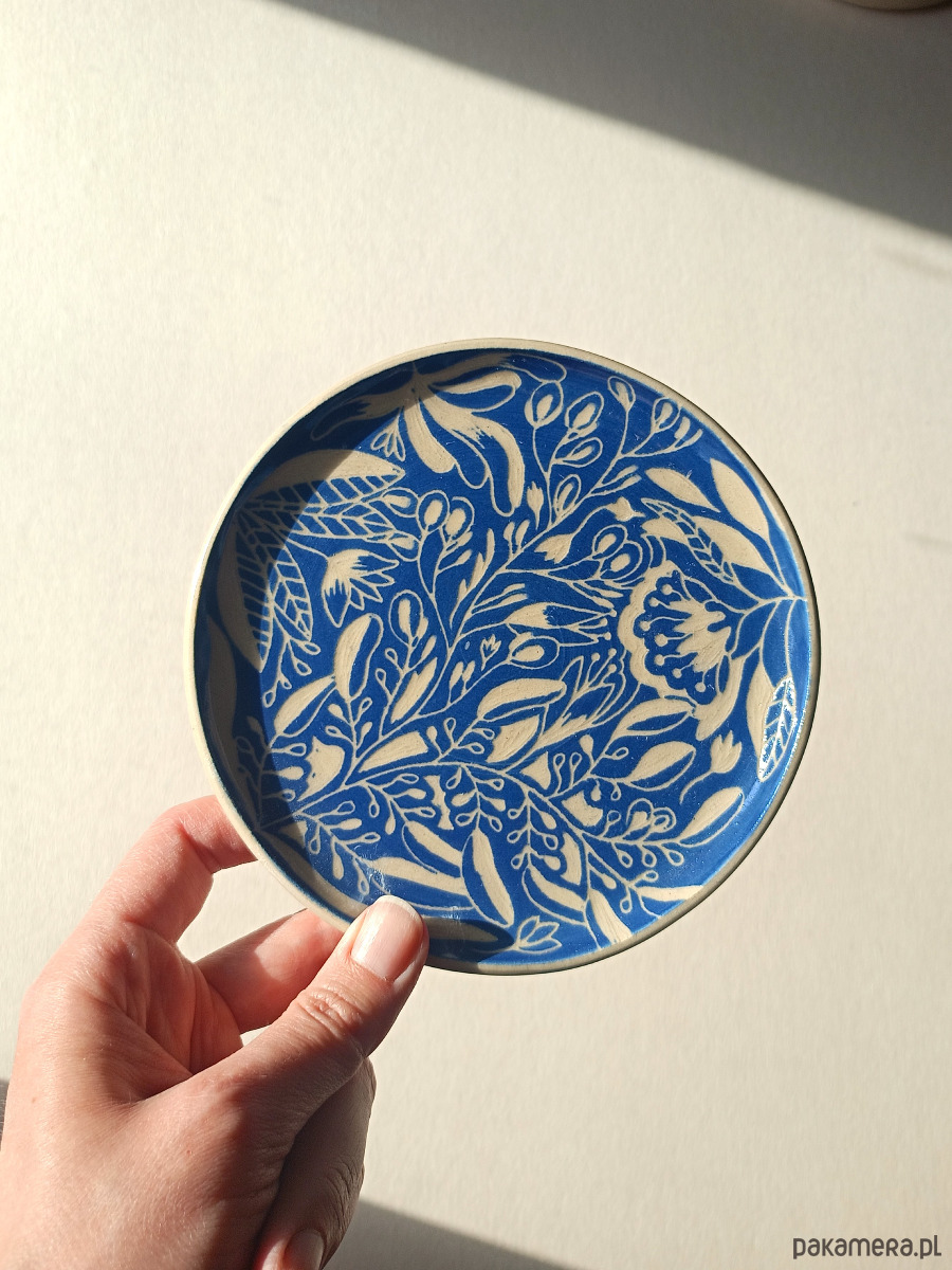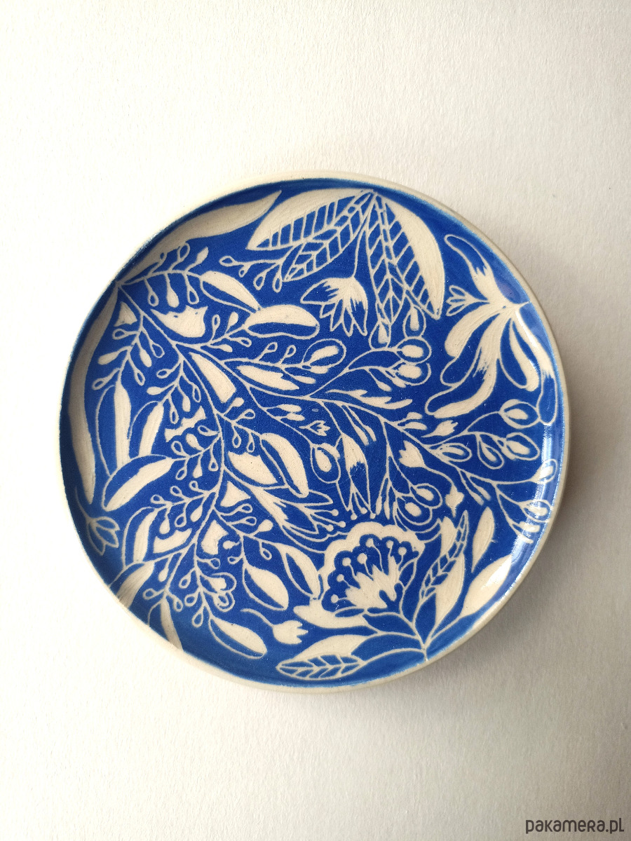Płaski talerzyk ozdobiony ręcznie pięknym, roślinnym wzorem w kolorze ciemnoniebieskim.