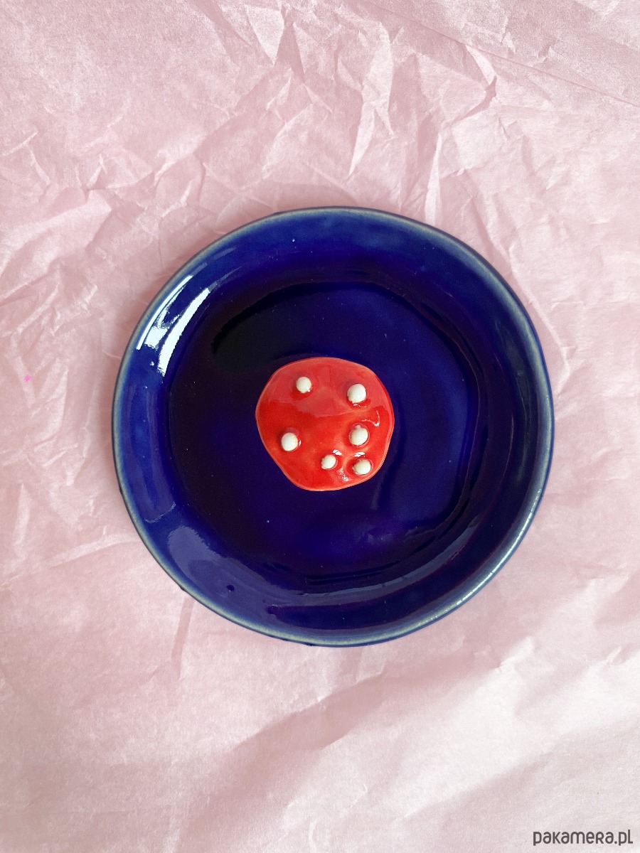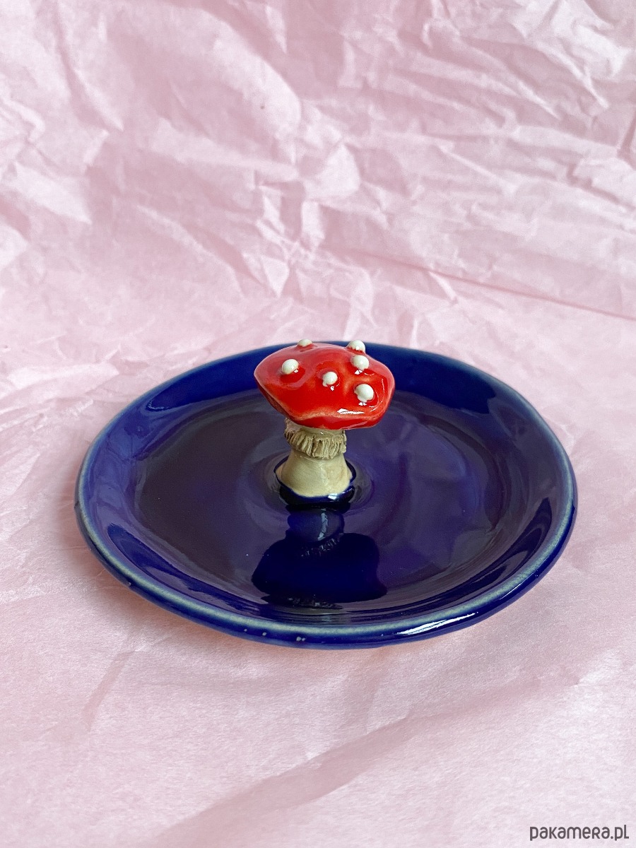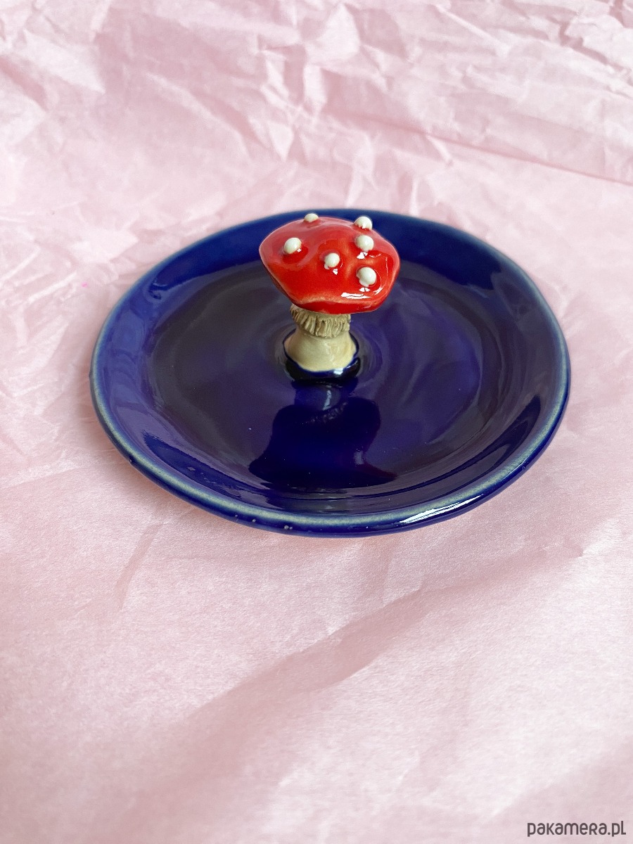 Wykonany ręcznie z gliny, szkliwiony, wypalany dwukrotnie, kolor granat/niebieski i czerwony grzybek.