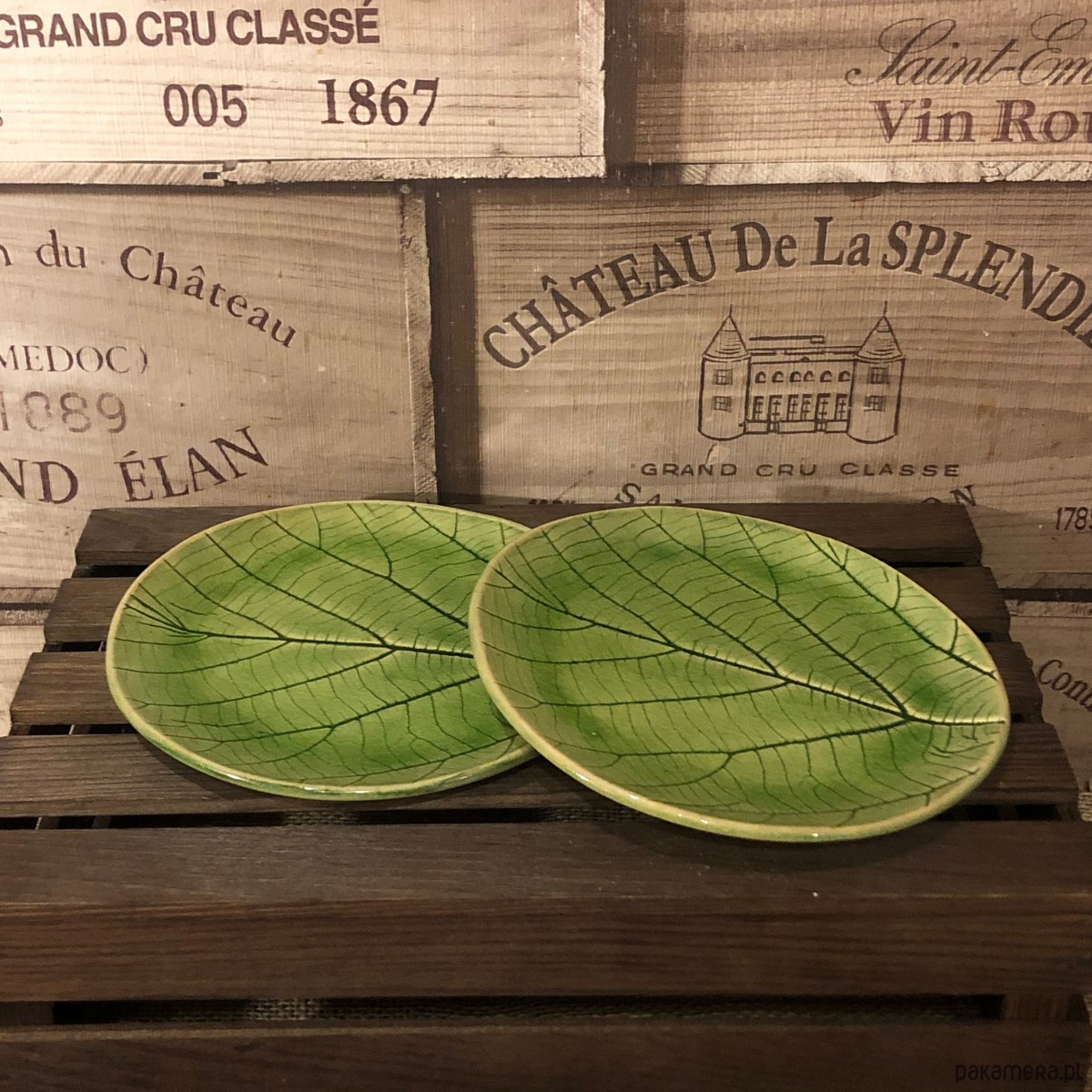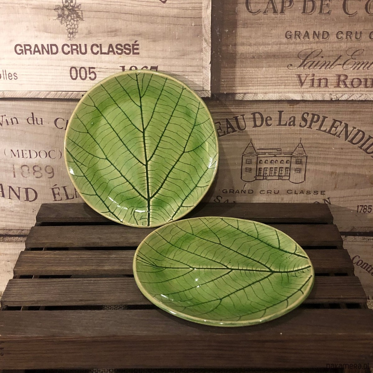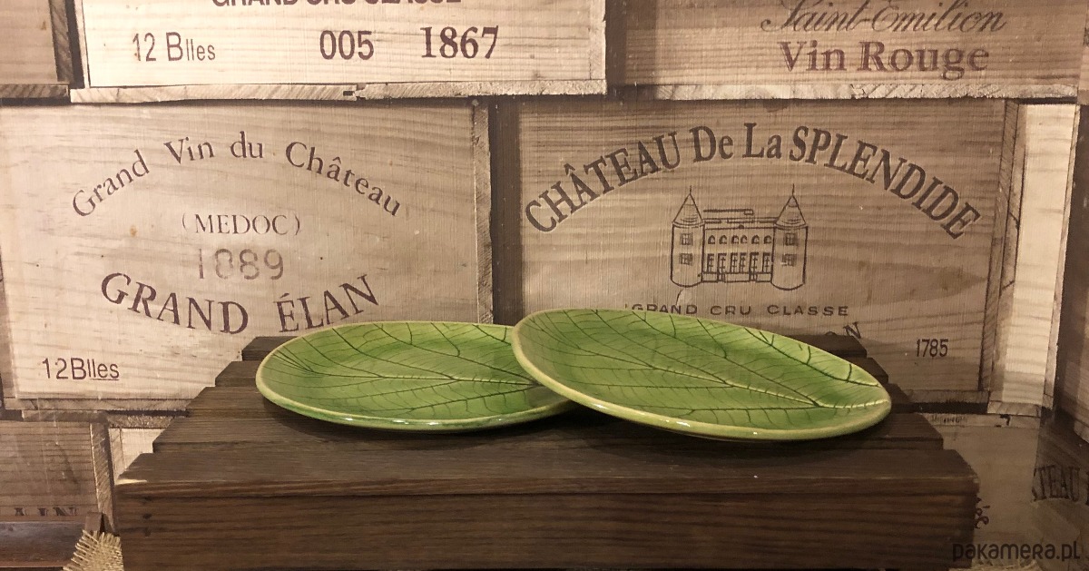 Talerzyk deserowy w kolorze soczystej zieleni z odbitym naturalnym listkiem.