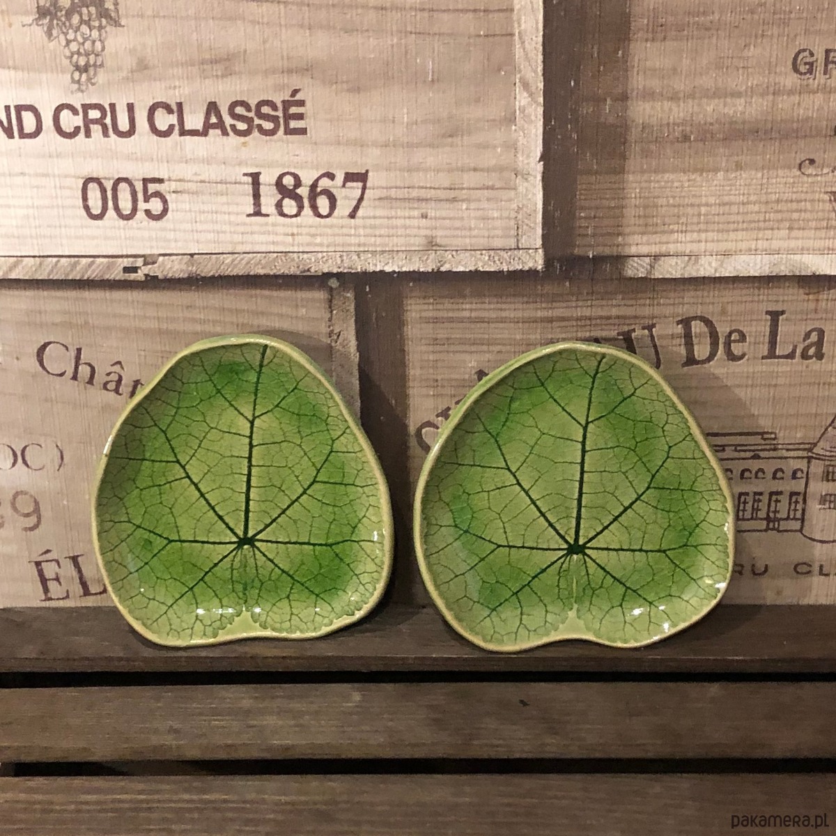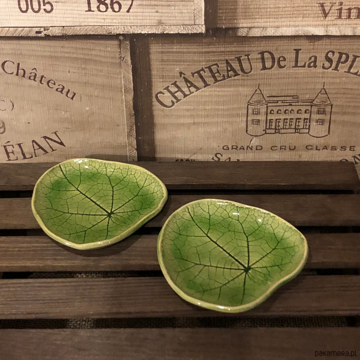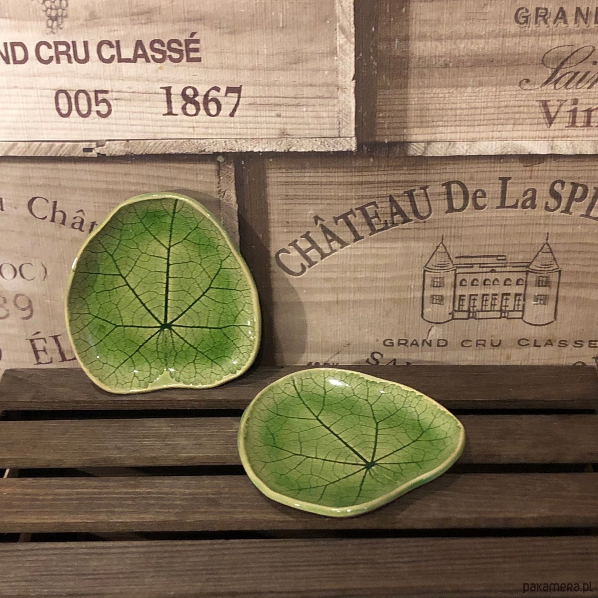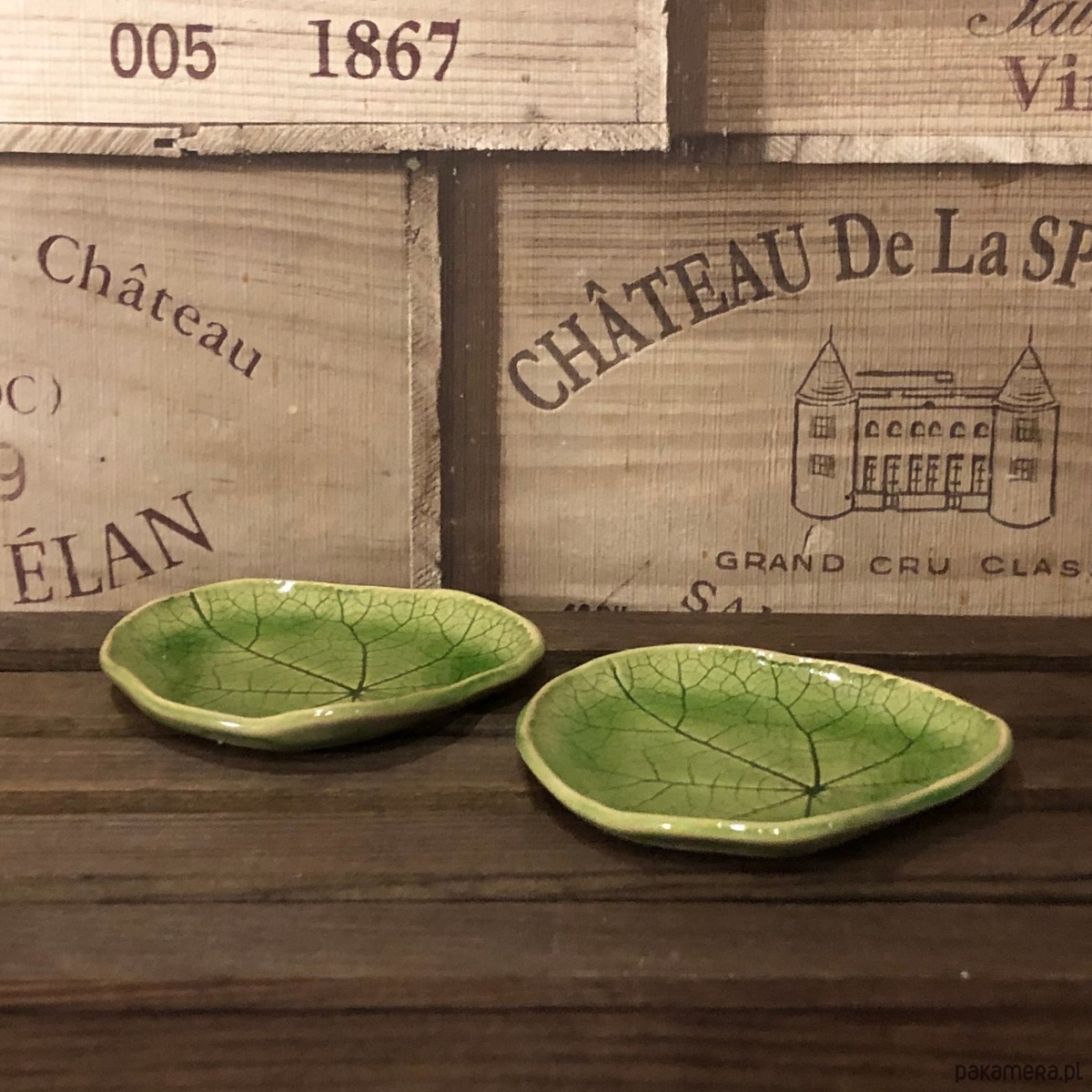 Talerzyk/spodeczek w kolorze jasnej zieleni z odbitym naturalnym listkiem malwy.