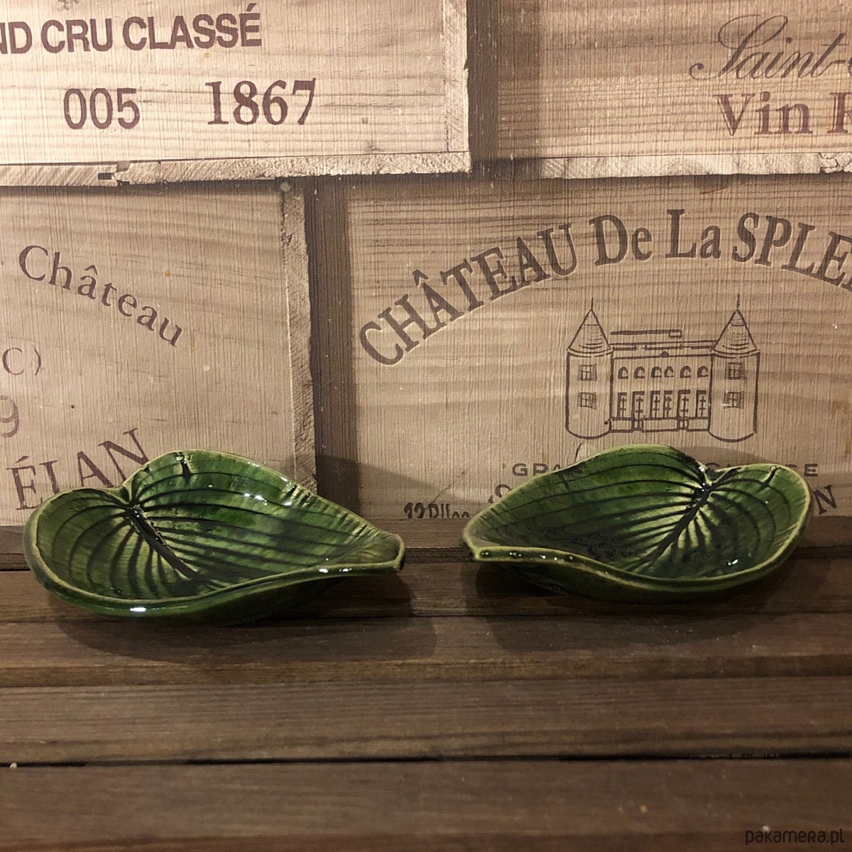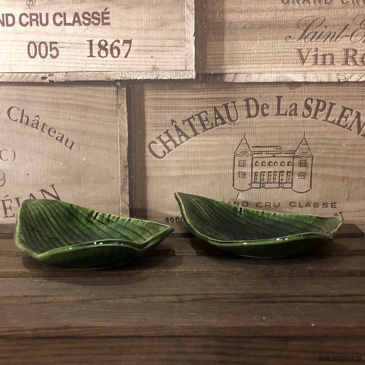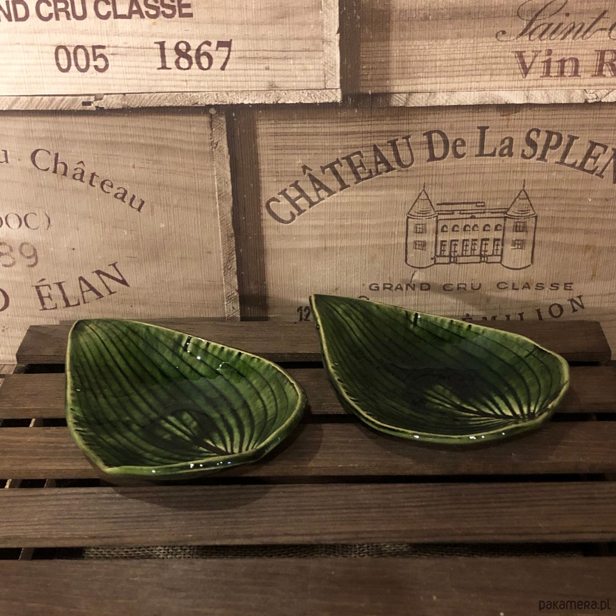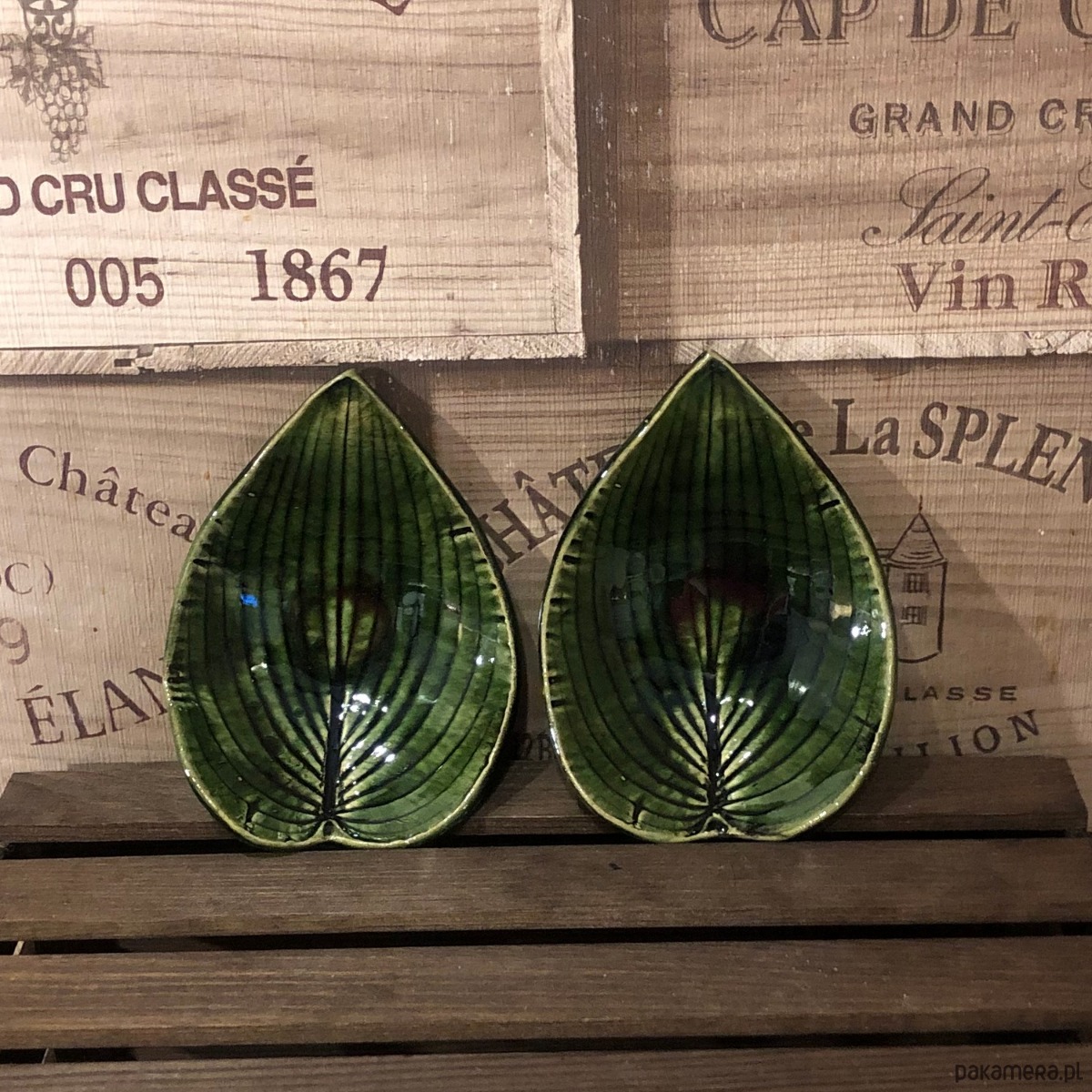Talerzyk/spodeczek/świecznik w kolorze butelkowej zieleni z odbitym naturalnym listkiem hosty.
