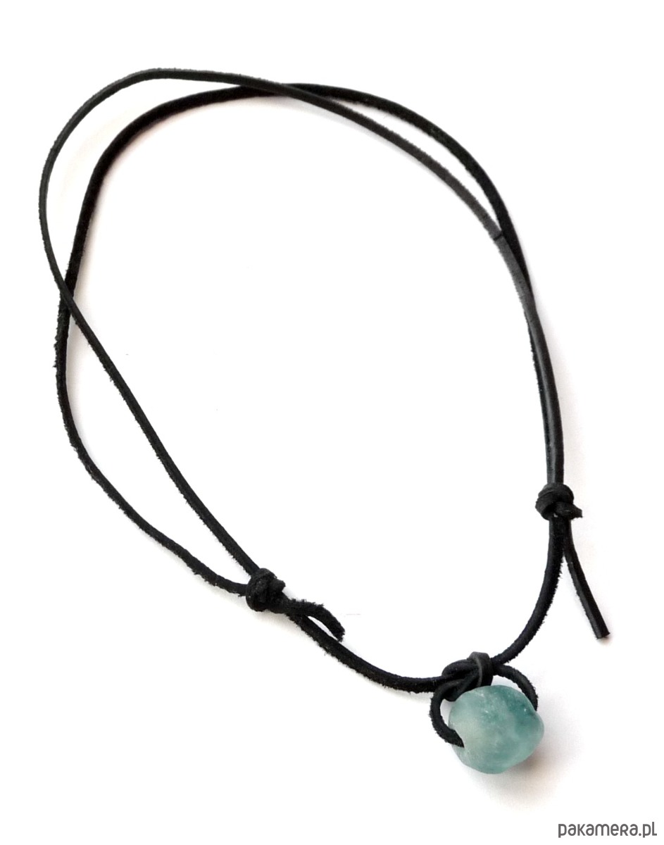 Niezwykły i oryginalny w swej formie i kolorze koralik podwieszony został na długim czarnym surowym rzemyku.