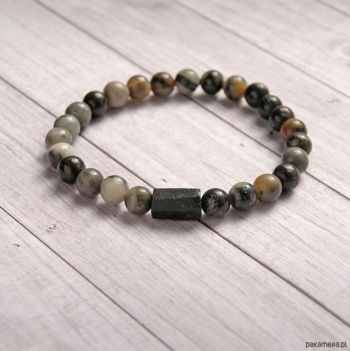 wykonana z czarnego turmalinu (bryłka surowa,ciosana) oraz wielobarwnego amazonitu (8mm)