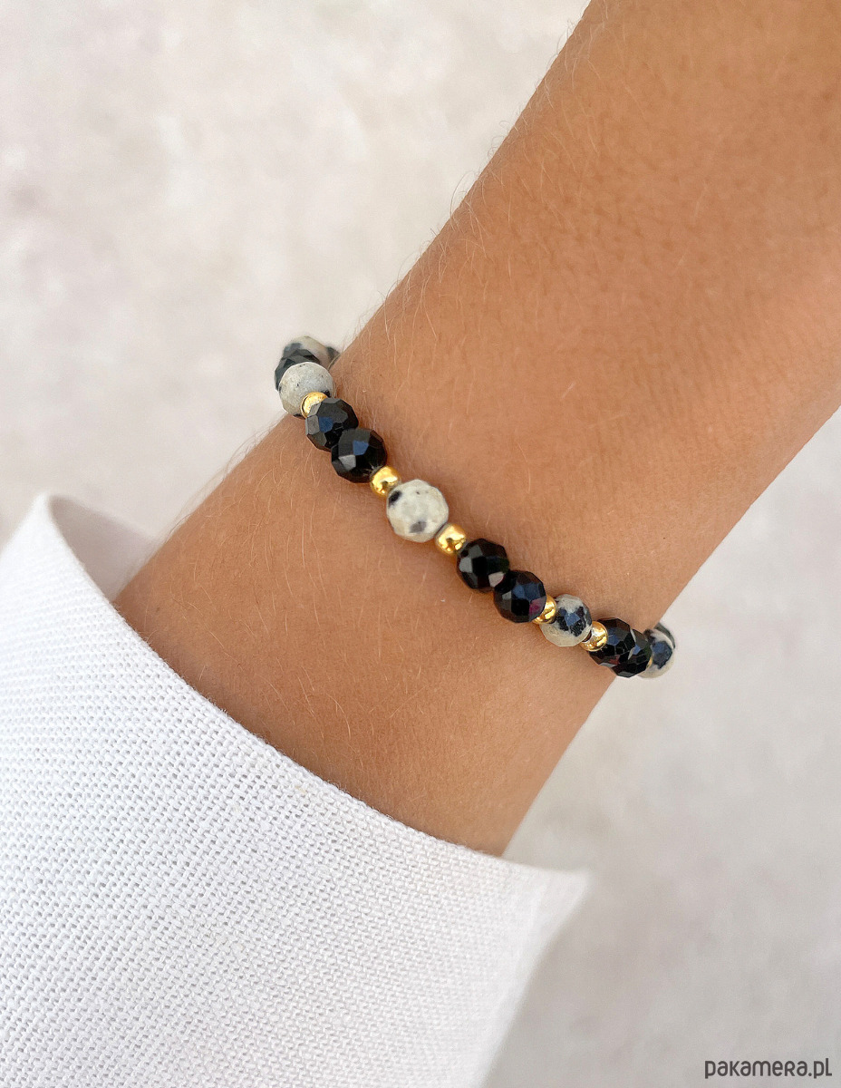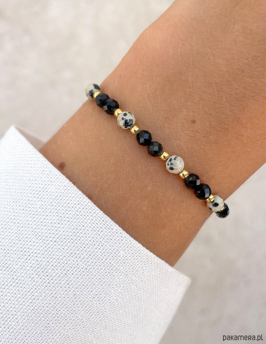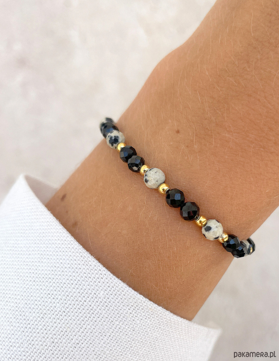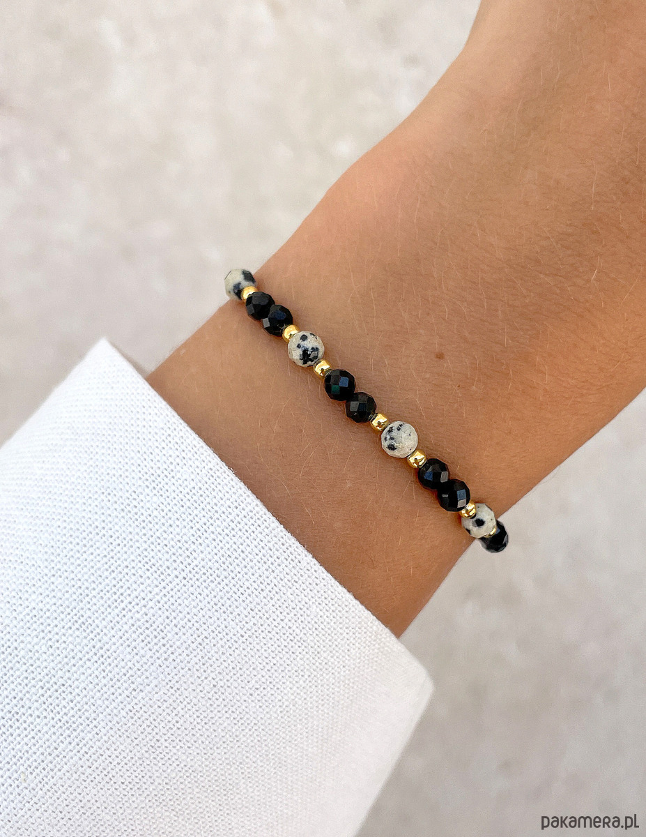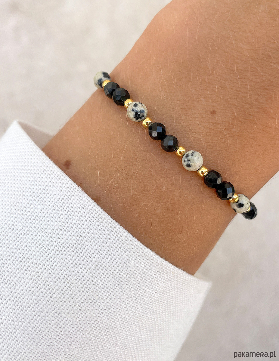 Bransoletka została wykonana z fasetowanych kuleczek czarnego turmalinu i jaspisu dalmatyńskiego o średnicy około 4 mm. Ich powierzchnia zachwyca niepowtarzalnym połączeniem głębokiej czerni z nakrapianym, czarno-białym wzorem, co sprawia, że każdy kamień jest jedyny w swoim rodzaju. Wzór dopełniają lśniące, złote kuleczki z hematytu o średnicy około 2,5 mm, które nadają całości wyrafinowanego i nowoczesnego charakteru. Dzięki wykorzystaniu wytrzymałej, elastycznej żyłki jubilerskiej, bransoletka jest nie tylko piękna, ale także niezwykle komfortowa w noszeniu.