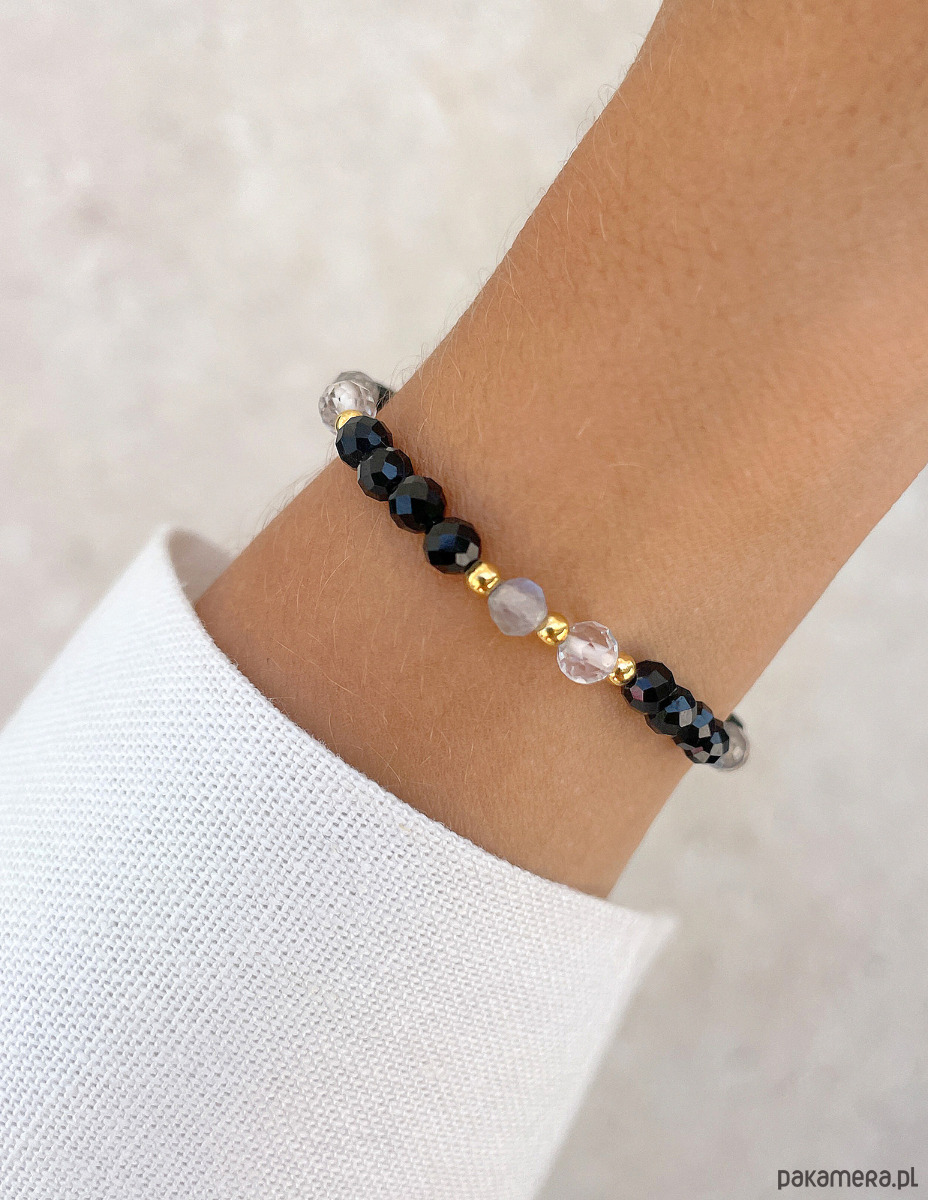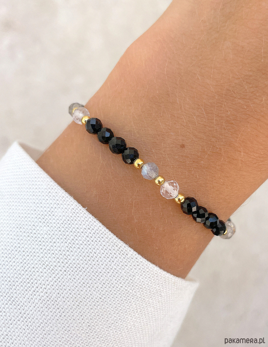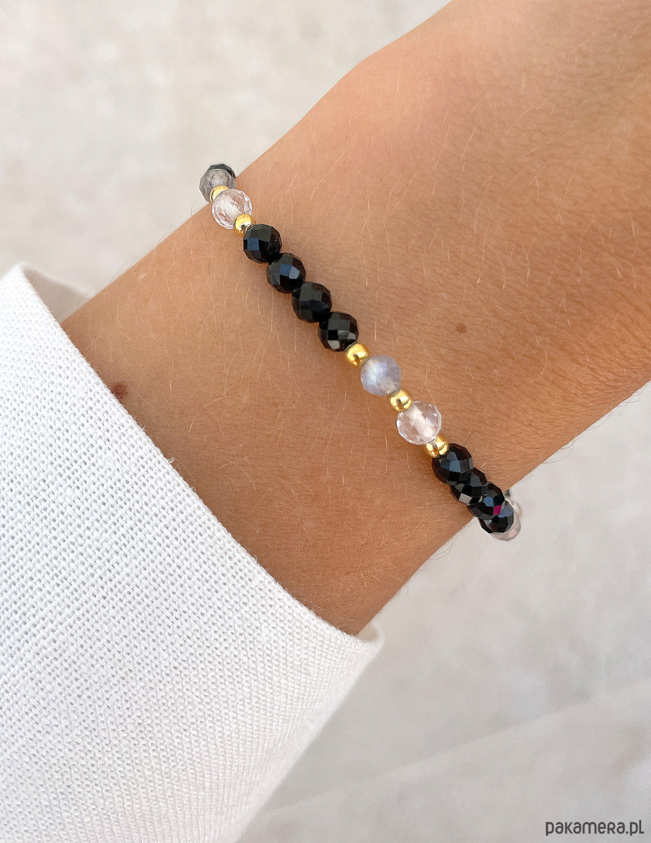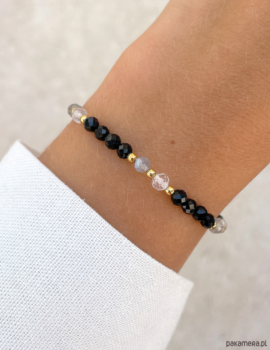 Bransoletka została wykonana z fasetowanych kuleczek czarnego turmalinu, kryształu górskiego i labradorytu o średnicy około 4 mm. Połączenie głębokiej czerni, przezroczystości i szarego labradorytu, który mieni się magicznymi, niebieskimi łunami, tworzy niepowtarzalny i harmonijny efekt wizualny. Wzór dopełniają lśniące, złote kuleczki z hematytu o średnicy około 2,5 mm, które nadają całości wyrafinowanego i nowoczesnego charakteru. Dzięki wykorzystaniu wytrzymałej, elastycznej żyłki jubilerskiej, bransoletka jest nie tylko piękna, ale także niezwykle komfortowa w noszeniu.