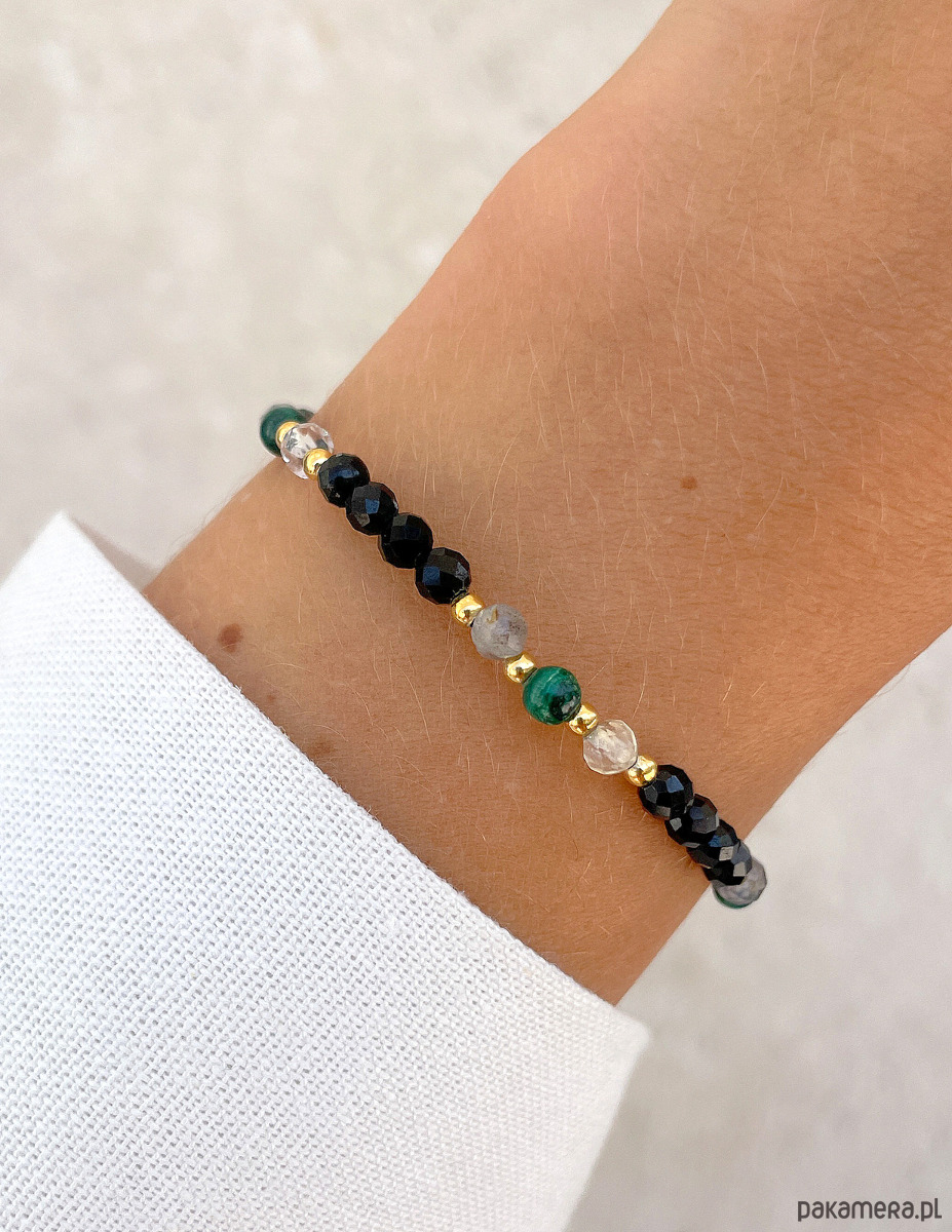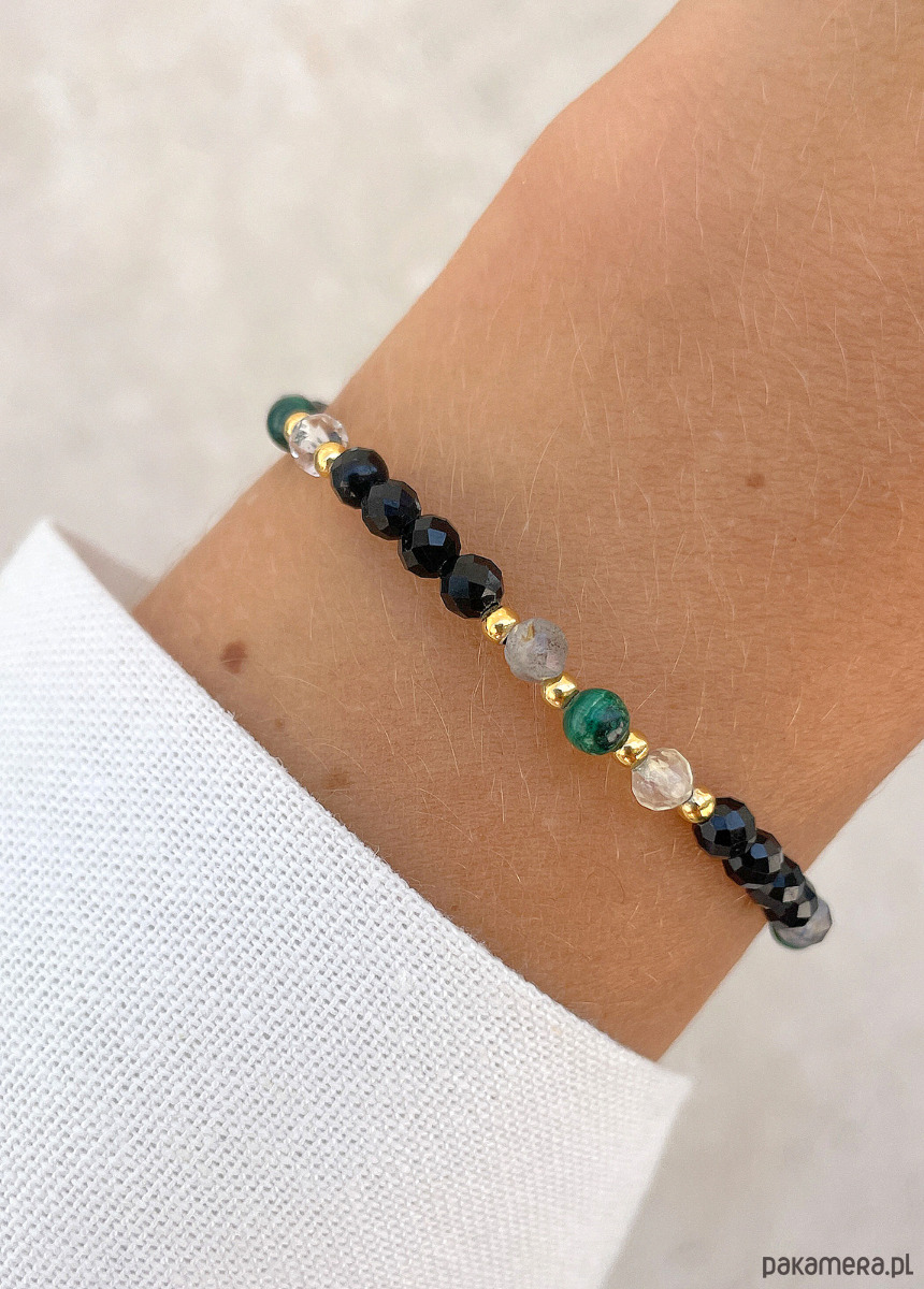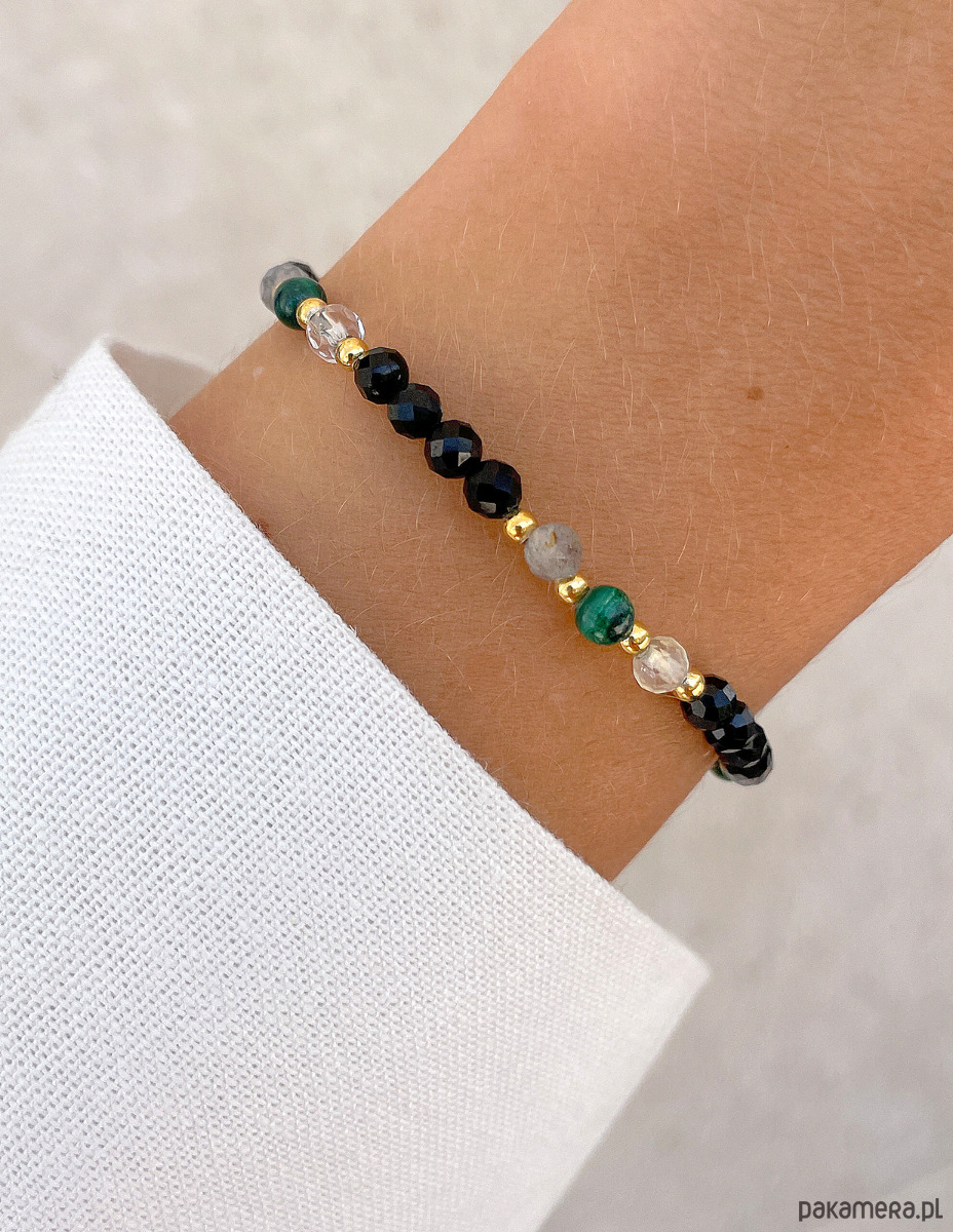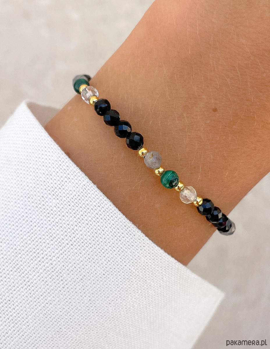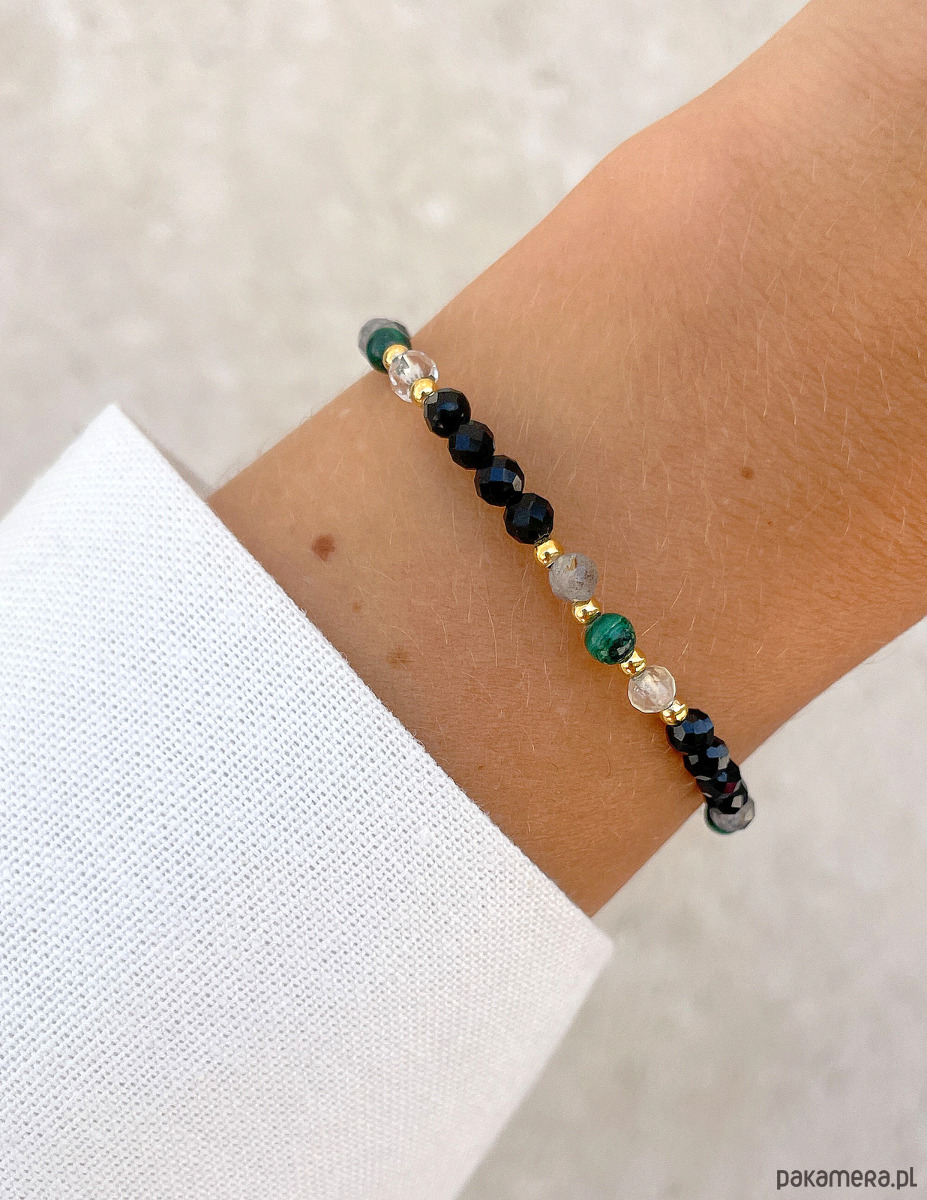 Cechy bransoletki:Kamień: czarny turmalin, malachit, cytryn, labradoryt, hematyt (kolor złoty)Wielkość kamienia czarny turmalin, cytryn, labradoryt (kształt kamieni: kulki fasetowane): ok. 4 mm
