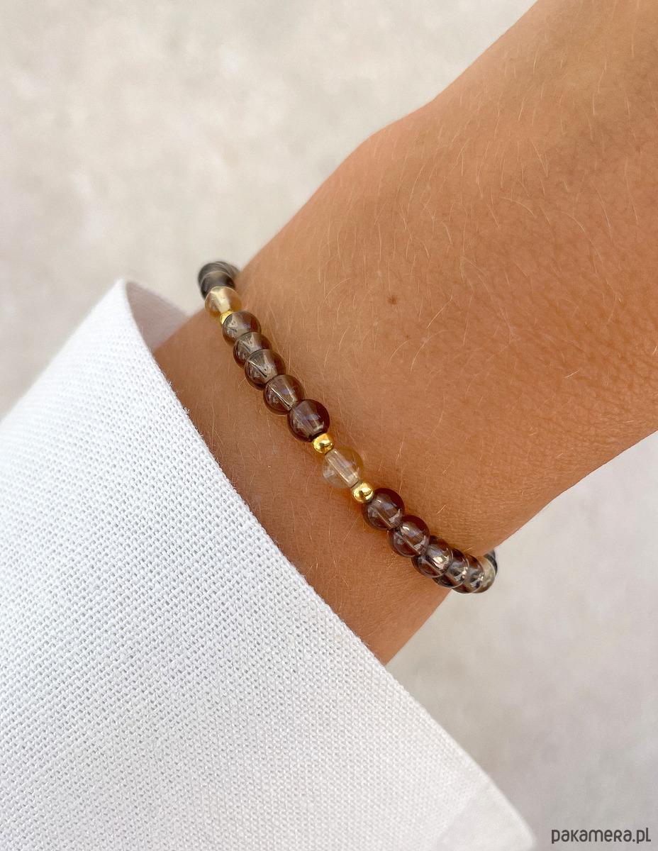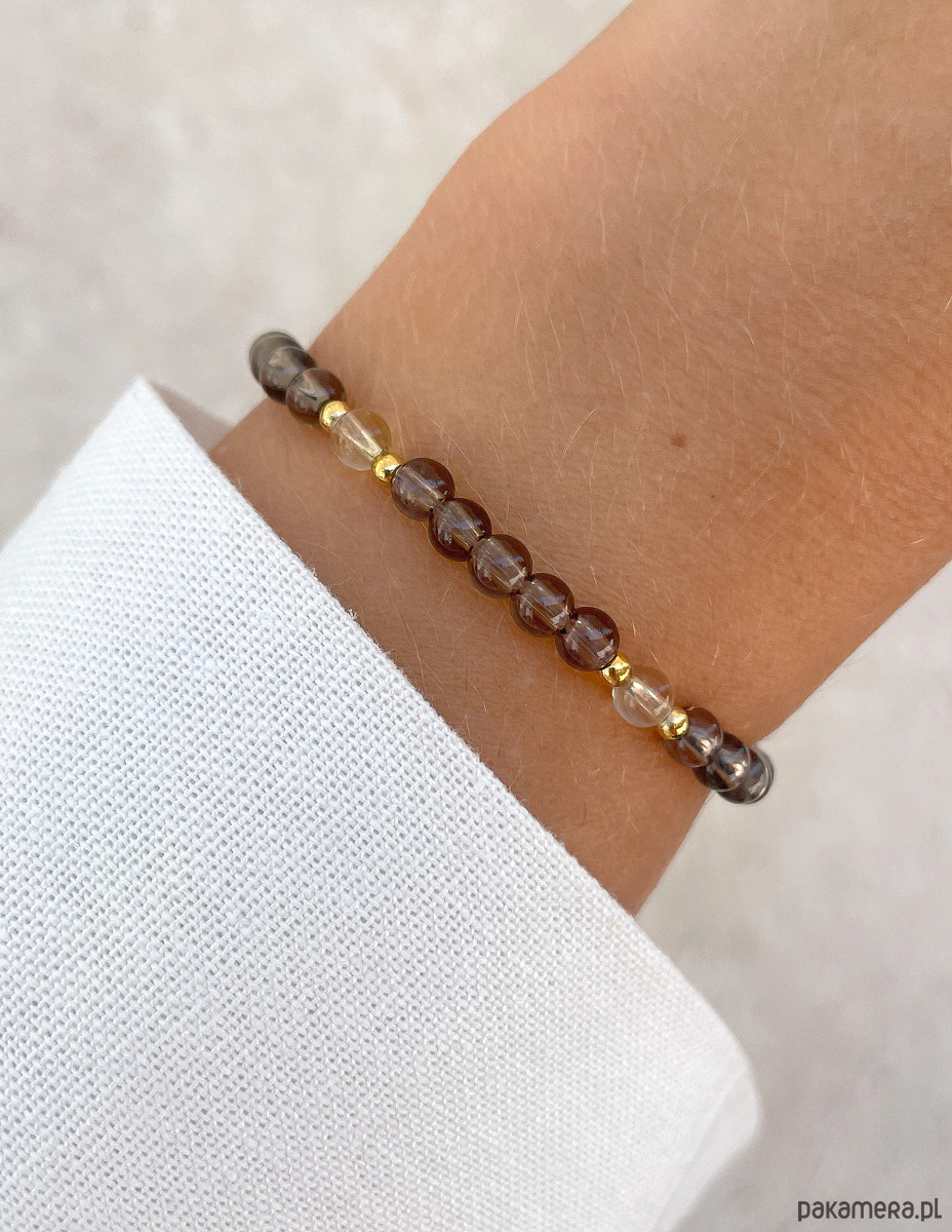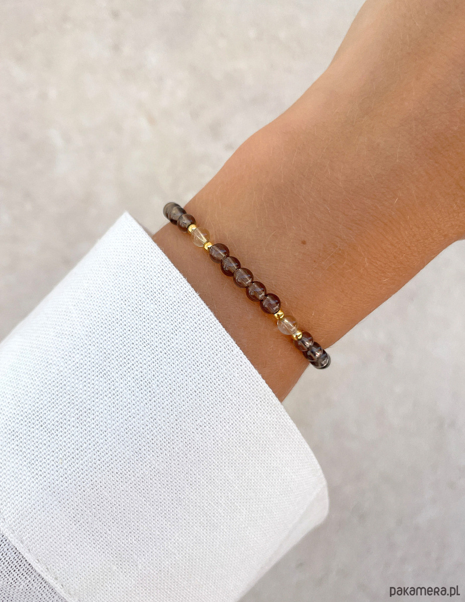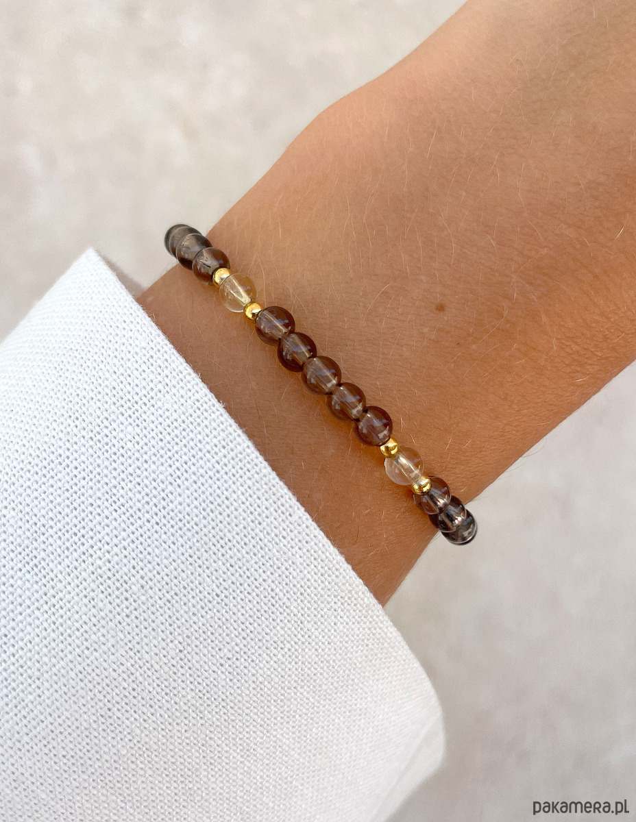 Bransoletka została wykonana z gładkich kuleczek kwarcu dymnego i cytrynu o średnicy około 4 mm. Ich powierzchnia zachwyca niepowtarzalnymi, brązowymi i żółtymi odcieniami, co sprawia, że każdy kamień jest jedyny w swoim rodzaju. Wzór dopełniają lśniące, złote kuleczki z hematytu o średnicy około 2,5 mm, które nadają całości wyrafinowanego i nowoczesnego charakteru. Dzięki wykorzystaniu wytrzymałej, elastycznej żyłki jubilerskiej, bransoletka jest nie tylko piękna, ale także niezwykle komfortowa w noszeniu.