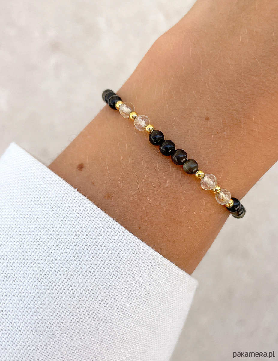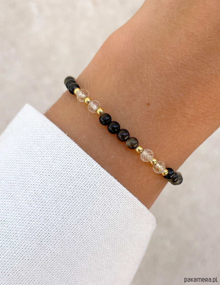 Bransoletka została wykonana z gładkich kuleczek obsydianu i fasetowanych kuleczek cytrynu, obie o średnicy około 4 mm. Ich powierzchnia zachwyca niepowtarzalnymi odcieniami brązu i żółci, co sprawia, że każdy kamień jest jedyny w swoim rodzaju. Wzór dopełniają lśniące, złote kuleczki z hematytu o średnicy około 2,5 mm, które nadają całości wyrafinowanego i nowoczesnego charakteru. Dzięki wykorzystaniu wytrzymałej, elastycznej żyłki jubilerskiej, bransoletka jest nie tylko piękna, ale także niezwykle komfortowa w noszeniu.