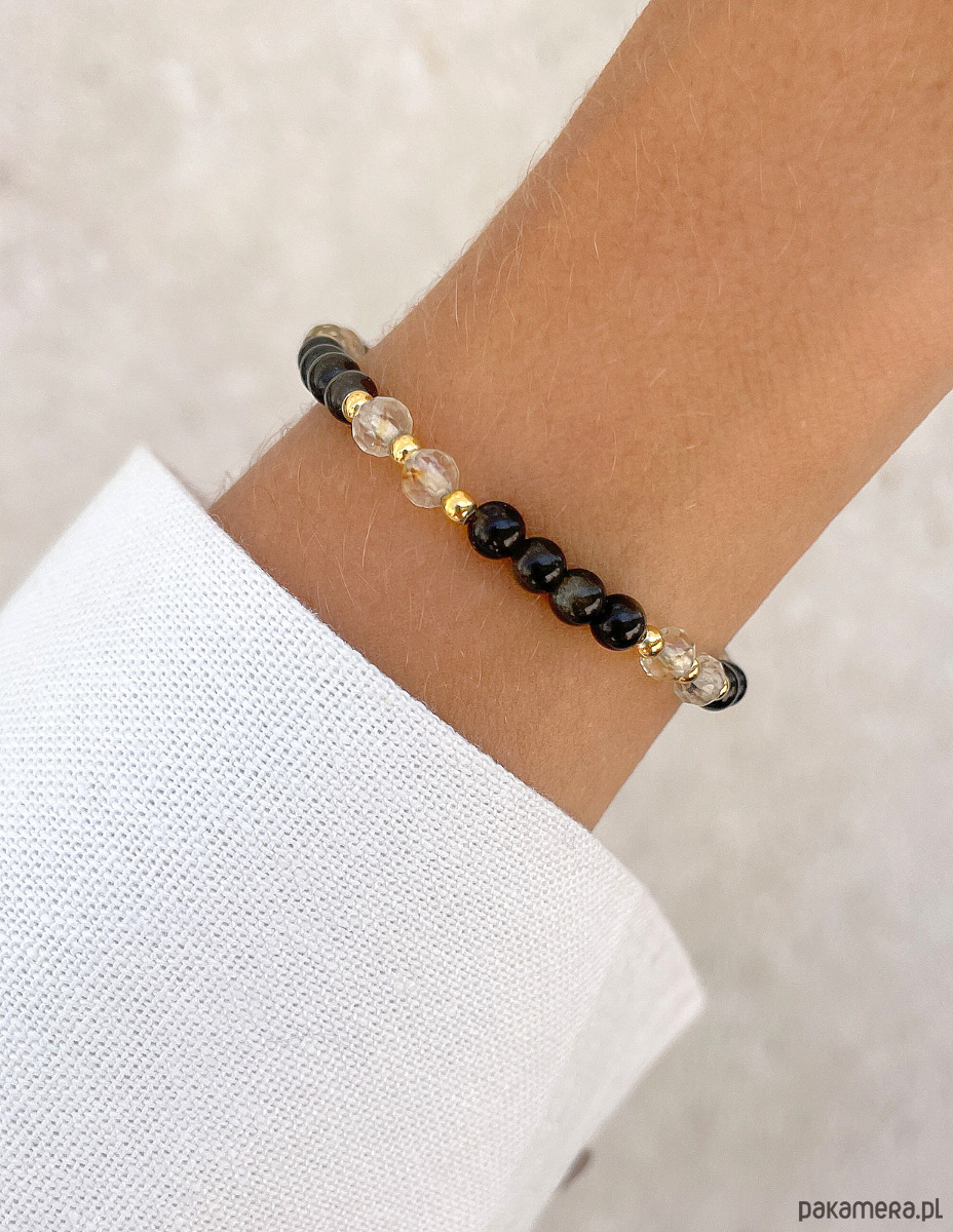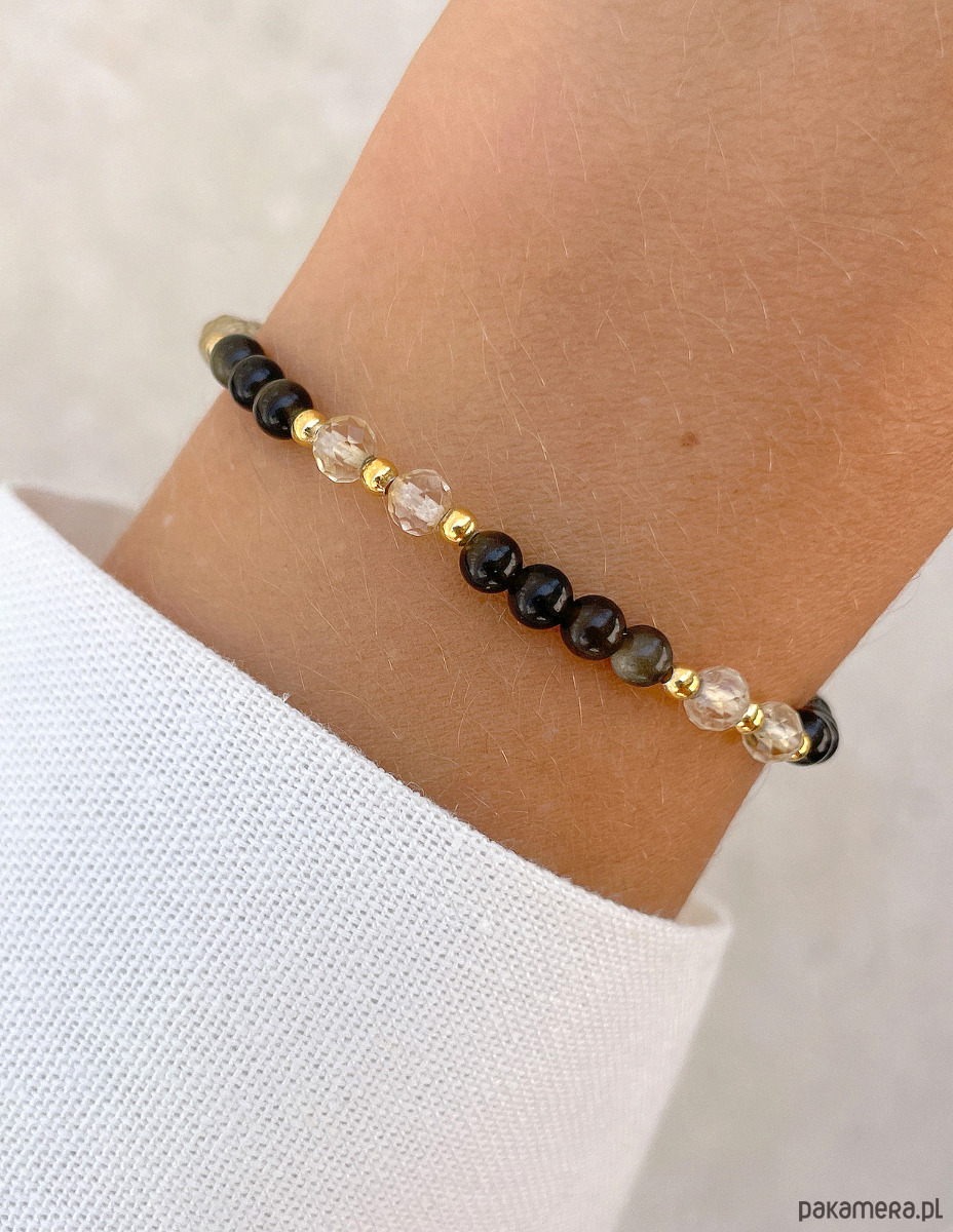 Cechy bransoletki:Kamień: obsydian, cytryn, hematyt (kolor złoty)Wielkość kamienia obsydian (kształt kamieni: kulki gładkie), cytryn (kształt kamieni: kulki fasetowane): ok. 4 mm Wielkość kamienia hematyt: ok. 2,5 mm Kolor: brązowy, żółty, złoty Materiał: wytrzymała elastyczna żyłka jubilerska