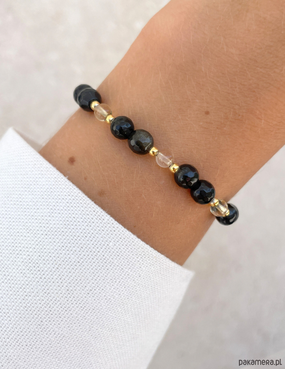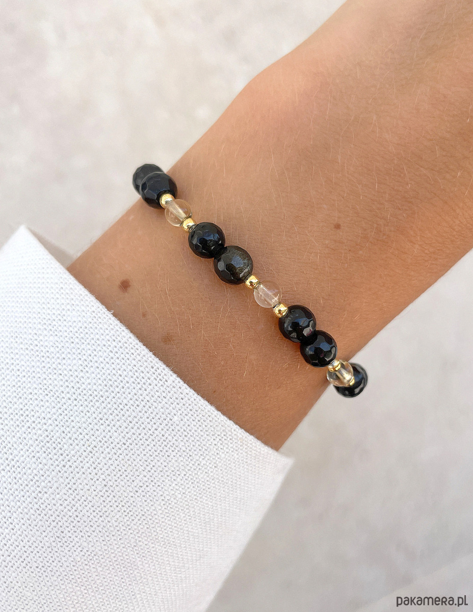 Cechy bransoletki:Kamień: obsydian, cytryn, hematyt (kolor złoty)Wielkość kamienia obsydian (kształt kamieni: kulki fasetowane): ok. 6 mm
