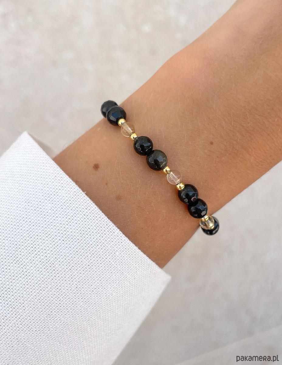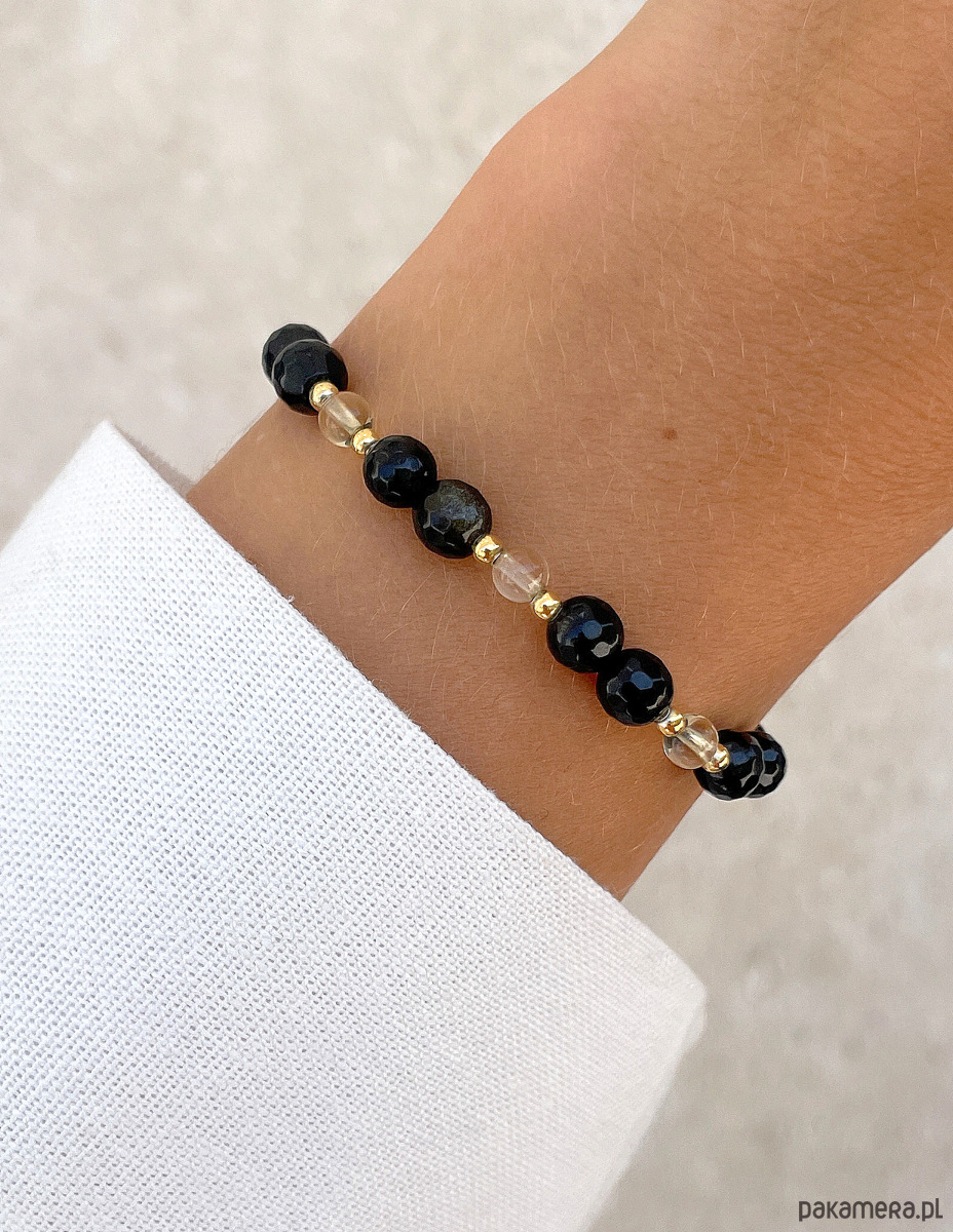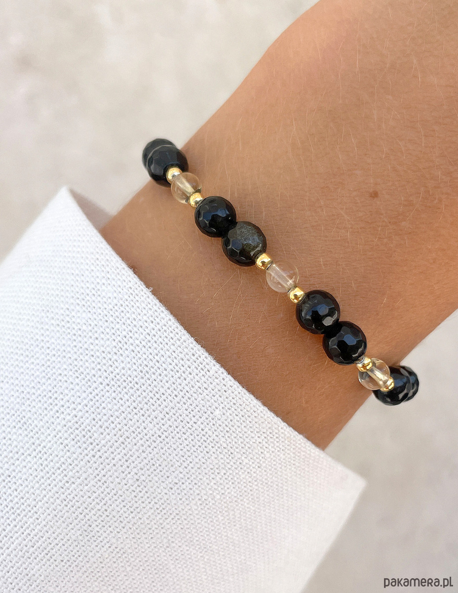 Bransoletka została wykonana z fasetowanych kuleczek obsydianu o średnicy około 6 mm, które tworzą wyrazistą i solidną bazę. Uzupełniają je gładkie kulki cytrynu o średnicy około 4 mm. Połączenie intensywnej czerni z jasnym, słonecznym odcieniem żółci nadaje bransoletce wyjątkowego charakteru, a każdy kamień jest jedyny w swoim rodzaju. Wzór dopełniają lśniące, złote kuleczki z hematytu o średnicy około 2,5 mm, które dodają całości wyrafinowanego i nowoczesnego akcentu.