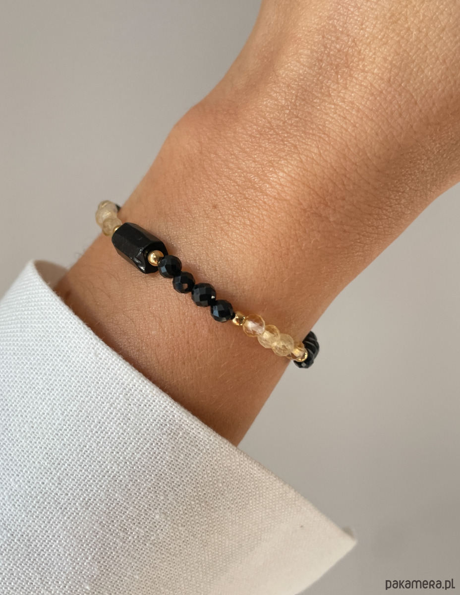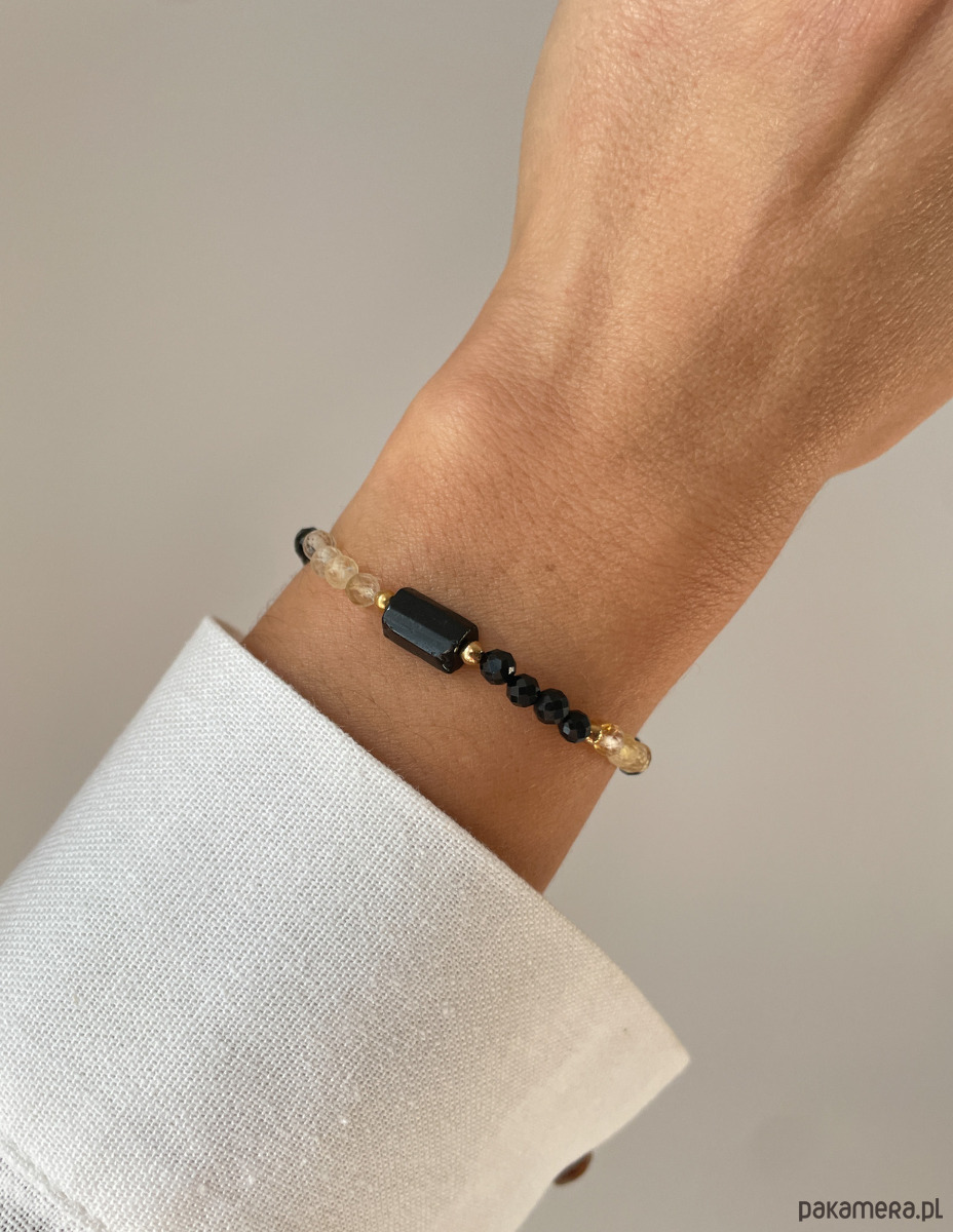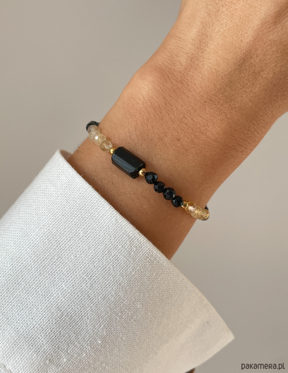 Cechy bransoletki:Kamień: czarny turmalin, cytryn, hematyt (kolor złoty)Wielkość kamienia czarny turmalin - belka: ok. 7 x 12 mm
