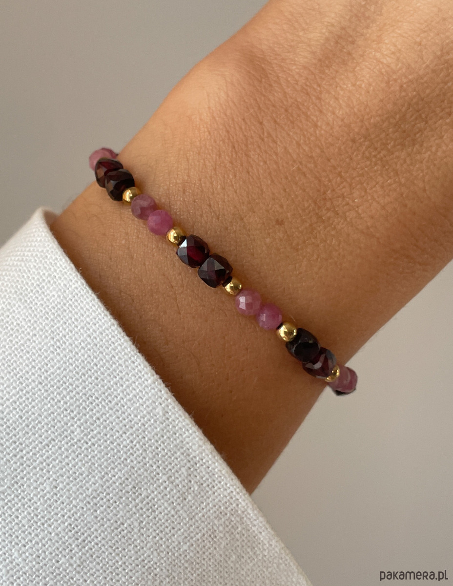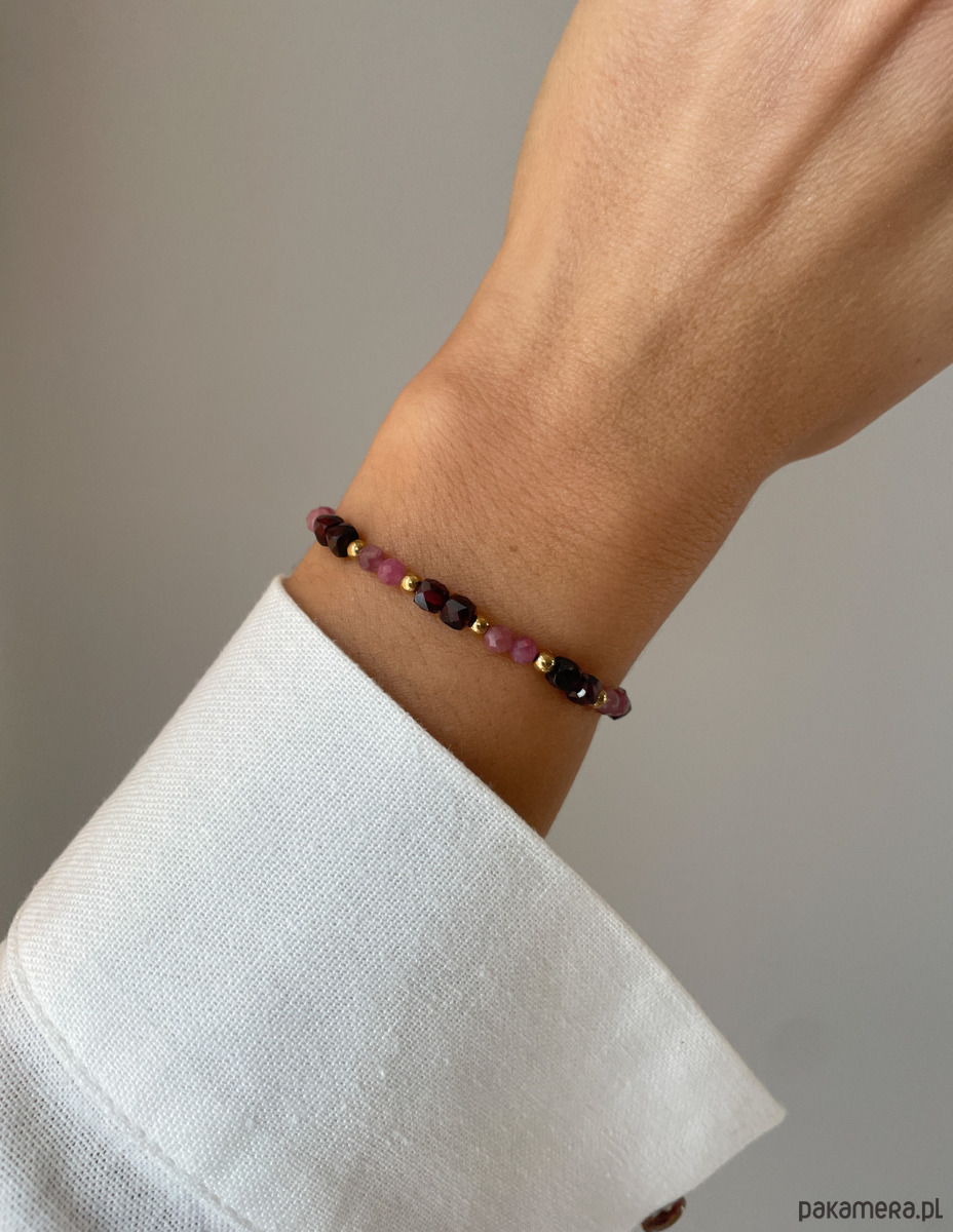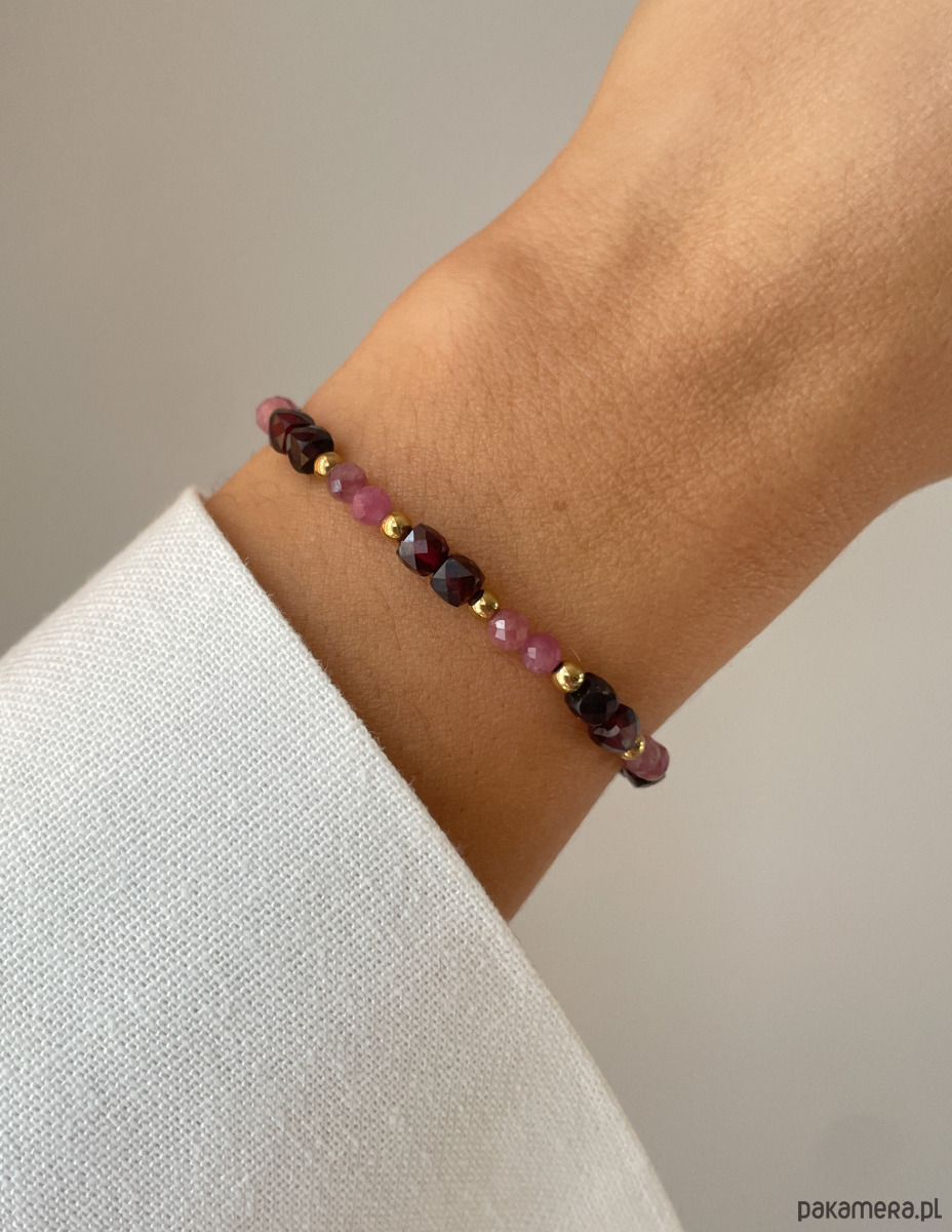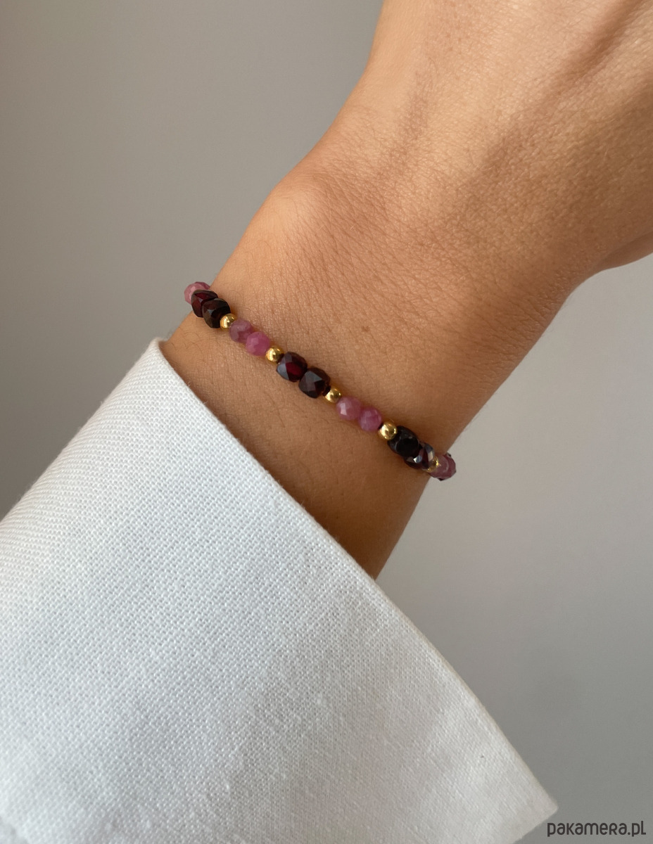 Bransoletka została wykonana na wytrzymałej, elastycznej żyłce jubilerskiej, co gwarantuje komfort codziennego noszenia oraz łatwość zakładania. Składa się z fasetowanych kamieni o wielkości ok. 4 mm (Różowy Turmalin i Granat), które pięknie pracują ze światłem. Całość została wykończona złotymi kuleczkami Hematytu (ok. 2,5-3 mm), nadającymi biżuterii luksusowego sznytu.