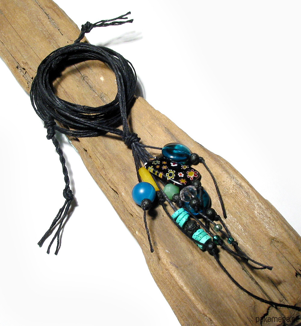 Autorski wisior wykonany na bazie czarnej przędzy lnianej.