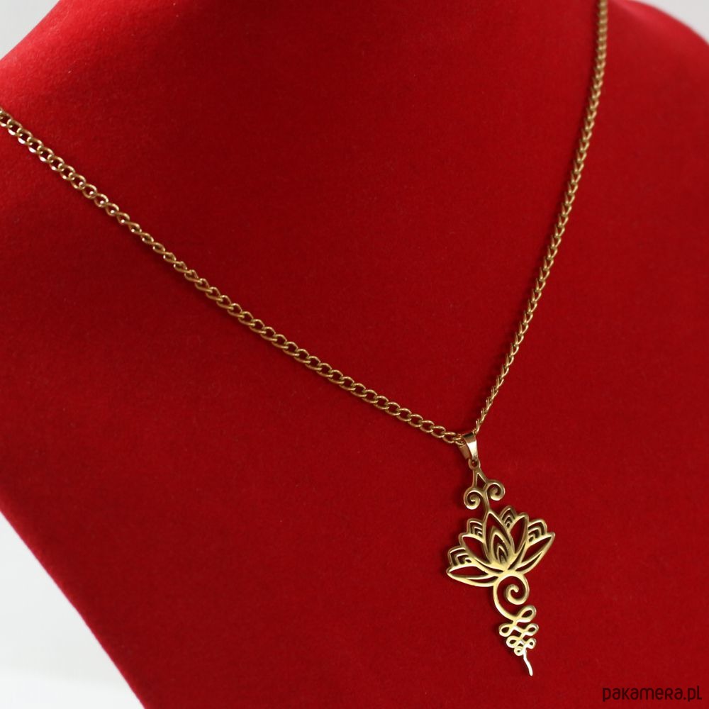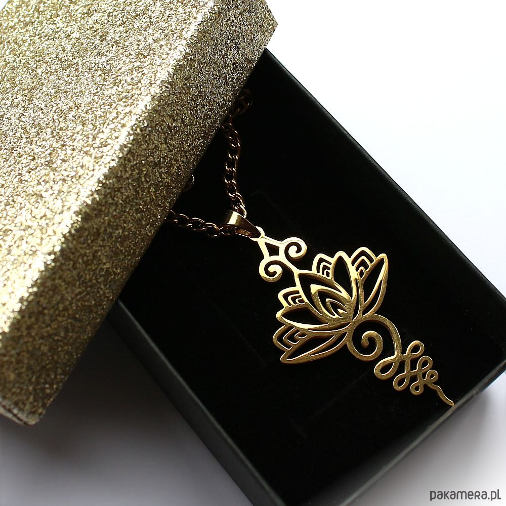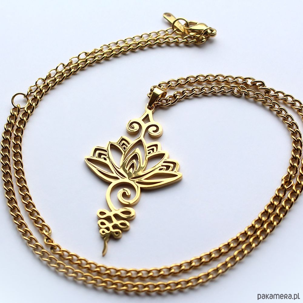 Energetyczny wisior z kwiatem lotosu wykonany ręcznie ze stali szlachetnej pozłacanej 24k złotem.