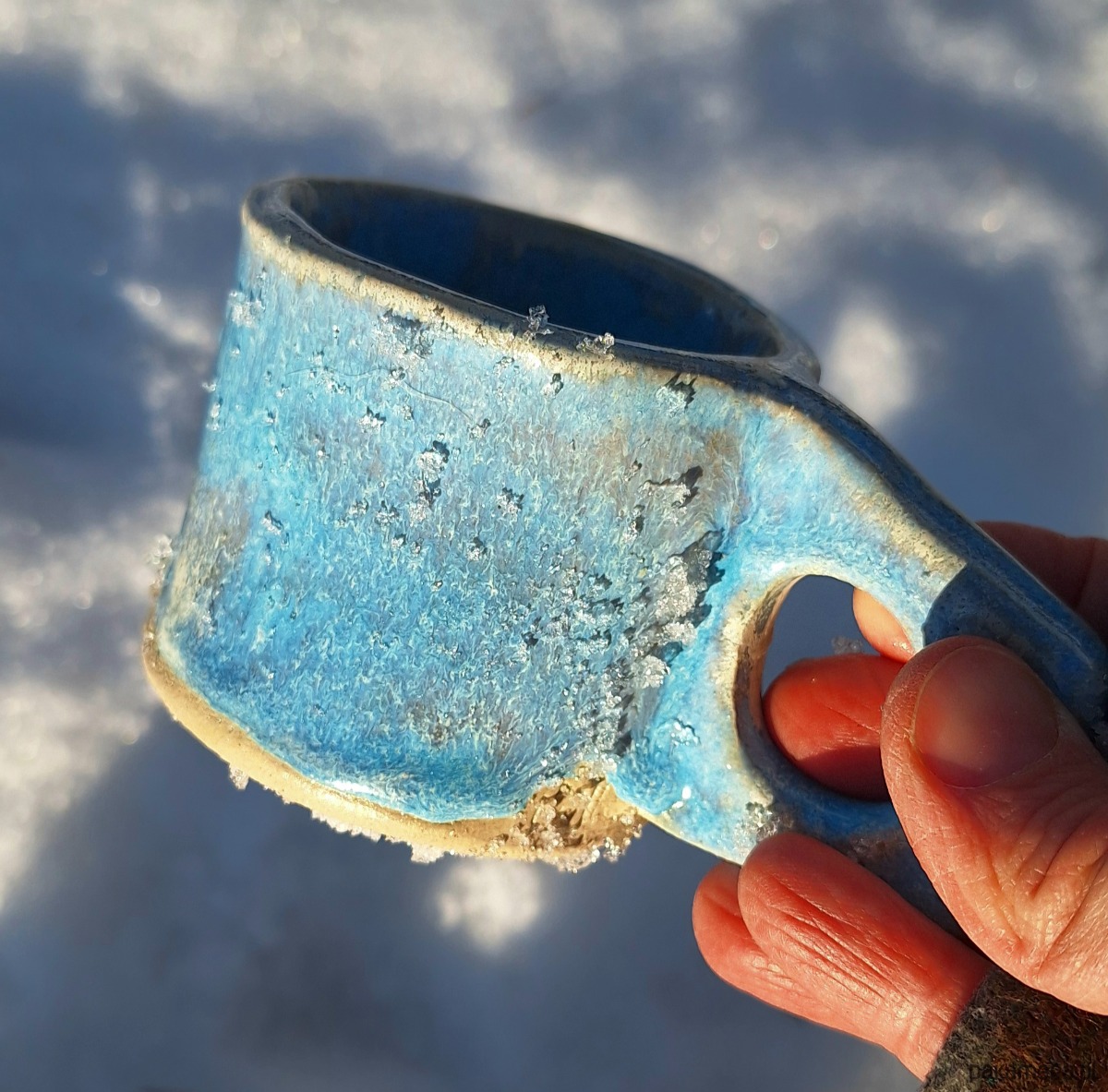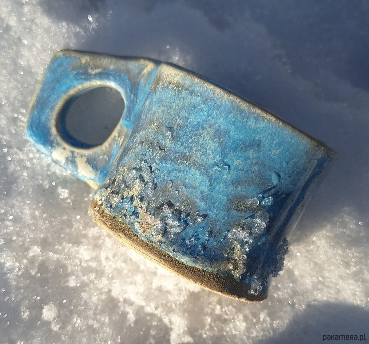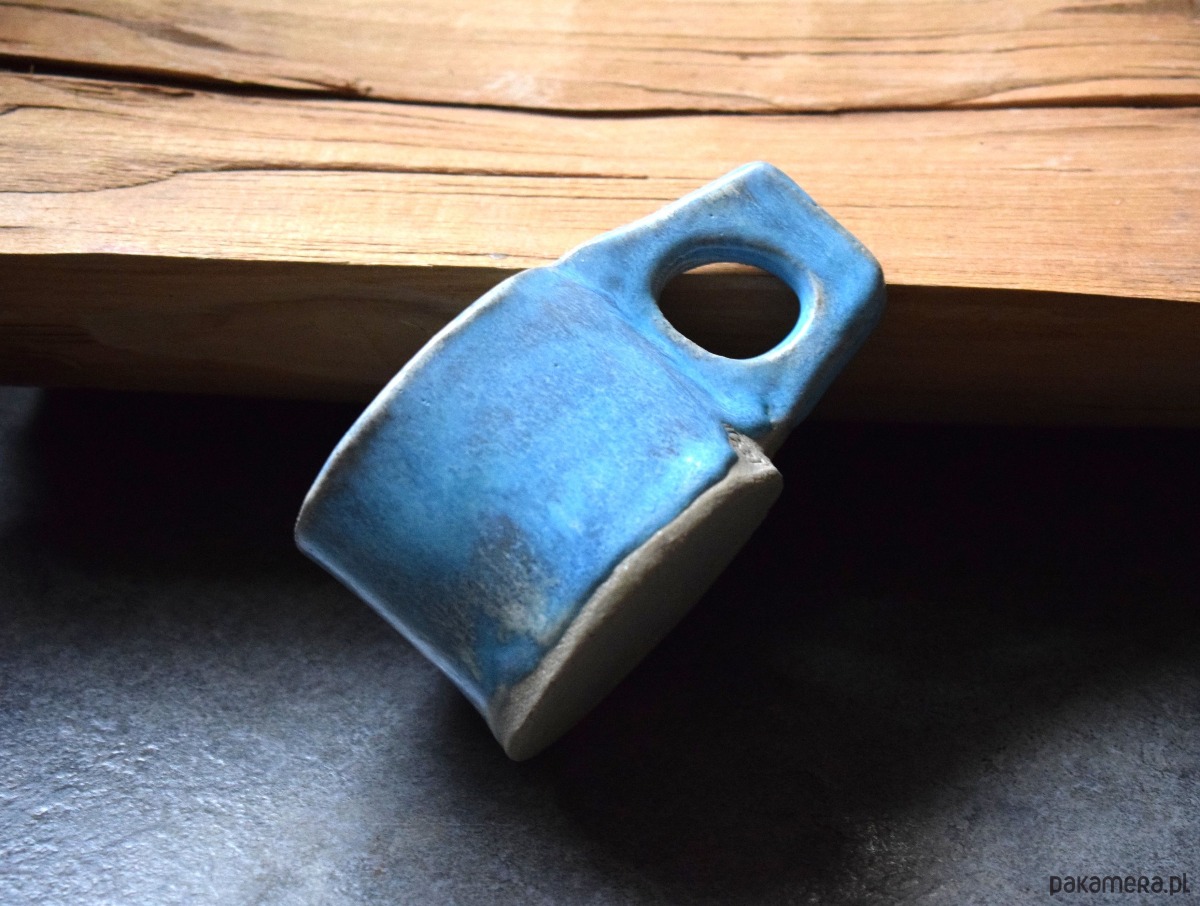 Ta filiżanka ma formę kubka z oryginalnym i wygodnym w użytkowaniu kształtem ucha. Zrobiłam ją ręcznie z jasnej gliny i wypaliłam w temperaturze 1230°C, żeby nadać jej najwyższą jakość i trwałość w codziennym użytkowaniu, a przy tym wydobyć głębię kolorów szkliw. Jest unikatowa, bo wykonana BEZ UŻYCIA FORMY. Każda następna z tej serii będzie się już zatem różniła od poprzedniej.