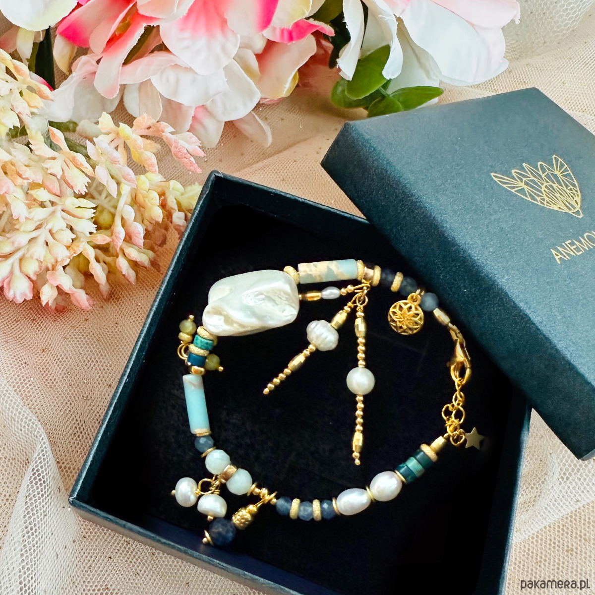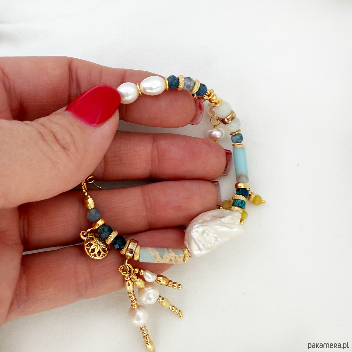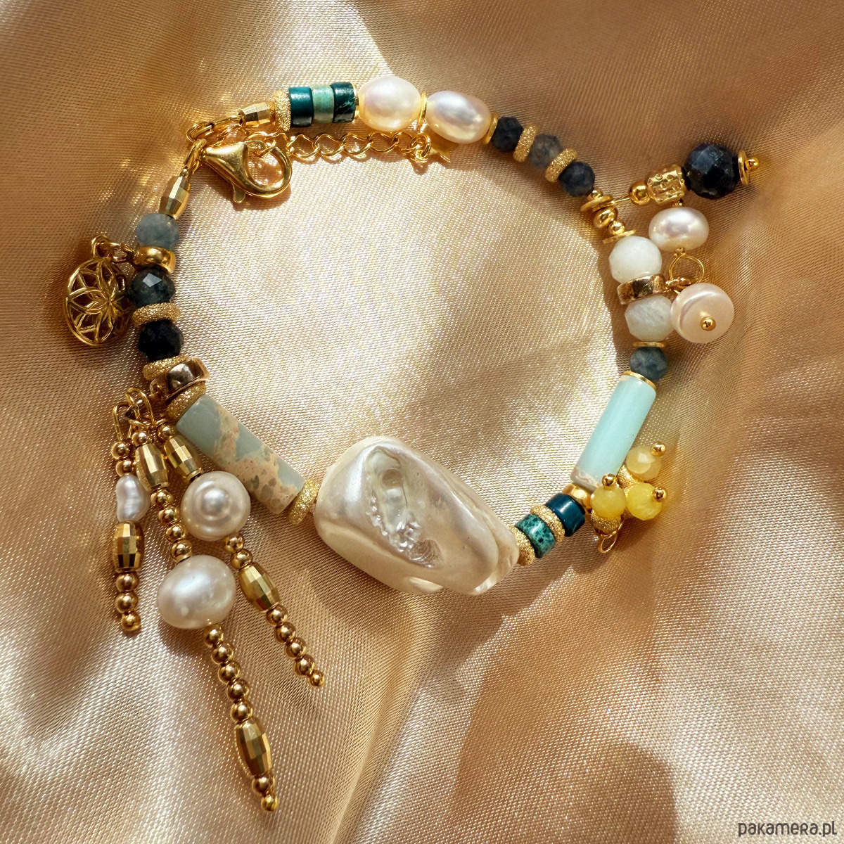 To nie jest zwykła bransoletka – to manifest stylu, duszy i kobiecej wolności. Ręcznie wykonana z pasją i dbałością o każdy szczegół, łączy różnorodne naturalne kamienie, bogactwo faktur i złocone detale, tworząc pełną życia, artystyczną kompozycję.