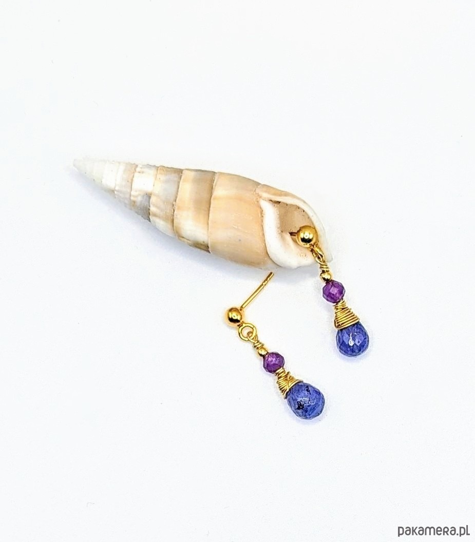 Kolczyki z pozłacanego srebra z fioletowymi kamieniami: kropla tanzanitu zestawiona z kulistym ametystem. Kamienie pięknie kumulują światło, lekko mienią się. Zostały zamocowanie na sztyfcie z kulką. Lekkie w formie, świeże, kobiece.
