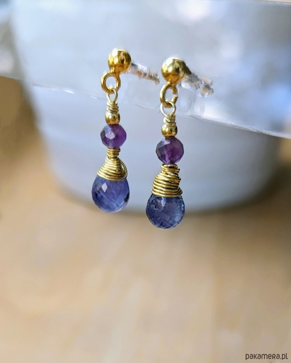 Kolczyki z pozłacanego srebra z fioletowymi kamieniami: kropla tanzanitu zestawiona z kulistym ametystem. Kamienie pięknie kumulują światło, lekko mienią się. Zostały zamocowanie na sztyfcie z kulką. Lekkie w formie, świeże, kobiece.