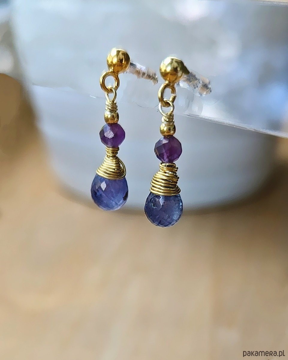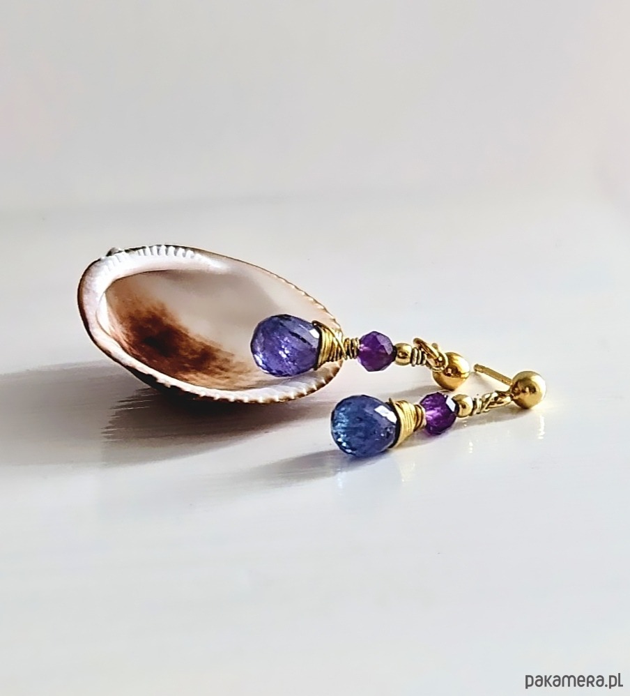 Kolczyki z pozłacanego srebra z fioletowymi kamieniami: kropla tanzanitu zestawiona z kulistym ametystem. Kamienie pięknie kumulują światło, lekko mienią się. Zostały zamocowanie na sztyfcie z kulką. Lekkie w formie, świeże, kobiece.