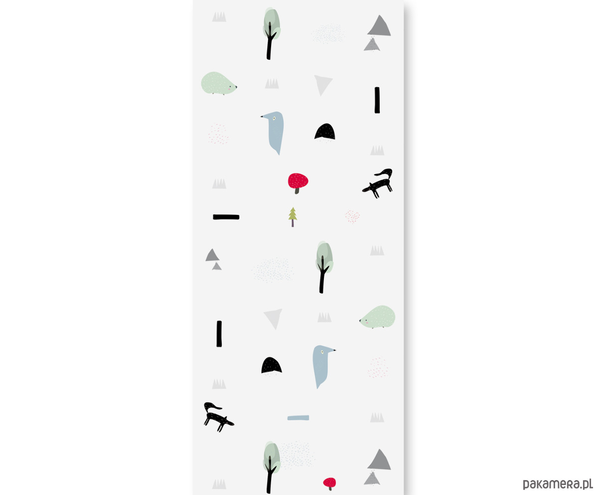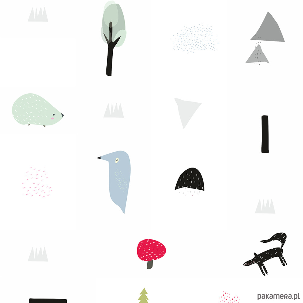 Tapeta dla dzieci bajka-Fairy Tale ma bajkowy, minimalistyczny styl z delikatnymi, rysowanymi ilustracjami na białym tle. Wzór zawiera różne elementy leśne, takie jak drzewa, góry i niewielkie kształty przypominające zarośla. Pojawiają się także urocze zwierzęta – jasnoniebieski ptak, jasnozielony jeżyk oraz czarny wilk, który nadaje tapecie nieco tajemniczy klimat. Ta dekoracja ścienna jest dla miłośników prostoty i harmonii. Motyw wzoru z prostych, symbolicznych elementów wprowadza do przestrzeni naturalny, przyjazny nastrój. Sprzyja to spokojowi i koncentracji dziecka.