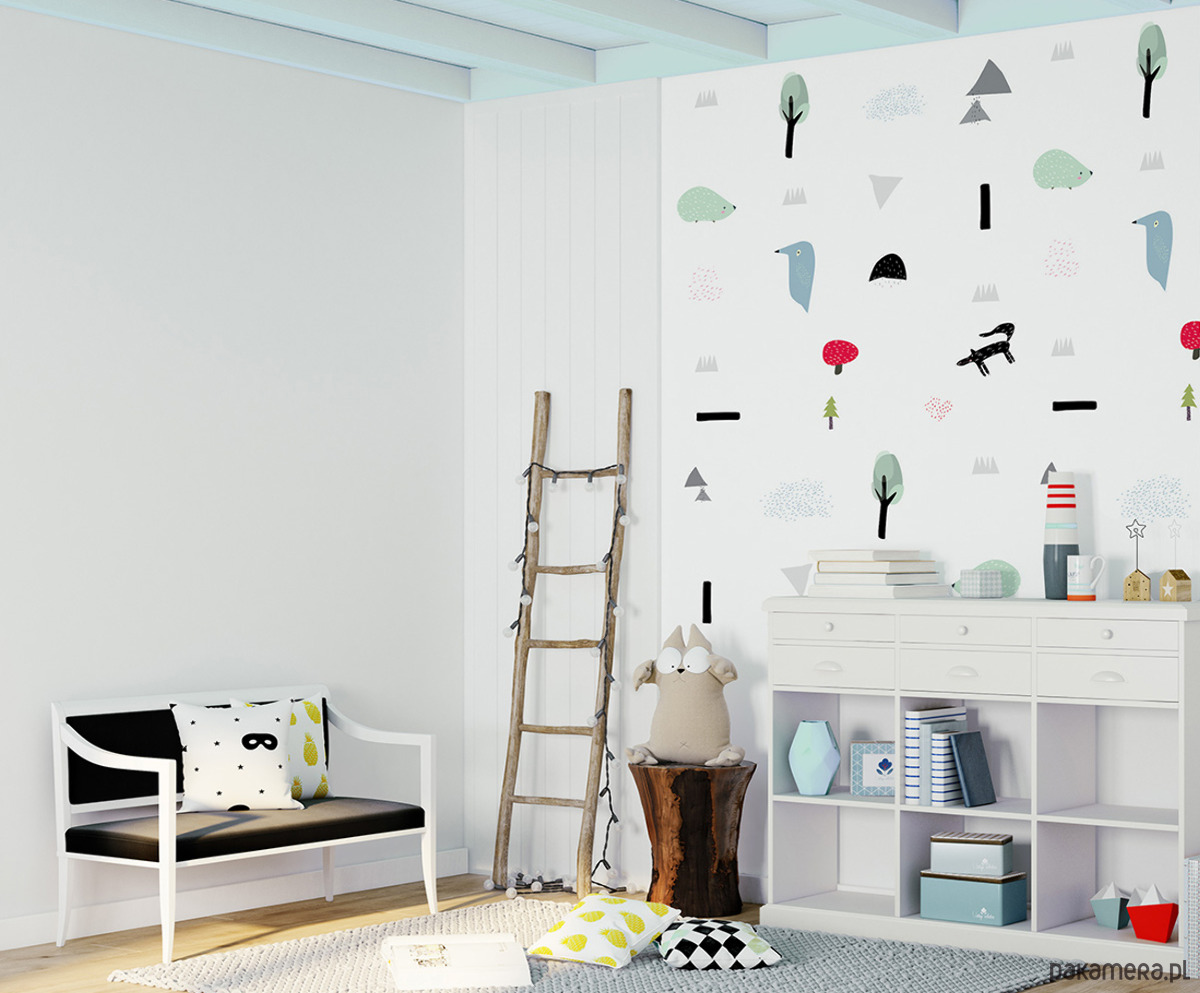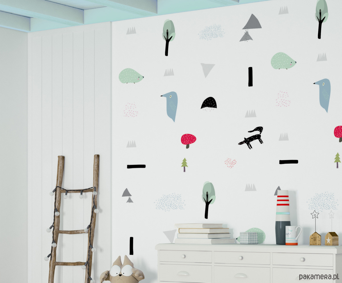 Tapeta dla dzieci bajka-Fairy Tale ma bajkowy, minimalistyczny styl z delikatnymi, rysowanymi ilustracjami na białym tle. Wzór zawiera różne elementy leśne, takie jak drzewa, góry i niewielkie kształty przypominające zarośla. Pojawiają się także urocze zwierzęta – jasnoniebieski ptak, jasnozielony jeżyk oraz czarny wilk, który nadaje tapecie nieco tajemniczy klimat. Ta dekoracja ścienna jest dla miłośników prostoty i harmonii. Motyw wzoru z prostych, symbolicznych elementów wprowadza do przestrzeni naturalny, przyjazny nastrój. Sprzyja to spokojowi i koncentracji dziecka.