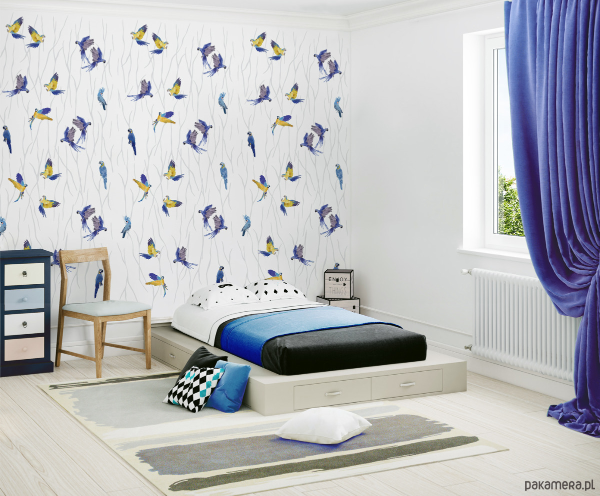 Tapeta dla dzieci Papugi ( Colours of the Nature ) stworzy cudowny klimat, nadając niezwykłej przytulności oraz wyjątkowego charakteru we wnętrzu. Przyjazny wzór sprzyja wyciszeniu przez co idealnie sprawdzi się w pokoju dziecka oraz nastolatka. Już jeden pas może nadać szczególny charakter, a przy większych powierzchniach pięknie prezentuje się na jednej czy dwóch ścianach. Elementami wzoru na tapecie są latające kolorowe papugi.