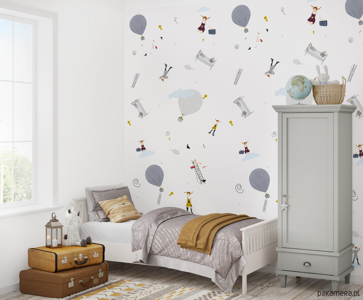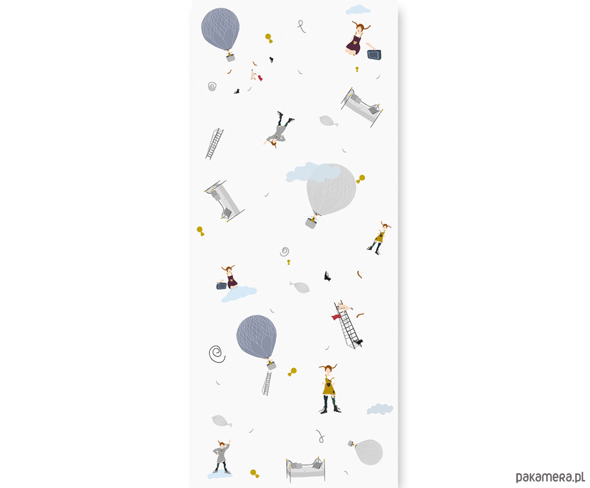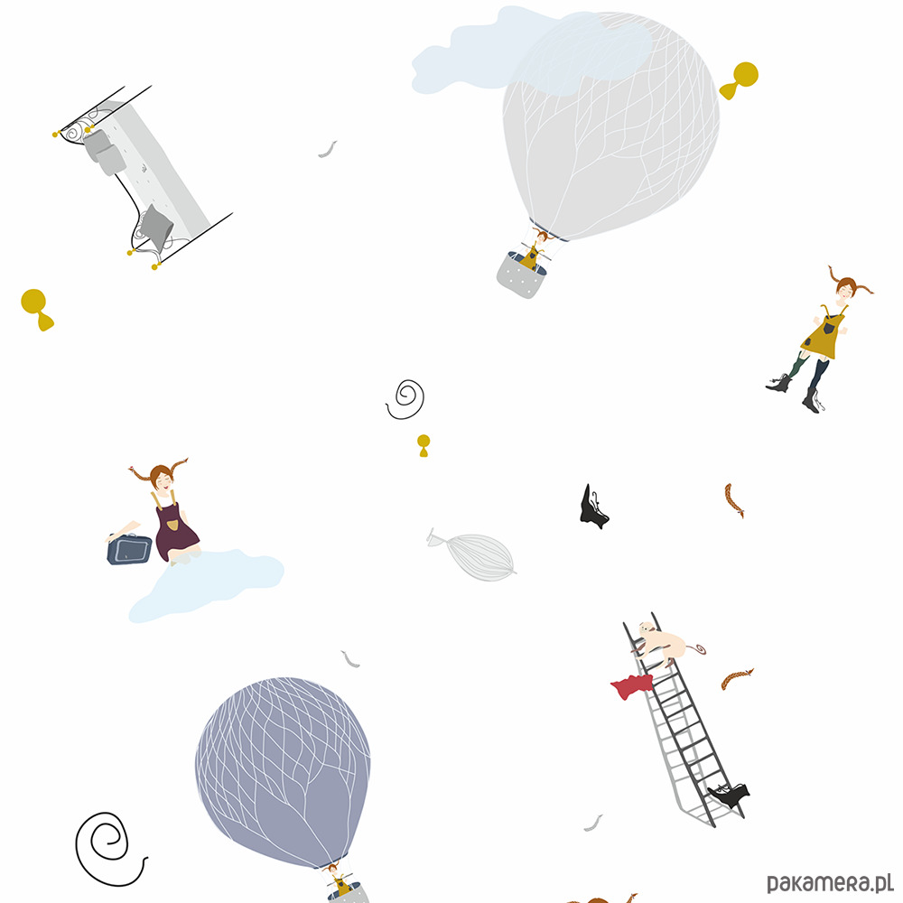 Tapeta dla dzieci Balony ( Play with US ) stworzy cudowny klimat, nadając wyjątkowego charakteru we wnętrzu. Przyjazny wzór sprzyja wyciszeniu przez co idealnie sprawdzi się w pokoju dziecięcym. Już jeden pas może nadać szczególny charakter, a przy większych powierzchniach pięknie prezentuje się na jednej czy dwóch ścianach. Grafika zawiera szare i niebieskie balony oraz latające łóżko, drabinki, małpkę i postać figlarnej dziewczynki. Elementy są nieregularnie rozrzucone. Kolorystyka tapety zachowana jest w szarości, tylko dodatki rozweselają kolorami tj. czerwony, musztardowy, błękitny, ciemny niebieski. Tapeta posiada białe tło.