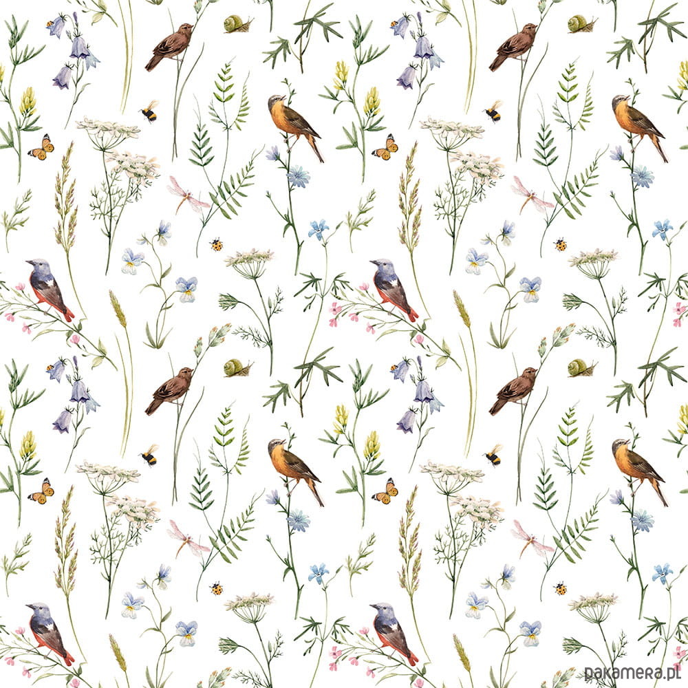 Jeden z naszych najukochańszych wzorów, przestawiający delikatne polne kwiaty i ptaszki, bogate w szczegóły i delikatne kolory. Widok tych pięknych detali przywodzi na myśl beztroskę, radość, wolność, zapach świeżo pieczonego chleba, ćwierkanie ptaków o poranku, błogość.