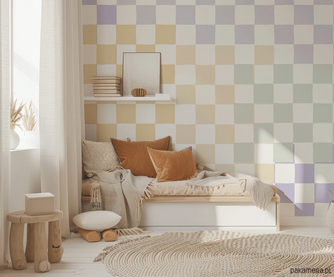 Wnętrze z tapetą „Colorful Chess” nabiera wyjątkowego, ciepłego charakteru – idealnie pasuje do naturalnych materiałów, jasnego drewna i tekstyliów w kolorach beżu czy karmelu. Tapeta pięknie prezentuje się w pokoju dziecka, przedszkolu czy sali zabaw, tworząc spokojne, pełne światła tło dla codziennych aktywności i kreatywnych zabaw.