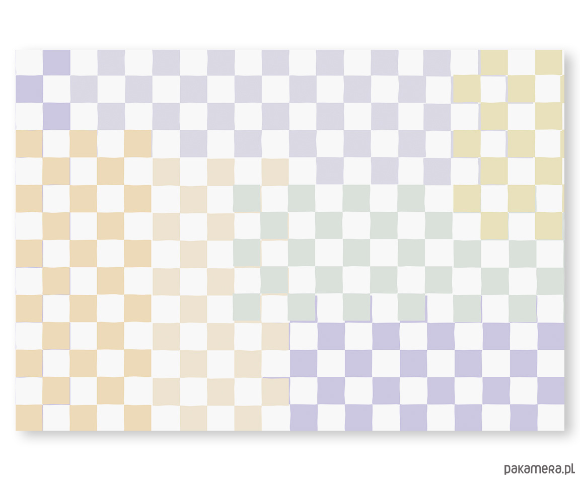Tapeta Szachownica „Colorful Chess” to dekoracja ścienna w kwadraty w odcieniach masełkowego żółtego, lawendowego fioletu, miętowej zieleni i pastelowego pomarańczu subtelnie się przenikają, tworząc spójną i nowoczesną kompozycję.