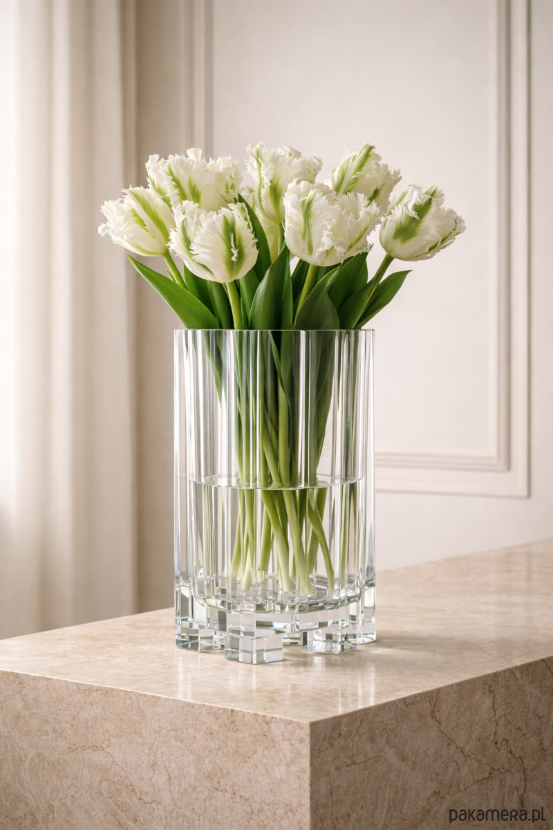 To forma, która świetnie prezentuje się zarówno jako wazon, jak i rzeźba światła we wnętrzu modernistycznym.