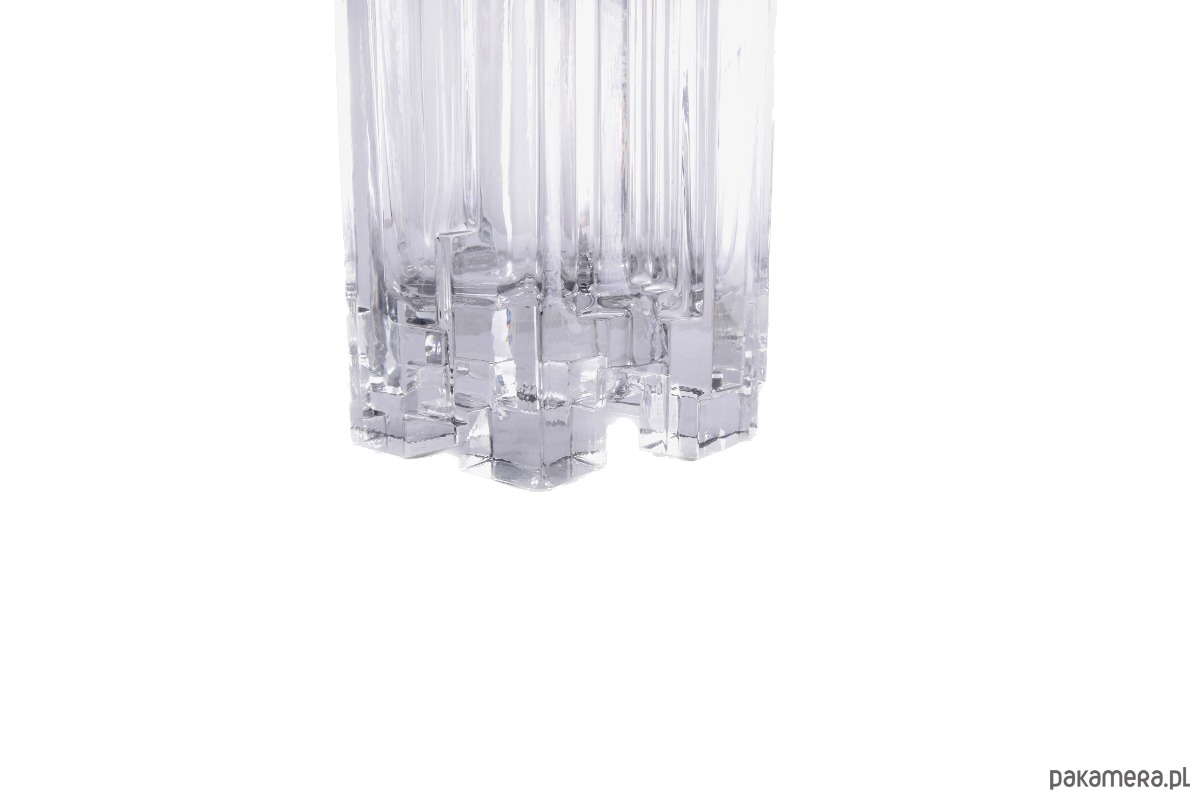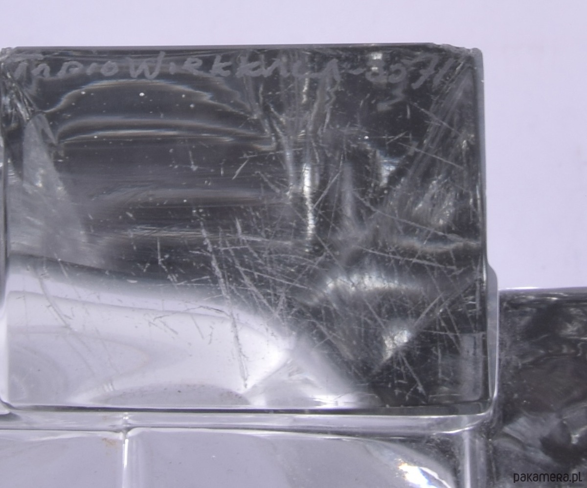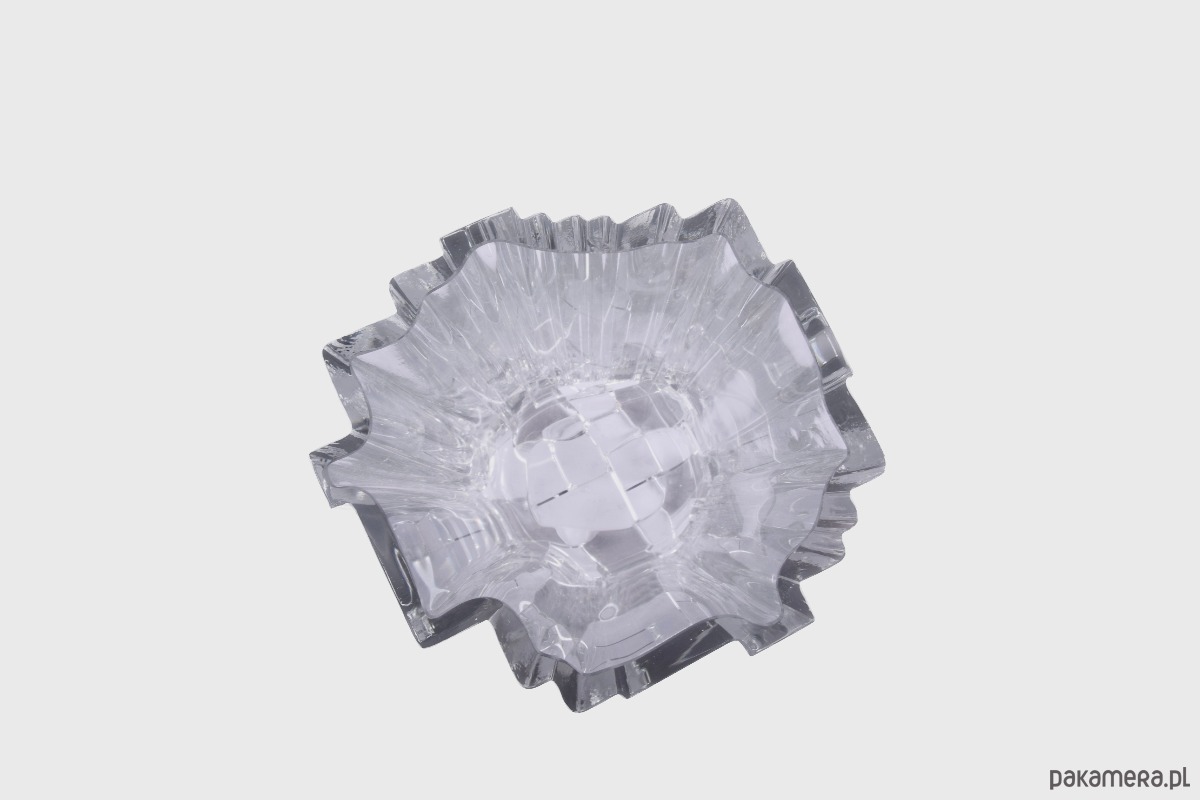 Imponująca, ciężka forma wykonana z masywnego, bezbarwnego szkła o charakterystycznej strukturze „ice glass”.