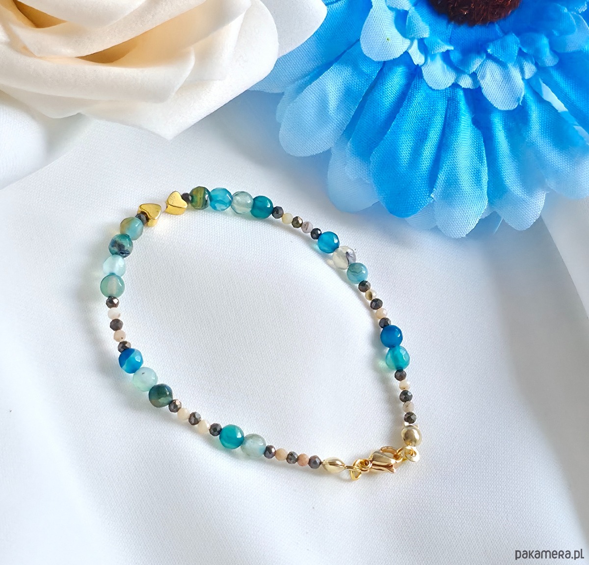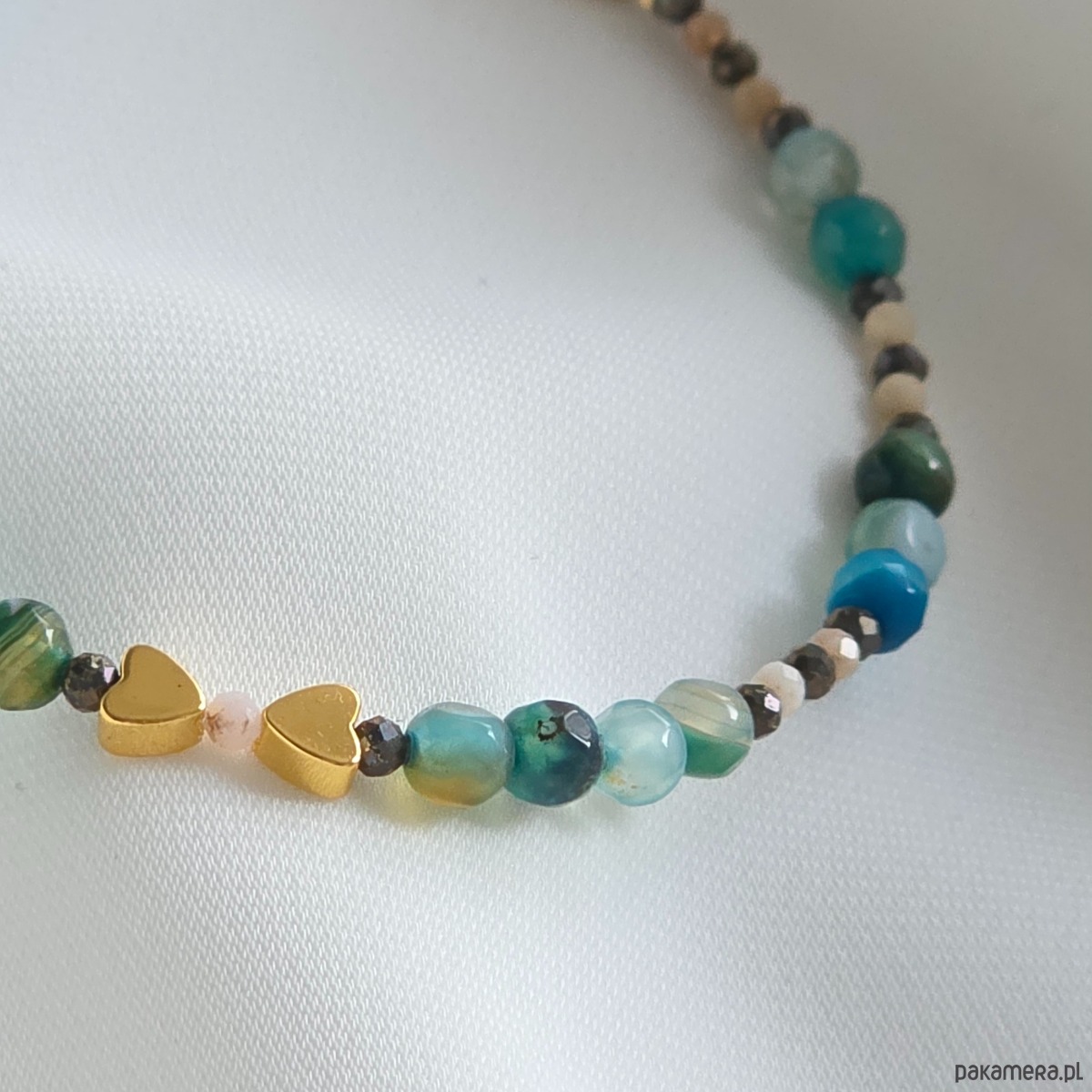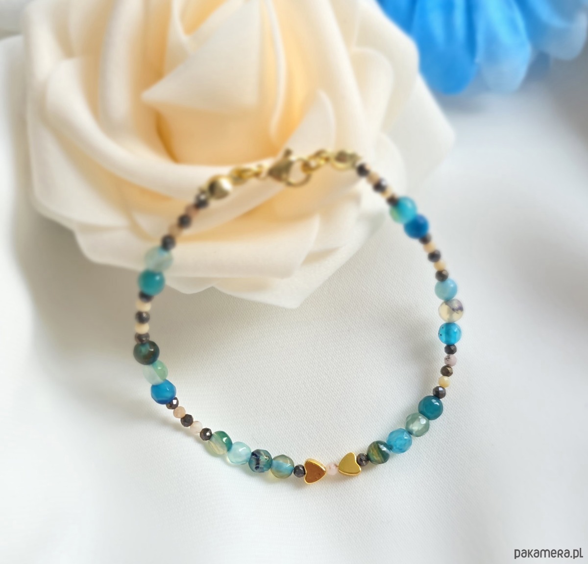 • Materiały : Opal różowy kulka fasetowana 2 mm, Piryt kulki fasetowane 2,5 mm, Agat niebieski kulka fasetowana 4 mm, Hematyt przekładka serce płaskie light gold 3,5 mm, żyłka wędkarską transparentna