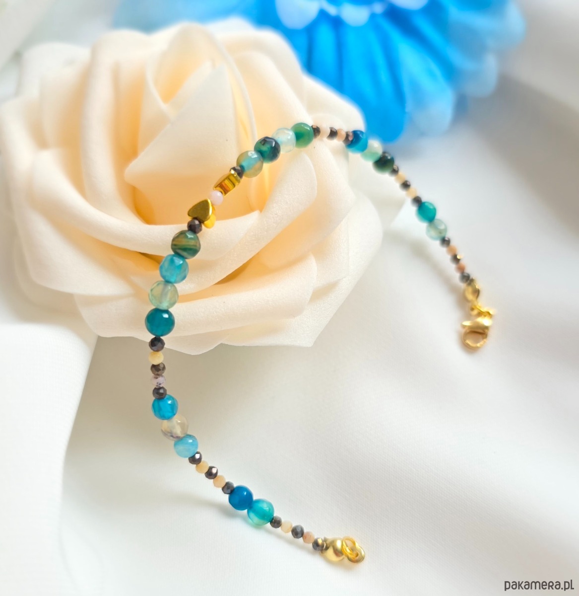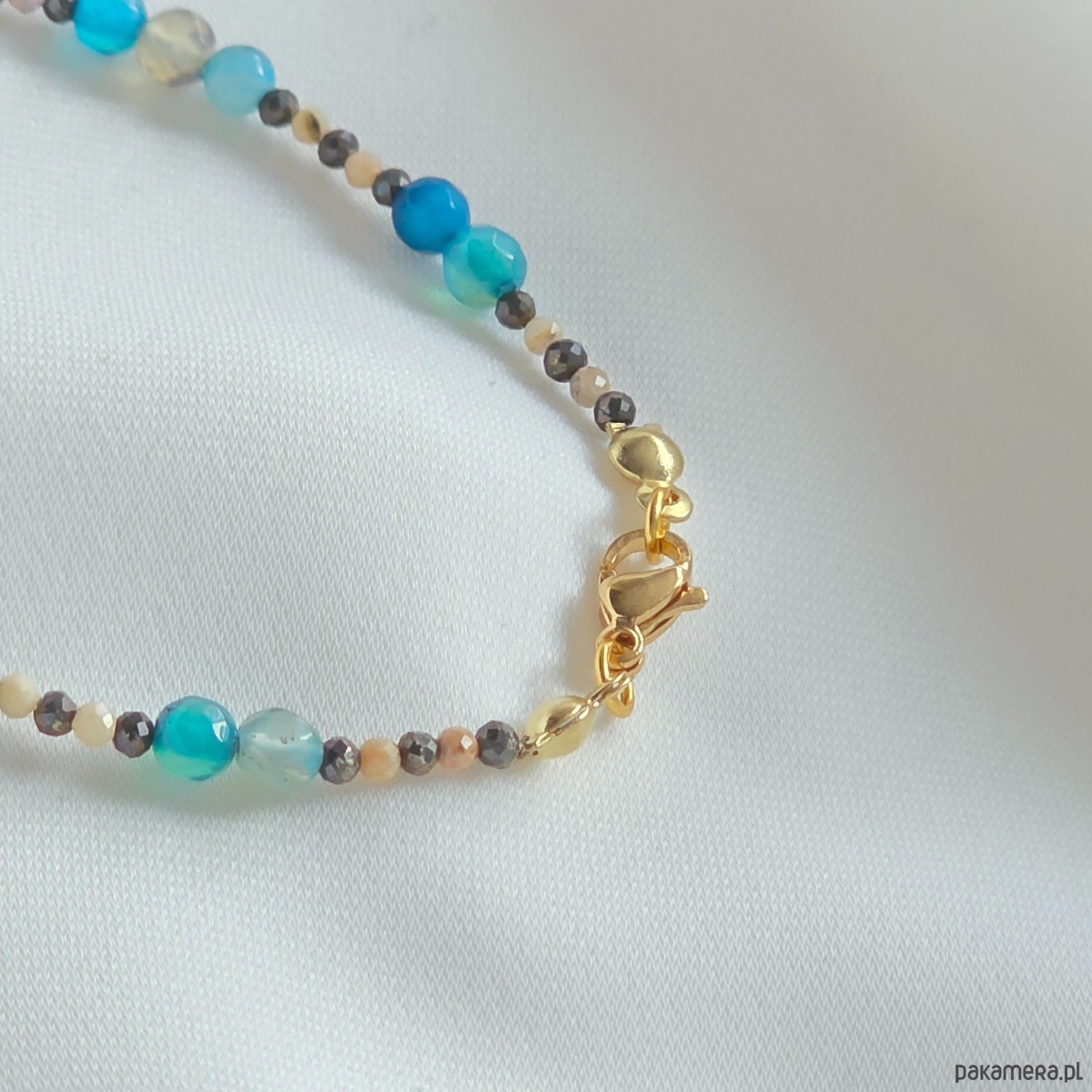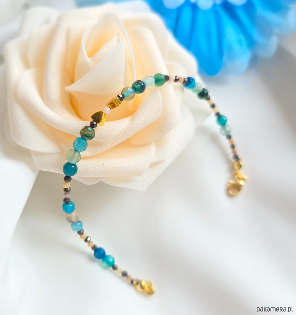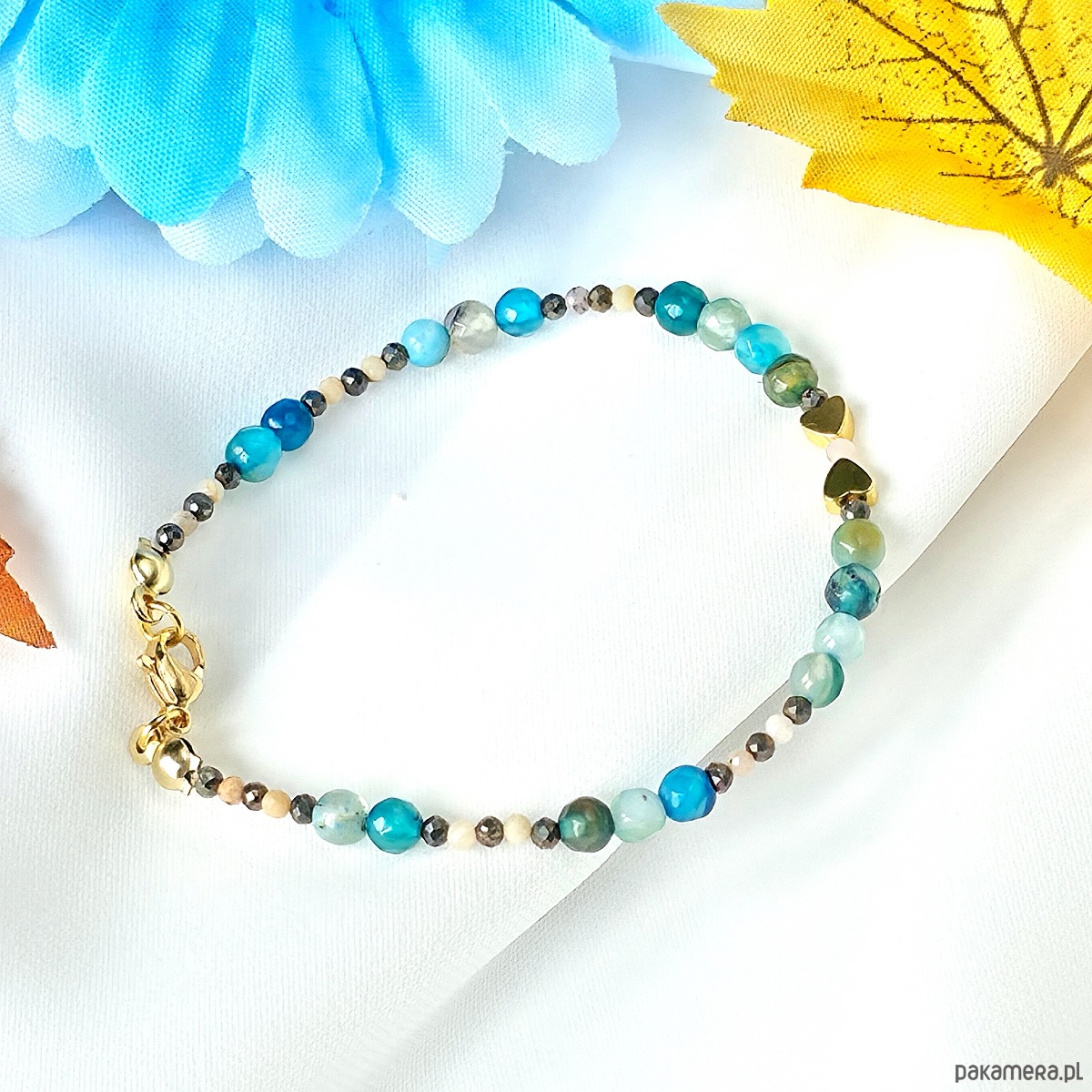 • Materiały : Opal różowy kulka fasetowana 2 mm, Piryt kulki fasetowane 2,5 mm, Agat niebieski kulka fasetowana 4 mm, Hematyt przekładka serce płaskie light gold 3,5 mm, żyłka wędkarską transparentna