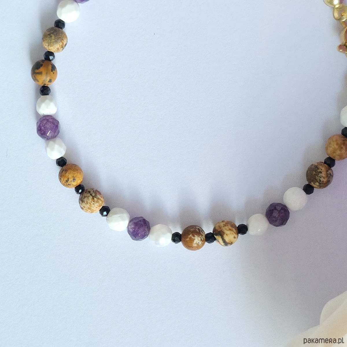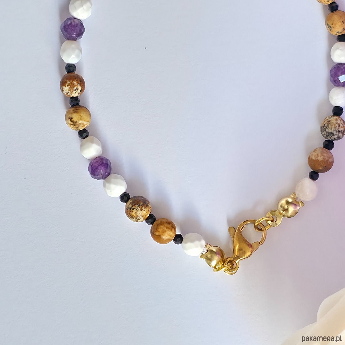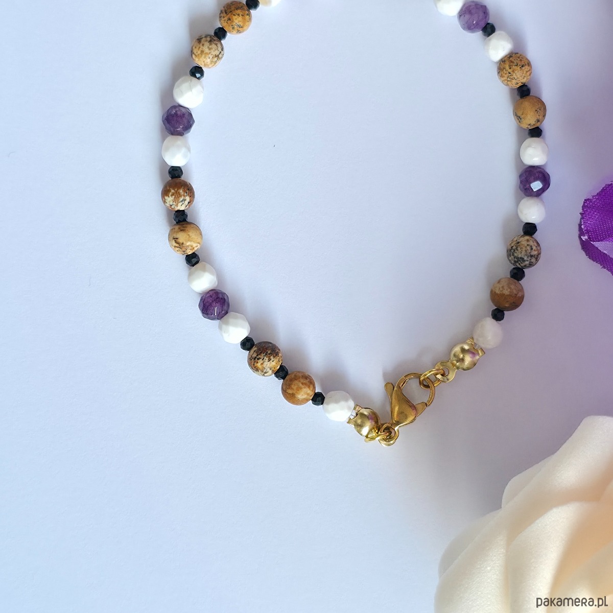 • Materiały : Agat biały 4 mm, Czarny turmalin 2 mm, Jadeit fioletowy 4,5 mm, Jaspis krajobrazowy 4 mm, żyłka wędkarską Fluorocarbon 0.35 mm, transparentna