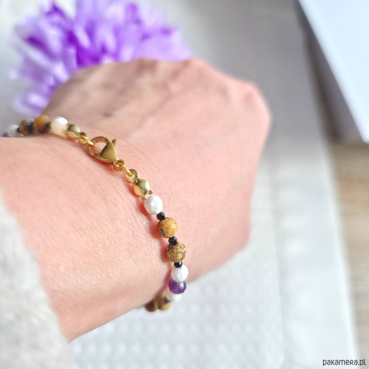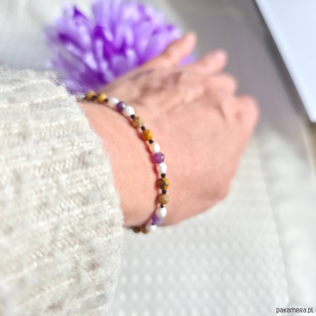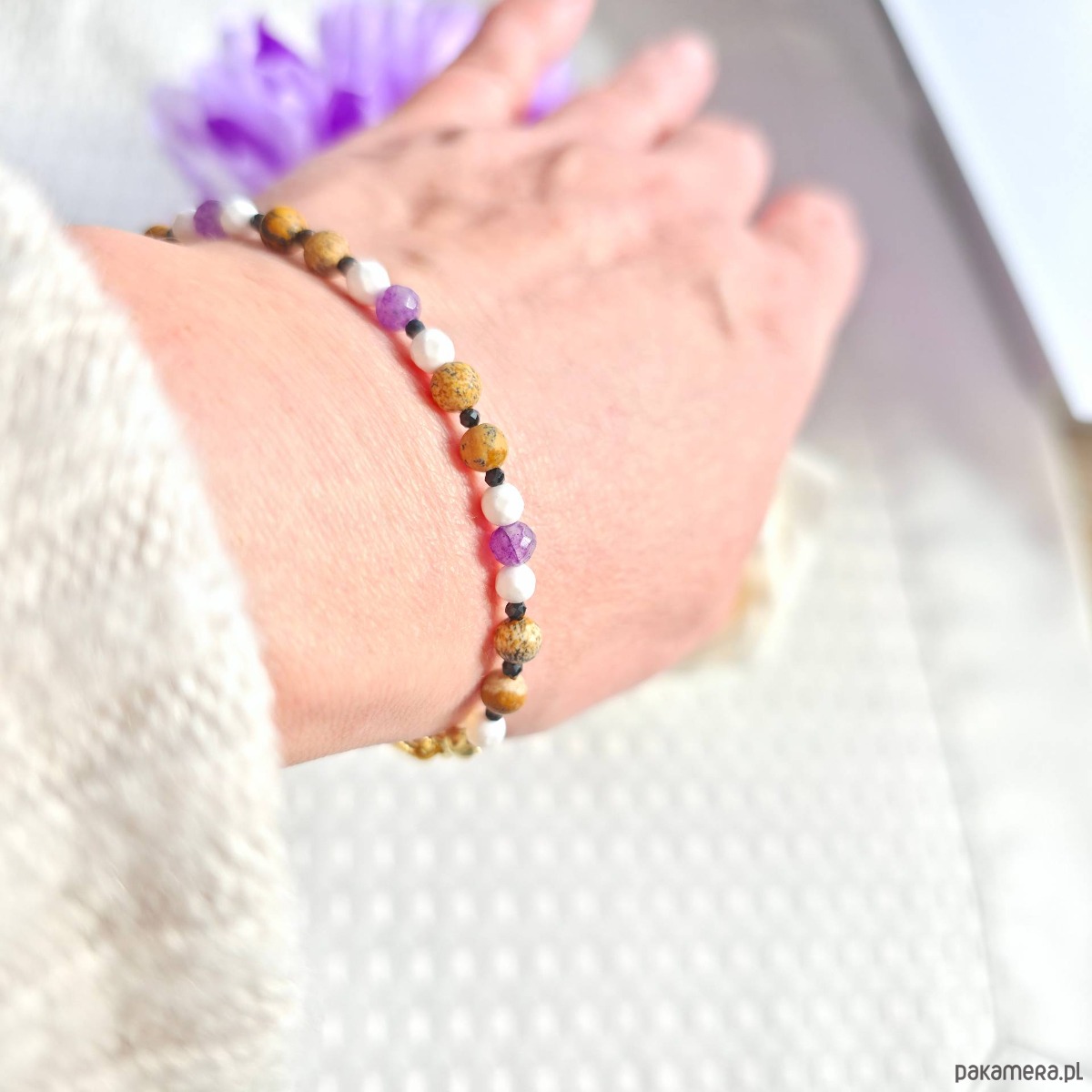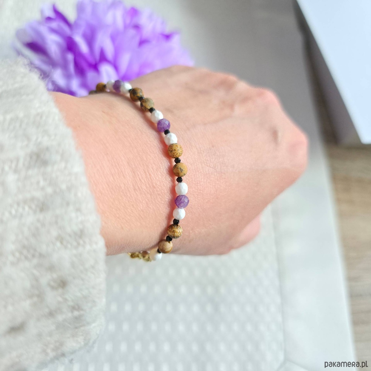 • Materiały : Agat biały 4 mm, Czarny turmalin 2 mm, Jadeit fioletowy 4,5 mm, Jaspis krajobrazowy 4 mm, żyłka wędkarską Fluorocarbon 0.35 mm, transparentna