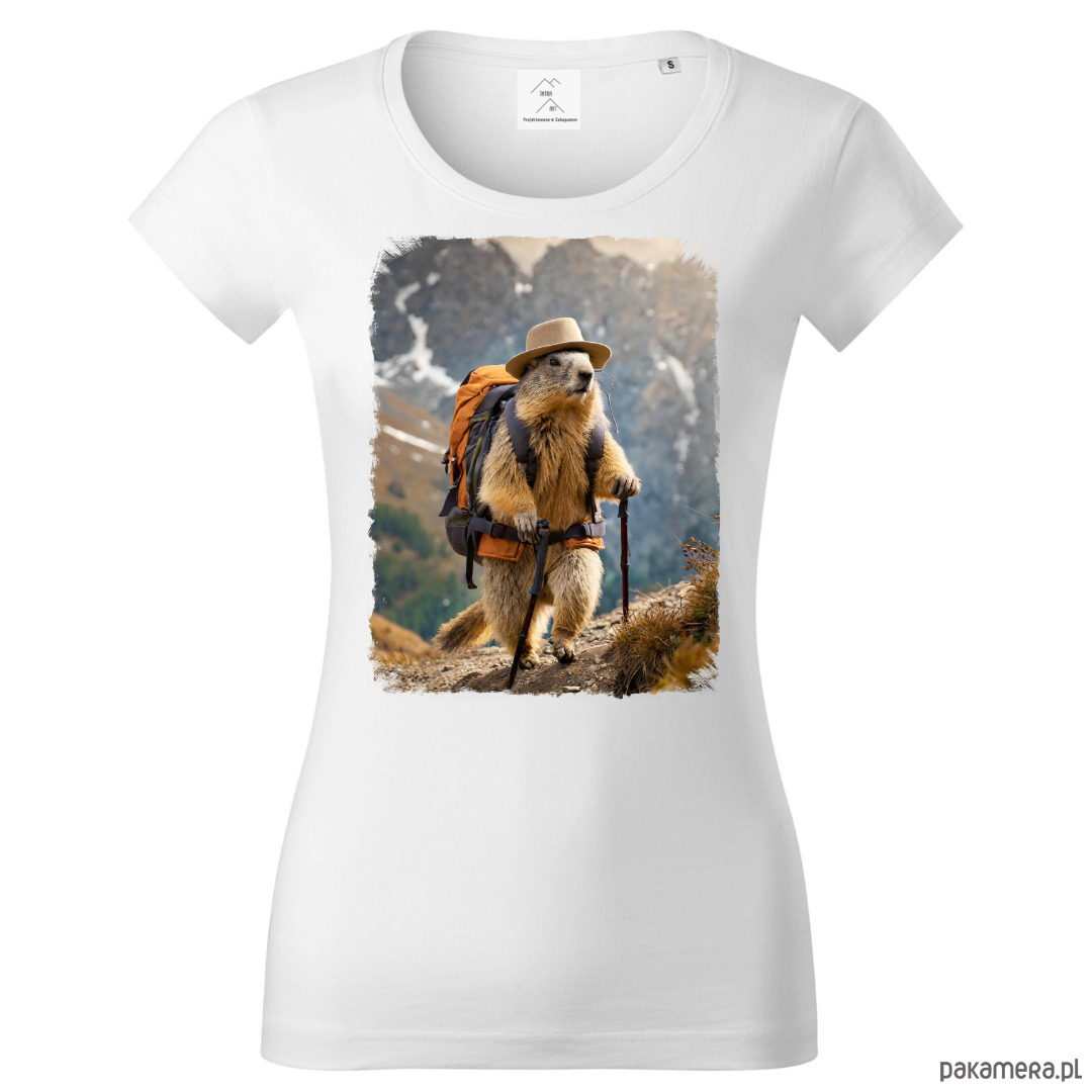 Tatra Art świstak na górskim szlaku z plecakiem w kapeluszu koszulka damska v4